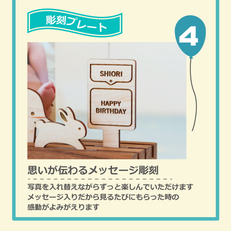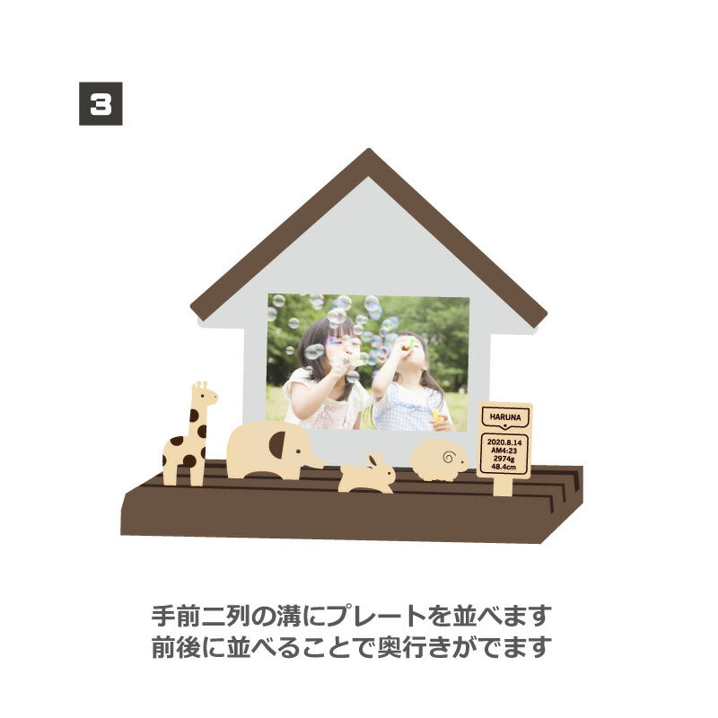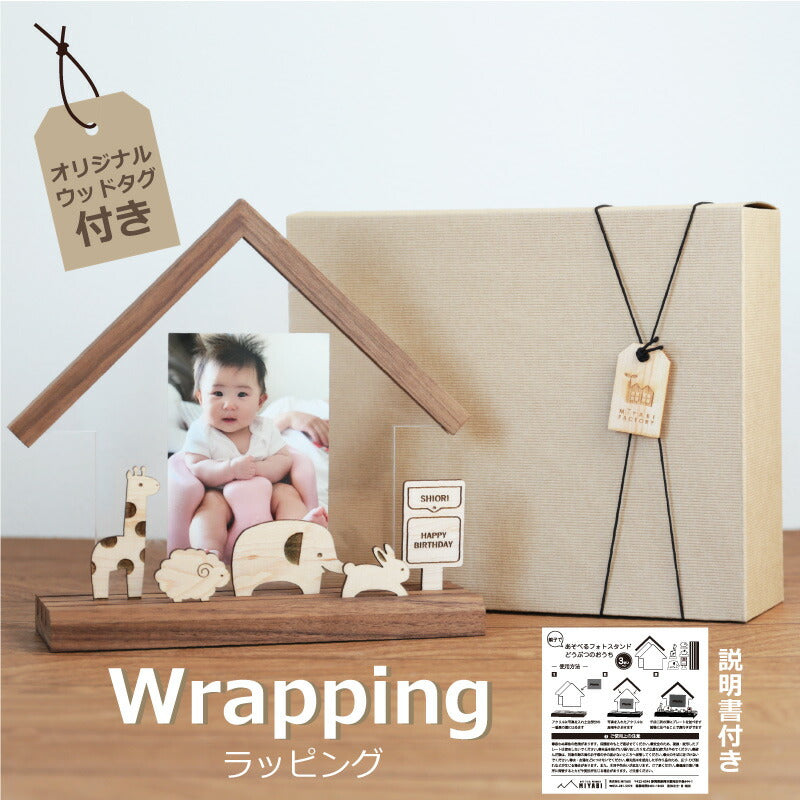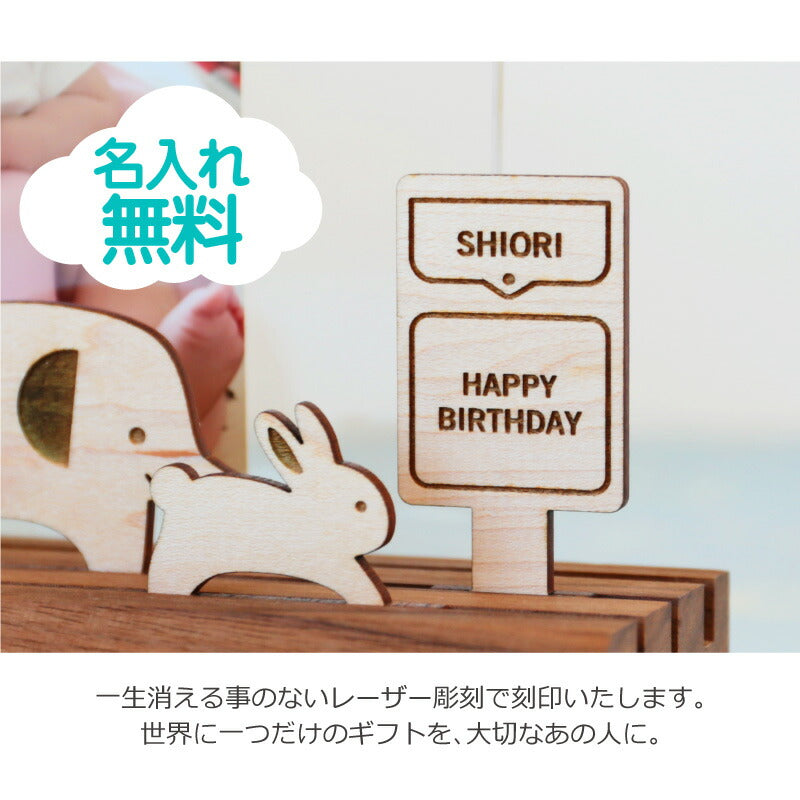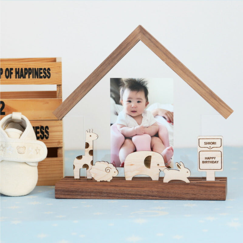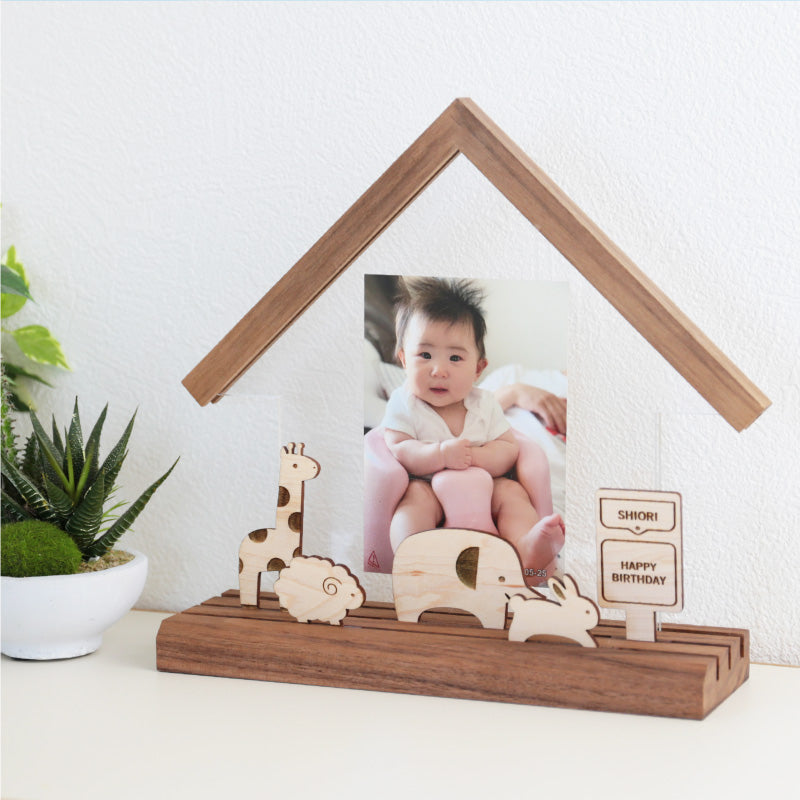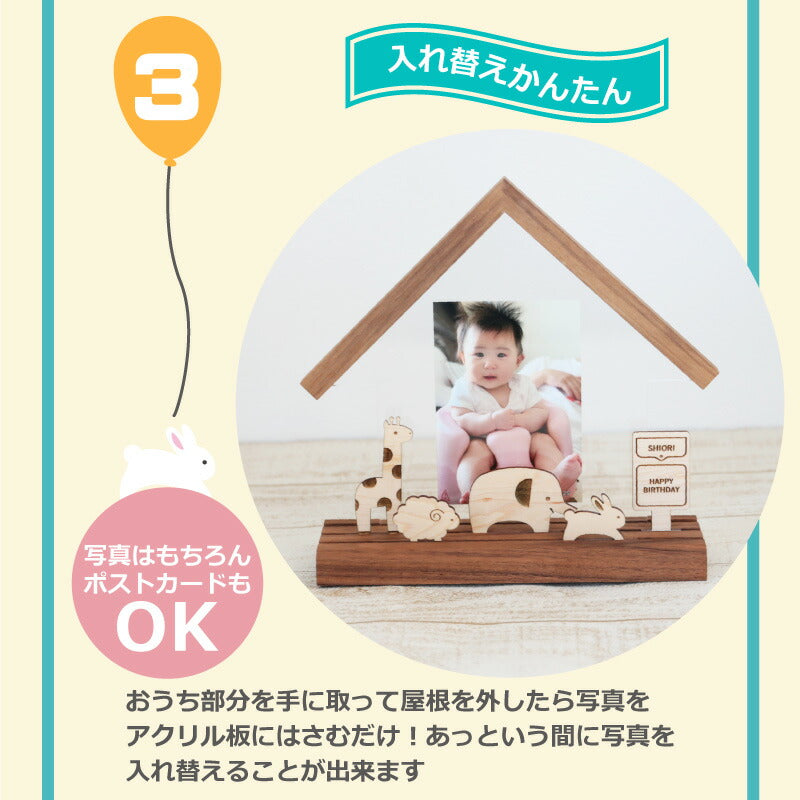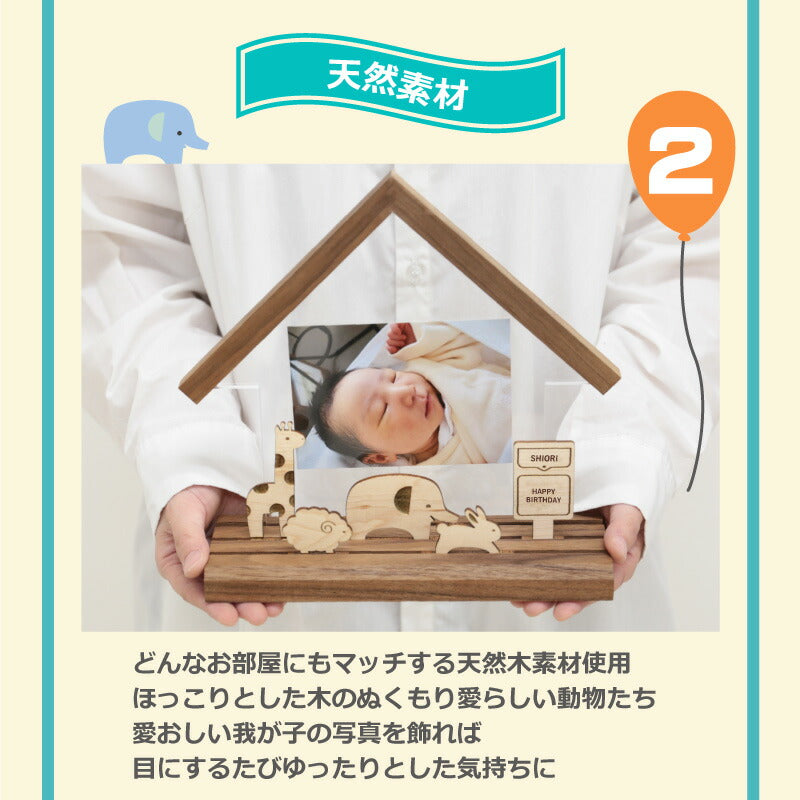 1. 遊べるデザイン ぞう うさぎ ひつじ きりん ・・・ 子供が大好きな動物たちが勢ぞろい! 動物たちのプレートは動かすことが出来るから、 子供たちも大好きなフォトフレームに。 ママもパパも、毎日目にするものだから、 おしゃれでかわいいデザインがうれしい。 家族みんなが笑顔になれる、 楽しいフォトスタンドです。 2. 天然素材 どんなお部屋にもマッチする天然木素材使用。 玄関 リビング キッチン 子供部屋 など 置く場所を選びません。 ほっこりとした木のぬくもり、愛らしい動物たち。 愛おしい我が子の写真を飾れば、目にするたびゆったりとした気持ちに。 子育てに慌ただしい毎日を送るママのちょっとした癒しになります♪ 3. 入替かんたん 忙しいお母さんでも大丈夫。 おうち部分を手に取って屋根を外したら、写真をアクリル板にはさむだけ。 あっという間に写真を入れ替えることが出来ます。 写真はもちろん、ポストカードもOK。 入れ替える時にもちょっとした安心。 ガラスより強度のあるアクリル板。 割れないから、ギフトにもぴったりです。 4. 彫刻プレート 思いが伝わるメッセージ彫刻。 ・THANK YOU ・HAPPY BIRTHDAY ・HAPPY ANNIVERSARY ・HAPPY MEMORIES 写真を入れ替えながらずっと楽しんでいただけます。 メッセージ入りだから、見るたびにもらった時の感動がよみがえります。 忙しい毎日にちょっとした親子のコミュニケーション。 かけがえのない大切なひとときになります。 専用の箱、オリジナルウッドタグ付き。 出産祝い 大切な記念日にふさわしく高級感のあるラッピングです。 出産祝いを急いで用意しなければならない時でも 届いてすぐにお渡しいただけますので安心です。 「 どうして名前入りが喜ばれるの? 」 自分の名前が入った商品は世界にただ一つだけ。 贈った人に大事に使ってほしい、想いが伝わります。 さらにお名前彫刻はずっと消えずに残るから、 永く愛着を持って使っていただけます。 だから、「名入れギフト」は大切な人に感謝の気持ちを伝えるのにぴったりなおくりもの。 私たちは、贈られた人も贈った人もみんなが笑顔になれる商品をお届けします。 [ こんなシーンにおすすめ ] ・ 百日祝 100日祝い 100日記念 の 写真 立て として ・ 1歳 一歳 ハーフバースデー お食い初め の 記念に ・ 七五三 卒園式 など 記念日 の 写真 を入れて |
