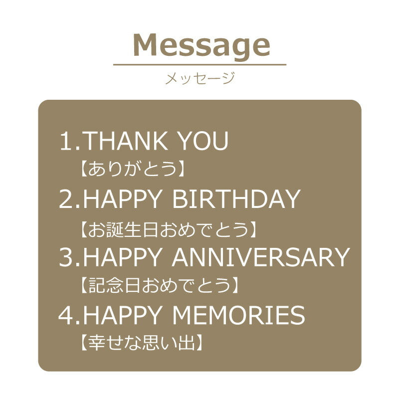 | 名入れ | 彫刻する文字は「入力欄」へご記入下さい。 【お名前】ローマ字※日本語不可 文字数は9文字までとさせていただきます。 ・上記以外は当店で変更します ・文字サイズは当店で調整します ・名入れ・メッセージを彫刻しない場合、プレートは付きません。 |