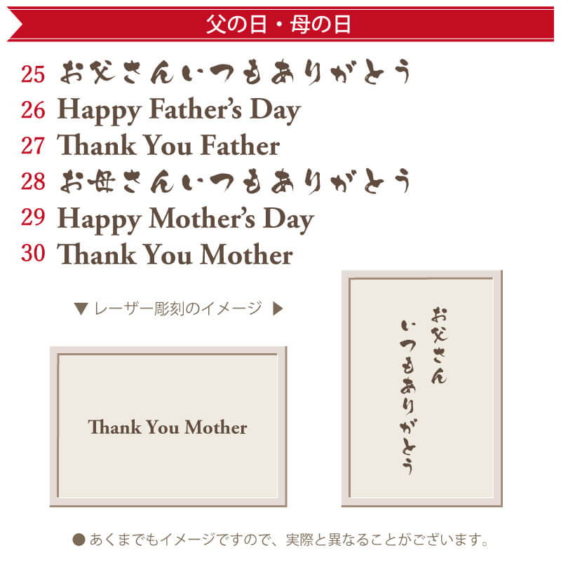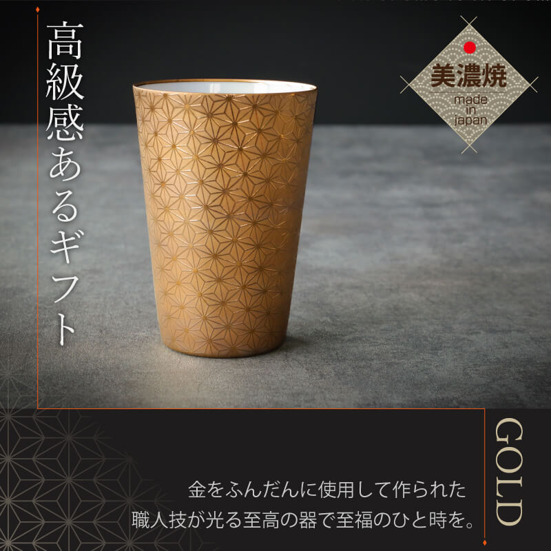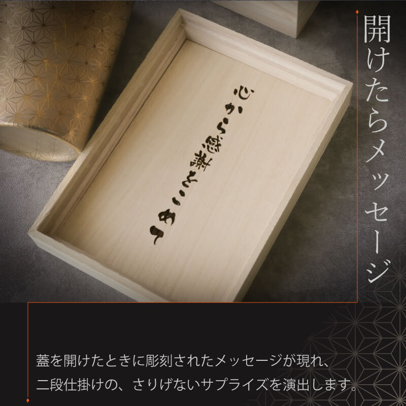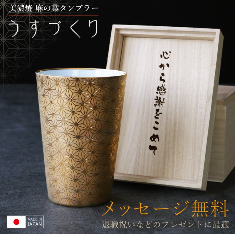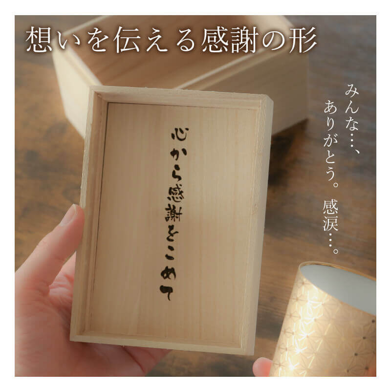 目上の方への 退職祝い や 長寿祝い に最適な、特別な感謝を伝える 高級 グラス 。蓋の裏面に選べる メッセージ を彫刻いたします。 メッセージ 無料 \ 2度驚く!ギフトにぴったりのタンブラー / お世話になったあの人へ。 いつも優しく見守ってくれるあの人へ。 感謝の気持ちを伝えるギフト、完成しました! - ギフト にぴったり。2つのおすすめポイント - 1. 職人の技が光る!金の タンブラー 金 をふんだんに使用し作られた タンブラー は、 職人の手で極限まで薄く作られており、 内側にライトをあてると光が透けて見えるほどなんです! 口元の薄さは約1ミリ、重さは約80gと、 軽くて美しい タンブラー なので、男女問わずお使いいただけます。 また、健康・魔除けの意味を持つ「麻の葉」の模様が入っているので、ずーっと長生きしてほしい、大切な方への 贈り物 にぴったりです。 2. 透かし彫りの蓋裏にお好きなメッセージを彫刻します タンブラーを入れる桐箱には美しい”透かし彫り”が施されています。 一生に一度のお祝いの品。 贈り物だけでなく、入れ物にもお祝いの気持ちが込められていることに、気づいていただけるのではないでしょうか。 選べるメッセージはなんと38種類! 贈るお相手にぴったりなものをお選びください。 1.ありがとう 2.いつもありがとう 3.感謝 4.おめでとう 5.心から感謝を込めて 6.いつまでも元気でいてください 7.これからもよろしくお願いします 8.御祝 9.御礼 10.内祝 11.祝 御結婚 12.結婚おめでとう 13.お誕生日おめでとう 14.寿 15.長寿 16.長生きしてね 17.祝 還暦 18.祝 古希 19.祝 喜寿 20.祝 傘寿 21.祝 米寿 22.祝 卒寿 23.祝 白寿 24.祝 百寿 25.お父さんいつもありがとう 26.Happy Father’s Day 27.Thank You Father 28.お母さんいつもありがとう 29.Happy Mother’s Day 30.Thank You Mother 31.おつかれさまでした 32.ありがとうございました 33.おめでとうございます 34.祝 ご勇退 35.祝 ご栄転 36.祝 ご退職 37.祝 金婚 38.祝 銀婚 ずっと消えない彫刻は、記念の贈り物として大変喜ばれています。 末永く、愛着を持ってお使いいただけることでしょう。 当店のメッセージ彫刻は専門のスタッフがこだわりと自信をもって行っていますので、1文字1文字つぶれることなく鮮明に刻印され、ずっと消えずに残ります。 お客様の気持ちのこもったギフトを永く愛着を持ってお使いいただけますように。 それが、私たち名入れギフトOkuluスタッフ全員の願いです。 ≪こんなシーンにおすすめ≫ 男性 にはもちろん 女性 にも お酒 や お茶 を飲む際のお供に… バレンタイン クリスマスプレゼント 父の日 母の日 敬老の日 バースデープレゼント 退職祝い 定年退職 に 上司 同僚 への 記念品 として。 お父さん 旦那さん 彼氏 友達 に 誕生日プレゼント などの 記念日 に。 40代 50代 の方への お祝い として 60代 70代 90代 100歳 の方 に 長生きしてほしいという思いを込めて 還暦 古希 喜寿 傘寿 米寿 卒寿 白寿 百寿 などの 長寿祝い として |