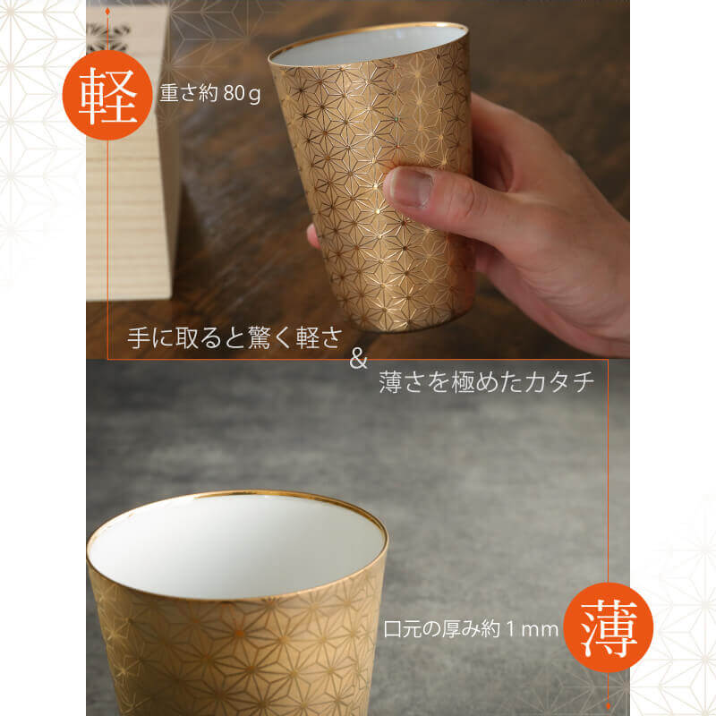 | サイズ | タンブラー:直径約7.9cm/高さ11.5cm 重量:約80g 容量:370ml 透かし彫木箱:縦15.3cm/横10.8cm/高さ10cm 保護箱寸:縦16.5cm/横12cm/高さ10.3cm 重量: 300g |