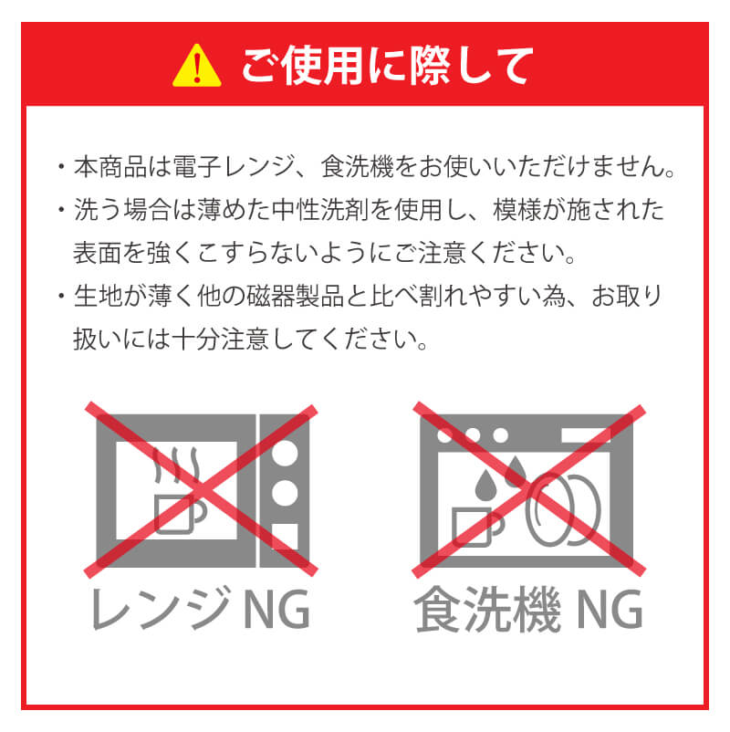 | 注意事項 | ※生地が薄く他の磁器製品と比べ割れやすい為、お取り扱いには十分注意してください。 |