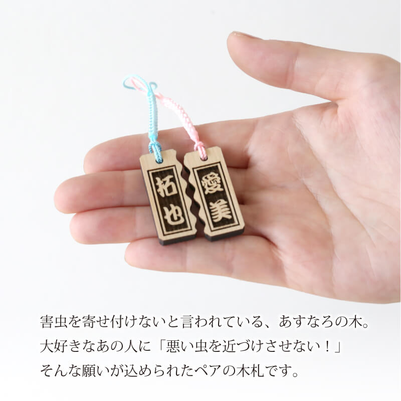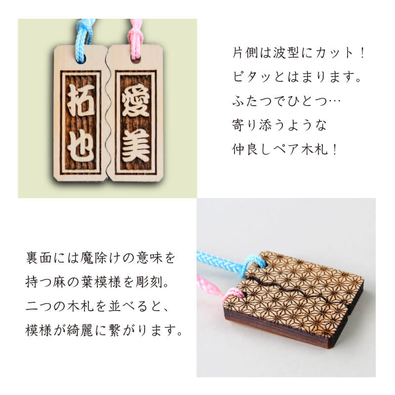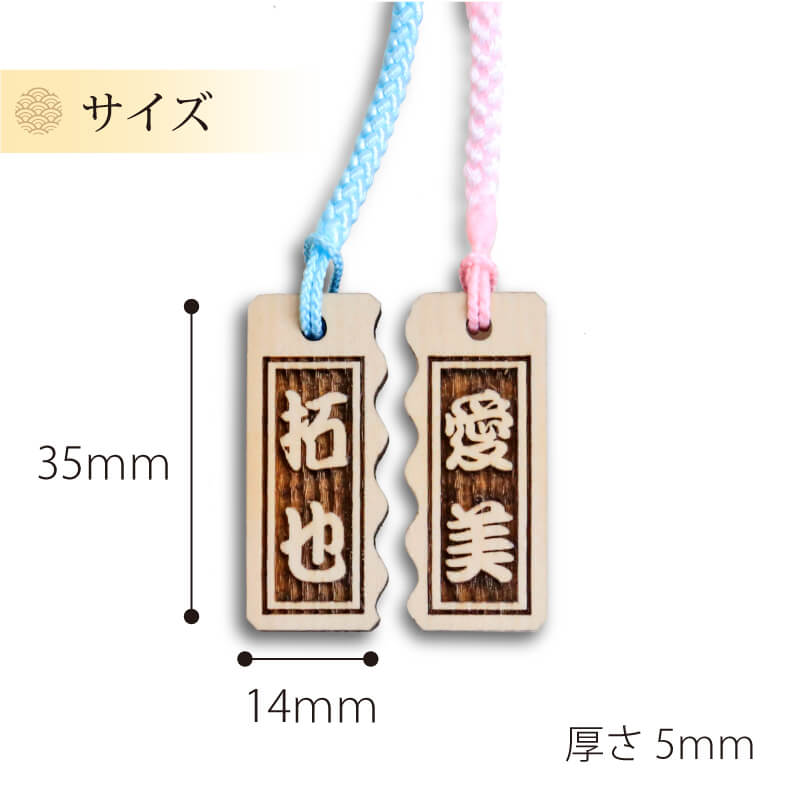 日本の伝統・文化を受け継いだ木札。 縁起物として古くからさまざまな用途に使われました。 あなたにきっとご利益あるかも♪ 大切な人への贈り物にも最適です! 1. 日本の伝統文化 木札の由来 木札は、日本人の暮らしの中で様々な場面に用いられていました。 その中でも、木札が縁起物とよばれるようになった理由には 以下のような由来があります。 一つ目は、江戸火消しの「消し札」。 「火事と喧嘩は江戸の華」と言われるほど江戸時代は火事が多く、 町火消しが火事を防いだ際に、組名が記された札を消し口に掲げていました。 以来、木札は火難、災厄を逃れる縁起物として今に伝わっています。 二つ目は、神社やお寺でも販売されている「身代わり札」。 名前が刻まれた木札は、その人の分身。 札が割れた際はお札が身代わりとなって守ってくれたという伝承が残っており、 古来よりお守りとして使われていました。 三つ目は、願い事を叶える「納札」。 お寺や神社を参拝する人が、祈願成就のために名前や出身地を書いて納める札のことで、 千社札とも呼ばれています。 現在は紙のものが一般的ですが、昔は木札を納めていました。 どれも古くからの日本文化を感じられる由来となっておりますが、 現在ではおしゃれ感覚で身につける人も多く見られます。 キーホルダーやストラップのほか、 名札やボトルキープ用のネームタグなど、様々な用途で使われています。 男女年齢問わず、プレゼントにもおすすめのアイテムです。 2. こだわりの木材 当店で作る木札は全て自社製! 素材にこだわり、職人が一つ一つ丁寧に仕上げました。 温かみのある手触りとやさしい木の香りが、安らぎをもたらします。 また自然木は、時間が経つほどに風合いなどの深みが増していくので、 永く愛着を持ってお使いいただけます。 大切な思い出と共に経年変化を楽しめる逸品です。 ヒバ ヒバの別称は「翌檜(あすなろ)」。これは「あすはヒノキになろう」という言葉が由来と言われています。 決してヒノキより劣っているということではなく、防虫防腐防ダニ効果があるヒノキチオールの量は、 なんとヒノキの約10倍も含まれています!防蟻性にも優れ、気品が感じられる木材です。 3. 名前彫刻 当店自慢の技術で一つ一つ心を込めてお名前を刻みます。 名入れ専門店である当店の確かな技術力で細部までしっかりと彫刻! 自分の名前が入った木札は世界で一つの特別な逸品。 大切な家族や友人へのプレゼントとして贈れば、 喜ばれること間違いありません。 - 裏面彫刻 - 裏面には麻の葉模様が入ります。 麻は成長が早く真っすぐ伸びることから、子どもの健やかな成長を願う文様です。 また、邪気を払うなど魔除けの意味も込められており、縁起のよい文様として親しまれてきました。 ≪こんなシーンにおすすめ≫ ・ 友達への 誕生日プレゼント に ・ 神輿 や 縁日 花火大会 に ・ 家族 やチーム・仲間同士でお揃いに ・ 父の日 敬老の日 のプレゼントに ・ 還暦 古希 喜寿 傘寿 米寿 卒寿 白寿 百寿 などの長寿のお祝いに ・ お子様のバッグや通学カバンに着けて名札代わりに ・ 卒業 卒団 卒部 などの 記念品 に ・ 創立記念 周年記念 のプチギフトに |