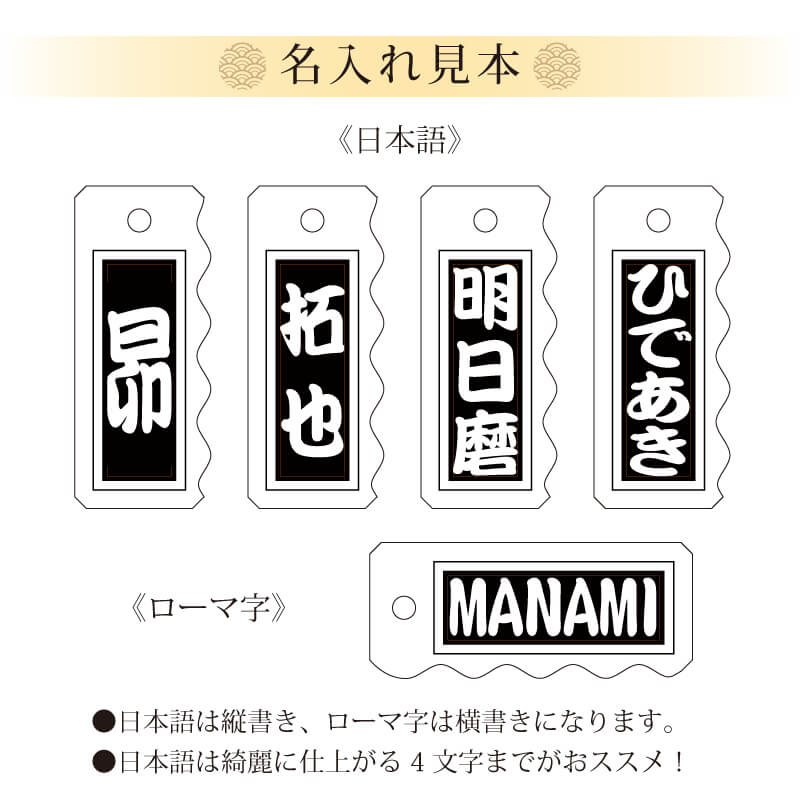 彫刻する文字は「入力欄」へご記入下さい。 【お名前】ローマ字のみ ※日本語不可 文字数は【日本語】5文字まで【ローマ字】10文字までとさせていただきます。 ・上記以外は当店で変更します ・文字サイズは当店で調整します |