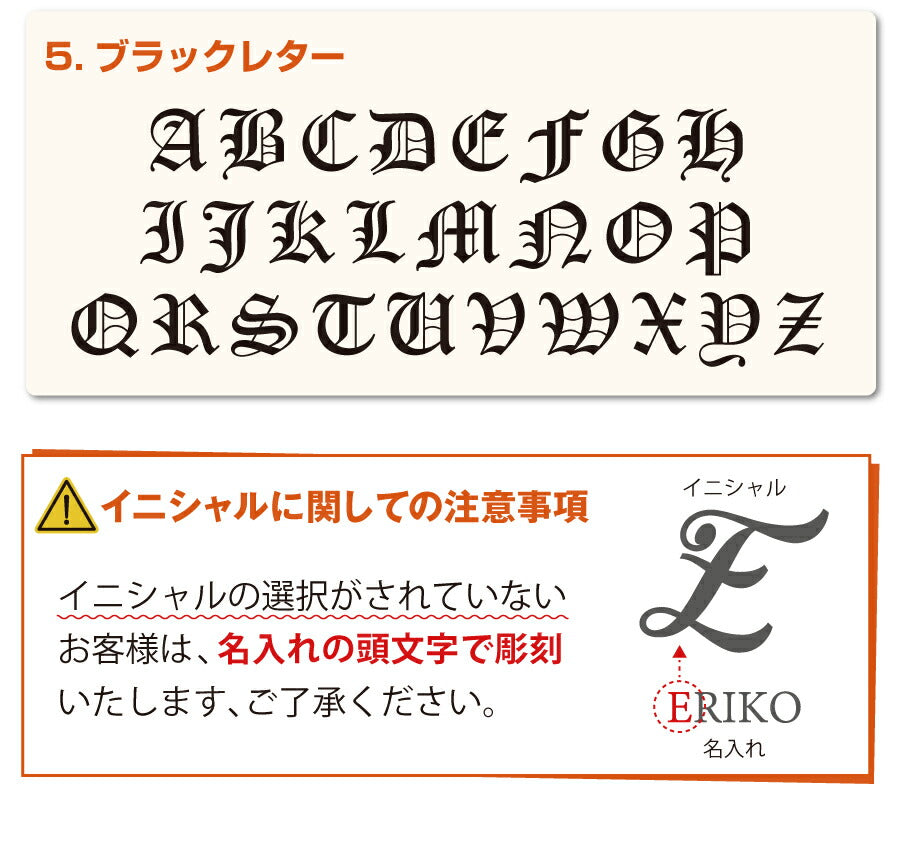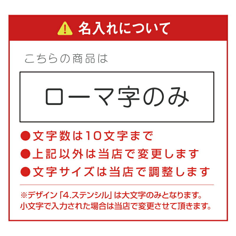 彫刻する文字は「入力欄」へご記入下さい。 【お名前】ローマ字※日本語不可 文字数は10文字までとさせていただきます。 ・上記以外は当店で変更します ・文字サイズは当店で調整します |