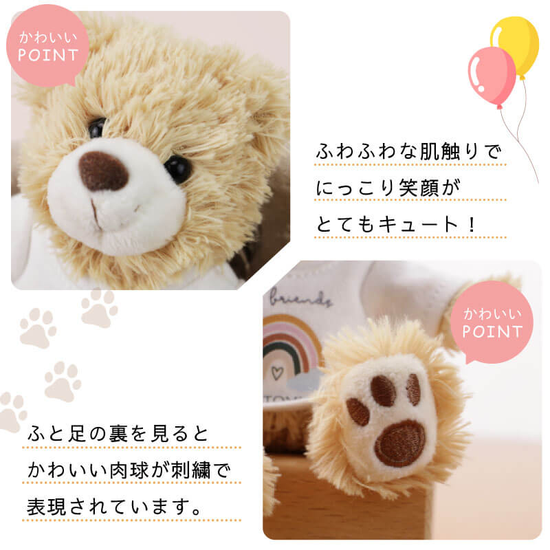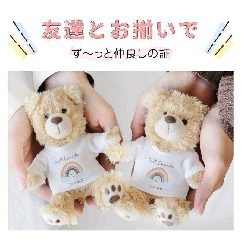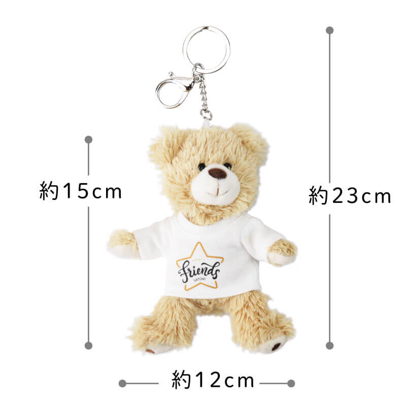 キーホルダー サイズの かわいい テディベア と一緒にお出掛け! くま ちゃんの着ている Tシャツ には 当店オリジナルのデザイン&メッセージ入り。 友達とおそろいにしても◎ 仲良し度UP!ず〜っと仲良しの証に♪ - おすすめポイントは4つ! - 1. どこでも持ち歩けるキーホルダー ベア 世界中で愛され続けているテディベア。 子どもから大人まで魅了してやまない愛くるしい姿は、 ずっと見ていても飽きることはありません。 「もっと気軽に持ち歩きたい!」 そんな方に おすすめ なのが キーリング タイプ! 持ち運びもお手軽で、とっても かわいい サイズ感だから どこでも一緒にお出掛けできる♪ 鞄やリュックにつけて、通学や通勤、旅行のお供に最適です! 2. 癒しの手触り 思わずギュッと握りしめたくなる心地よさ! ふわふわモコモコ、極上の手触りが 心を優しく癒してくれるから、 いつも傍で寄り添ってくれる存在に♪ 愛くるしいお顔とふわっとした佇まいの くまの ぬいぐるみ 。 さらにTシャツにはメッセージと自分の名前入り。 目にする度に手にした時の感動がよみがえり、気持ちが明るくなれる。 だから、何度も嬉しくなる ギフト なんです。 3. 全12通りのデザイン&メッセージ くまちゃんの着ているTシャツには、 デザインとメッセージのプリントをお入れします。 当店だけの完全オリジナルデザインでお作りするので 世界でひとつの Tシャツベア が完成! さらに、贈るシーンに合わせたメッセージもお選びいただけます。 相手にピッタリのデザイン&メッセージを お選びください。 ≪デザイン3種類≫ ・ バルーン ・ スター ・ レインボー ≪メッセージ4種類≫ ・ HappyBirthday ・ BestFriends ・ HappyAnniversary ・ Congratulations! 組み合わせは全部で12通り! きっとあなたの想いが伝わる組合せがみつかります♪ 4. 名入れプリント 贈る相手のお名前をプリントすることで、さらに特別感がup! まるで自分の分身のような存在に♪ 愛着を持ってお使いいただけます。 「 どうして名前入りが喜ばれるの? 」 生まれた時からずっと一緒に生きてきた「名前」。 普段あまりにも身近にあるので、自分の名前のことを深く考える機会はありませんが 贈られた商品に自分の名前が刻まれていたらいかがでしょう。 その瞬間、“プレゼント”は“自分だけの大切なもの”へと変化します。 そして贈ってくれた方の真心を感じ、自然に笑顔がこぼれるのではないでしょうか。 名前はその人にとって唯一無二、かけがえのないものです。 私たちはそのお名前を大切に、贈る人、贈られる人、両方の笑顔を想いながら商品を送り出しています。 当店のお名前彫刻は専門のスタッフがこだわりと自信をもって行っていますので、 1文字1文字つぶれることなく鮮明に刺繍され、ずっと消えずに残ります。 お客様の気持ちのこもったギフトを永く愛着を持ってお使いいただけますように。 それが、私たち名入れギフトOkuluスタッフ全員の願いです。 ≪ こんなシーンにおすすめ ≫ ・ 10代 20代 30代 40代 50代 60代 女性に ・ 友達の 誕生日プレゼント に ・ 小学生 中学生 高校生 の女の子に ・ 通学鞄 リュック バッグ につける マスコット に ・ 入学祝い 卒業祝い の 記念品 に ・ 部活 クラブ を 卒業 引退する 部員 への 卒団記念品 に ・ 彼女 奥さん 恋人 への 記念日 の プレゼント に |