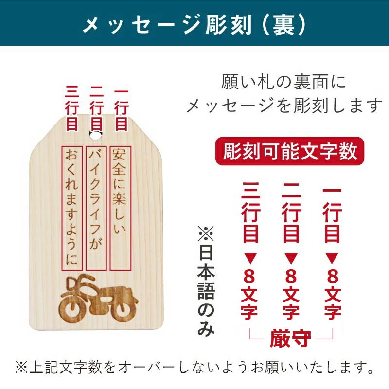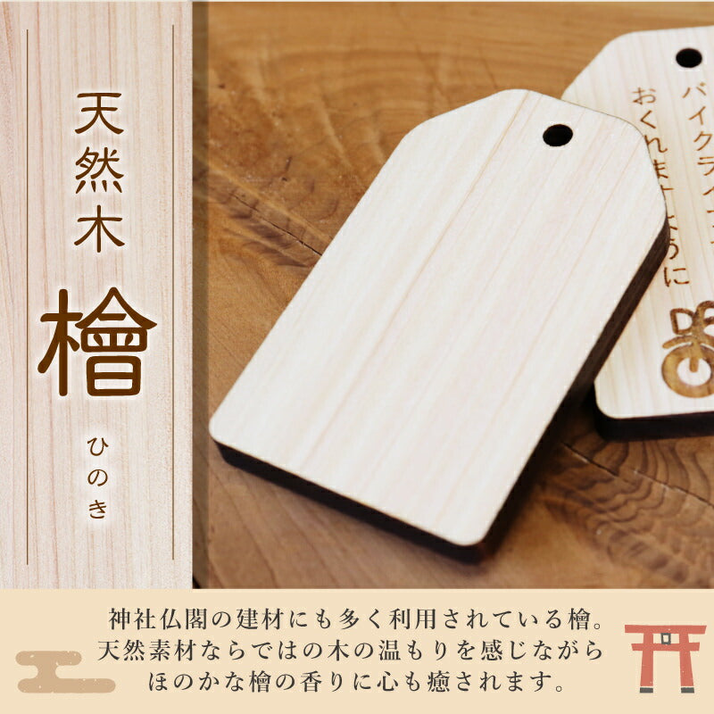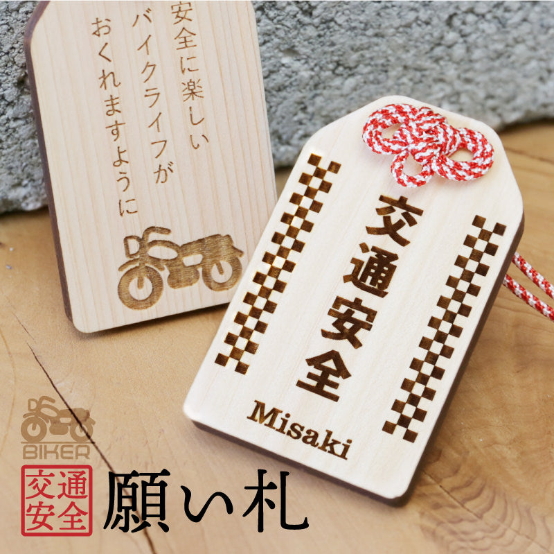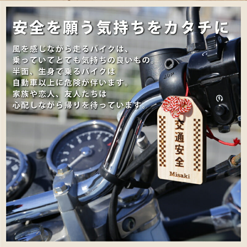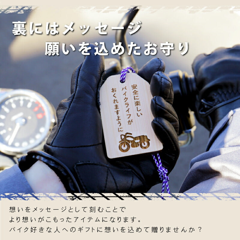 \ 安全を願う気持ちをカタチにして / 普段は言えない感謝の気持ちや、 安全を願う気持ちをカタチにして贈りましょう。 想いを込めたオリジナル木札。バッグや鍵などにつけておけば 「待っていてくれる人がいる」安全運転を心掛けることでしょう。 いつもは恥ずかしくて口にできないことも 「まごころ願い札」で伝えることができます。 幸運が訪れますように、願いが叶いますようにと 相手を想う気持ちを込めた願い札。 真心のこもった贈り物。きっと喜んでもらえることでしょう。 当店専属デザイナーによる完全オリジナル。 祈願文字にバイカー専用の絵柄を合わせました。 【 交通安全 】 近年増加しているバイク人口。 風を感じながら走るバイクは、乗っていてとても気持ちの良いもの。 半面、生身で乗るバイクは自動車以上に危険が伴います。 家族や恋人、友人たちは心配しながら帰りを待っています。 急いでいても、バイクにつけた「交通安全 願い札」を見るたびに 無事に帰ろうとスロットルを戻すことでしょう。 【オリジナルデザイン】 バイクといえば男性のイメージが強いですが 近年では女性ライダーも増加しています。 実際にバイクに乗っている女性スタッフが 男性でも女性でも持てるような デザインを考えました。 【 裏面フリーメッセージ彫刻 】 木札の裏面にはお好きなメッセージを彫刻することが可能です。 一行8文字×3行までならどんなメッセージでもOK。 彫刻なのでずっと消えることなく残しておくことができます。 贈る方のことを想い、幸せを願う気持ちを込めた世界で一つだけの願い札は きっとどんなお守りにも勝るでしょう。 お守りは1年で、または願いがかなったら返納するとされていますが、 思いのこもった願い札はずっと持っていても大丈夫。 見るたび、手にするたび、何度でもあなたのことを思い出し、 いつでも近くに感じてもらうことができるでしょう。 |