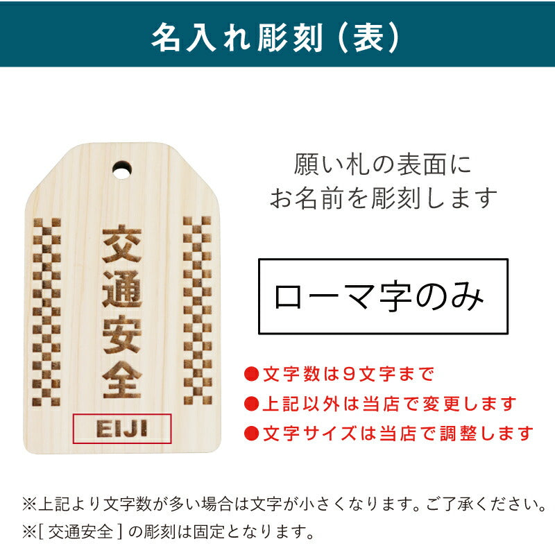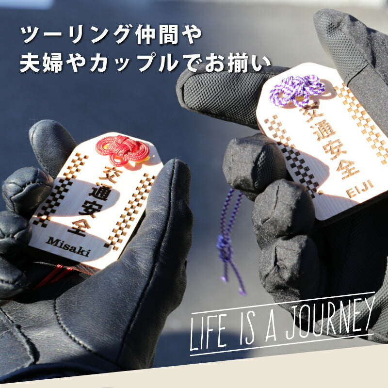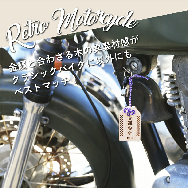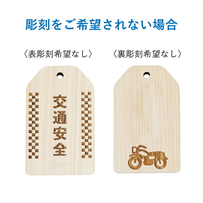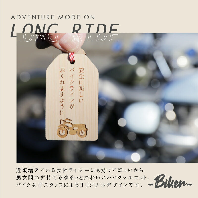 \ 安全を願う気持ちをカタチにして / 普段は言えない感謝の気持ちや、 安全を願う気持ちをカタチにして贈りましょう。 想いを込めたオリジナル木札。バッグや鍵などにつけておけば 「待っていてくれる人がいる」安全運転を心掛けることでしょう。 いつもは恥ずかしくて口にできないことも 「まごころ願い札」で伝えることができます。 幸運が訪れますように、願いが叶いますようにと 相手を想う気持ちを込めた願い札。 真心のこもった贈り物。きっと喜んでもらえることでしょう。 当店専属デザイナーによる完全オリジナル。 祈願文字にバイカー専用の絵柄を合わせました。 【 交通安全 】 近年増加しているバイク人口。 風を感じながら走るバイクは、乗っていてとても気持ちの良いもの。 半面、生身で乗るバイクは自動車以上に危険が伴います。 家族や恋人、友人たちは心配しながら帰りを待っています。 急いでいても、バイクにつけた「交通安全 願い札」を見るたびに 無事に帰ろうとスロットルを戻すことでしょう。 【オリジナルデザイン】 バイクといえば男性のイメージが強いですが 近年では女性ライダーも増加しています。 実際にバイクに乗っている女性スタッフが 男性でも女性でも持てるような デザインを考えました。 【 裏面フリーメッセージ彫刻 】 木札の裏面にはお好きなメッセージを彫刻することが可能です。 一行8文字×3行までならどんなメッセージでもOK。 彫刻なのでずっと消えることなく残しておくことができます。 贈る方のことを想い、幸せを願う気持ちを込めた世界で一つだけの願い札は きっとどんなお守りにも勝るでしょう。 お守りは1年で、または願いがかなったら返納するとされていますが、 思いのこもった願い札はずっと持っていても大丈夫。 見るたび、手にするたび、何度でもあなたのことを思い出し、 いつでも近くに感じてもらうことができるでしょう。 |