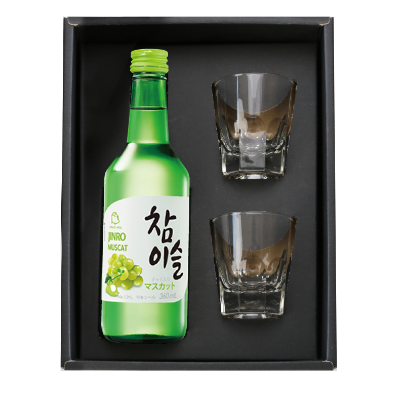 | \ 準備が出来たらチャンチャンチャン♪ / 韓ドラペンの心くすぐるペアセット 韓国ドラマと言ったらやっぱりこれ! チャミスルなしでは始まらない。 今夜は泣いて語って飲み明かそう。 お友達との韓ドラ鑑賞にもってこいの チャミスルペアセットです。 1) 韓国でも根強い人気!国民的銘酒チャミスル 韓国ドラ好き ならこの緑の瓶を知らない人はいないはず。 韓国ドラマや映画では、必ずと言っていいほど出てくる食事のシーン。 そのシーンでもほぼ確実に登場するのが、このチャミスルです。 時にはストーリーにおいて重要な役割を果たすことも。 チャミスルは、韓国全土でシェア率なんと52.4%! 圧倒的支持率でナンバーワンの人気を誇る 韓国焼酎( ソジュ )です。 - 韓国焼酎(ソジュ)とは - 焼酎と聞いて真っ先に想像するのは、 芋や米など、独特の匂いと風味のあるお酒かと思います。 ですが、韓国の焼酎は「稀釈式焼酎」と呼ばれているものがほとんど。 日本では「甲類焼酎」と言われているものです。 何度も蒸留を繰り返すことでアルコール濃度を高め、不純物を取り除きます。 これに加水したものが製品となります。 無色透明でクセのない味わいだから、 ロックや水割りのほかに、レモンサワーやお茶割、 ジュース割までアレンジはさまざま。 自分好みの飲み方を楽しめる、自由度の高さが魅力です。 - チャミスルの人気の秘訣 - チャミスルは、"天然竹炭"を使って精製されたお酒です。 ろ過を4回も繰り返すことで極限まで不純物を取り除き 「すっきりと澄んだ味わい」と、「まろやかな後味」に仕上げました。 透きとおったグリーンの瓶からも、 清らかな竹や笹の葉をイメージさせられますね。 チャミスルは、こうした製造者の努力と情熱のもとで生まれました。 そんな造り手の想いが伝わるからこそ、 老若男女問わず、深く愛されているのです。 いまや「国民の酒」と言っていいほど韓国人にとってなじみ深い銘酒。 今後、日本でも韓流ブームと共に人気が高まっていくかもしれませんね。 韓国ドラマファン や K-POP 好きなら一度は味わってほしいお酒です。 2) 選べる4種のフレーバー チャミスルは豊かなラインナップが魅力。 スタンダードなフレッシュをはじめとして、 アルコール度数を落としたフレーバータイプも取り揃えております。 ≪すっきりフルーティーな4種のフレーバー≫ ・フレッシュ 口に含んだ瞬間、鼻へ抜けるような爽やかさ。 すっきりとしたキレイな味わいです。 クセのない後味だから、食後酒にもピッタリ。 焼肉やキムチなど、辛くて味が濃いものが多い韓国料理との相性もいいお酒です。 ・マスカット みずみずしくて爽やかに香るマスカット。 まるでジュースのような優しい甘さだから お酒が苦手な方でもするするいけちゃいます。 ・ストロベリー ほのかに香るイチゴシロップのような懐かしい甘い匂い。 甘酸っぱさが口の中に広がる優しい味わいです。 甘いお酒が好きな方にぴったりです。 ・グレープフルーツ 甘酸っぱさの中に、グレープフルーツ特有のほろ苦さがあって さっぱりとした口当たりです。 お酒は得意じゃないけれど、甘いだけでは物足りない という方には、このフレーバーがおすすめです。 チャミスルを美味しく飲むコツは、とにかくキンキンに冷やすこと! ストレートで飲むのが主流ですが、 フレーバータイプなら、ソーダ割でさっぱりと飲むのも◎。 ストレートでは甘すぎる、と感じる方も飲みやすくなりますよ。 この飲みやすさが若い女性からの人気が高い理由。 お酒はたくさん飲めないけれど、韓ドラの雰囲気を楽しみたい、 という方でも美味しく味わっていただけるはず。 フルーツ焼酎 は未体験だという方もぜひ一度お試しください。 3) メッセージ・名入れ 彫刻 チャミスルといえば、ショットグラス でキュッといくのが王道スタイル。 こちらのギフトセットには、グラスをペアでお付けしました。 さらに、グラスにはレーザー彫刻で メッセージと名前の刻印をいたします。 ≪ フレーズ4種 ≫ 韓ドラペンも胸熱なフレーズを4つ集めてみました。 一度は耳にしたことあるかも? ポップでかわいいフレーズにテンションもUP♪ ・チャンチャンチャン 乾杯でグラスを合わせる音 ・ウリ・チャナジャ! 「乾杯しよー!」 ・マショラ・マショラ 「呑め呑め」 ・オヌルド・スリ・タルダ 「今日も酒が甘い」 ≪ お名前彫刻 ≫ フレーズの下には、贈る相手のお名前を刻印いたします。 当店自慢のレーザー加工による名入れサービスは、 職人の手でひとつひとつ丁寧に施しております。 彫刻したお名前は消える事がございませんので、 贈り物として大変喜ばれます。 「 どうして名前入りが喜ばれるの? 」 自分の名前が入った商品は世界にただ一つだけ。 贈った人に大事に使ってほしい、想いが伝わります。 さらにお名前彫刻はずっと消えずに残るから、永く愛着を持って使っていただけます。 だから、「名入れギフト」は大切な人に感謝の気持
