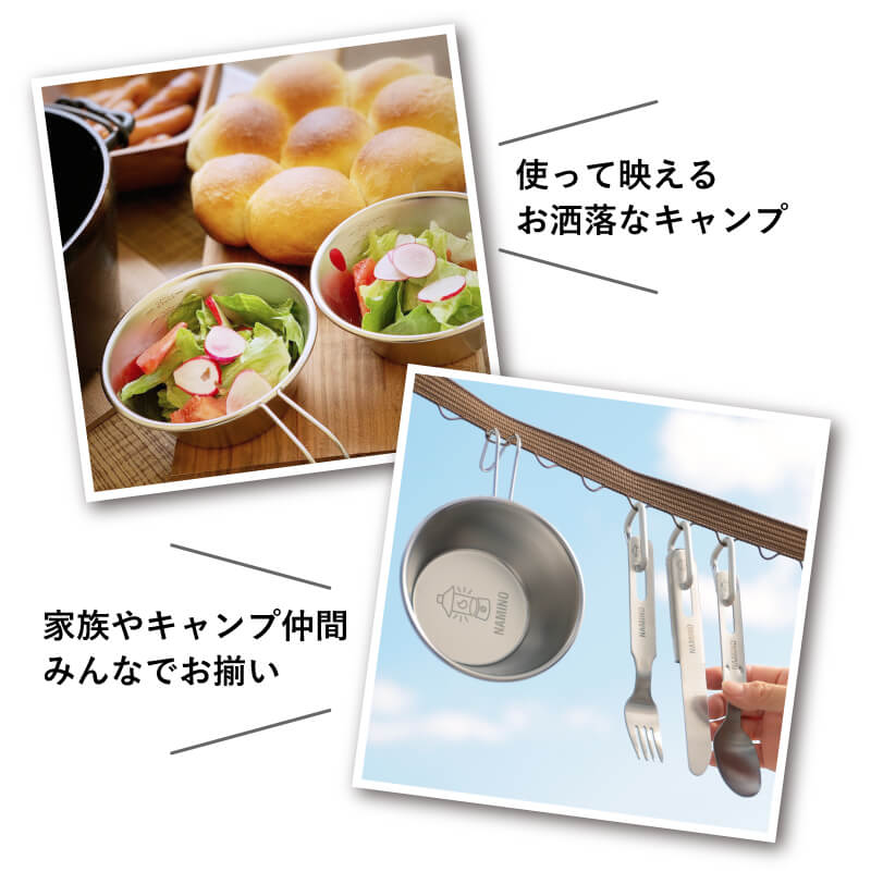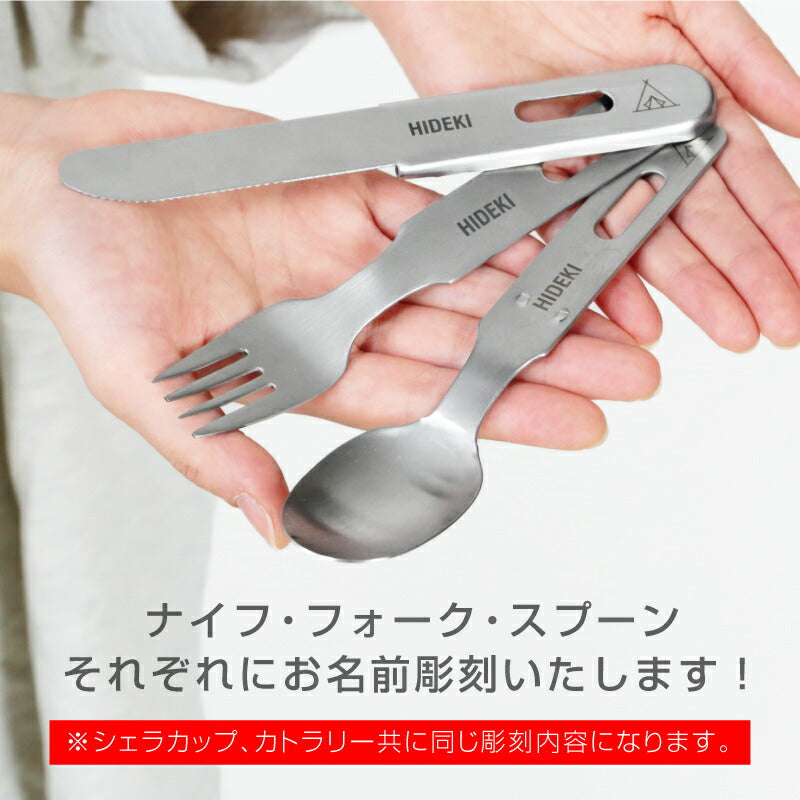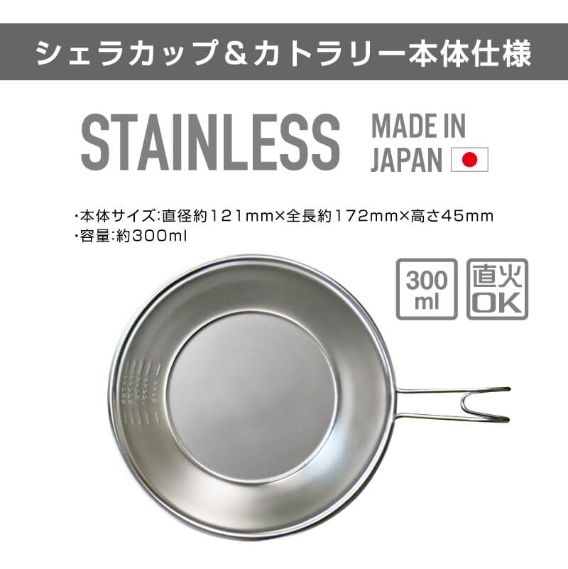 | サイズ | 【シェラカップ】 直径121mm全長約172mm高さ45mm 容量:300ml 【カトラリーセット】 ナイフ:16.4cm フォーク:15.8cm スプーン:16cm |