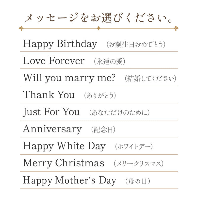 女性に喜ばれる 人気 のプレゼント、 花とアクセサリーのコラボレーションです。 全ての女性を魅了する輝きで、 記念日をロマンチックに演出します。 1. プリザーブドローズの女王「アモローサ- AMOROSA -」 稀少な天然ダイヤモンド入りのラメを花びらにまとい、 光を舞い散らせ輝く姿は、誰もが魅了される美しさ。 しっとりとした質感と、ベルベットのような光沢。 究極の美を追求した、最高級のプリザーブドローズです。 スペイン語で“愛”を意味する「アモローサ」。 専用の薔薇園で育成された バラ の中から、 色・形・大きさなどをチェック。 厳しい品質検査を受けて、基準をクリアした、 ほんの一握りの 薔薇 だけが、「アモローサ」と呼ばれているのです。 鮮やかで発色の良い 赤 色が伝える想いは、 「情熱」・「あなたを愛します」。 また、一輪の薔薇には「あなたしかいない」という意味もあるので、 恋人への 告白 プロポーズ に最適。 贈った後も、インテリアとして飾っていただけるので、 日常に彩りを添えてくれることでしょう。 当店では正規の日本総代理店から仕入れた、“本物”のみを取り扱っています。 アモローサの正規商品であることを証明する 「ギャランティーカード」をお付けしております。 驚きと感動をその目でお確かめください。 2. 二人の絆を繋ぐペアネックレス「LoveRingネックレス」 カップルなら一度は憧れる、おそろいのアクセサリー。 ペアデザインのネックレスをジュエリーケースに入れて、 2人だけの忘れられない思い出と共にお届けします。 永遠の絆を表す ダブルリング のペンダントトップ。 2連 リングのうち、片方はカラーが施されており、 女性にはエレガントなピンクゴールド 男性にはシックで落ち着いたブラック ペアといっても全く同じではなく、 それぞれ色違いになっている、おしゃれなデザインです。 シルバーリングには「永遠の愛」を意味する「amore eterno」の刻印入り。 ラインストーンが一粒装飾されており、煌めくアクセントになっています。 シンプル で付ける人を選ばない、 上品な雰囲気のあるネックレスなので、 カジュアル フォーマル どんなシーンでもお使いいただけます。 ステンレス 製だから、錆びにくく、汚れにくい。 メンテナンスも必要ないので、気兼ねなく身に着けることが出来て普段使いにピッタリです。 直接身に着けるものだから、 金属アレルギー に対する不安も。 こちらはステンレス316を使用。 金属アレルギーに強い素材です。 離れていても心を繋ぐ、 2人だけのお守りのような ペアアクセサリー です。 3. お名前・日付・メッセージ彫刻 プリザーブドローズを保護するアクリルプレートには、 贈る相手のお名前・贈った日付・伝えたいメッセージを彫刻いたします。 [選べる9種のメッセージ] 特別なギフトシーンにぴったりなメッセージが9種類。 相手の事を想いながらお選びください♪ ・ Happy Birthday お誕生日おめでとう ・ Love Forever 永遠の愛 ・ Will you marry me? 結婚してください ・ Thank You ありがとう ・ Just For You あなただけのために ・ Anniversary 記念日 ・ Happy White Day ホワイトデー ・ Merry Christmas メリークリスマス ・ Happy Mother's Day 母の日 [日付 ・ お名前入れ] 日付が入ることで目にするたびに記憶がよみがえる記念のプレゼントに。 思い出に残したい日付をご指定下さい。 名入れギフト専門店の当店にて、気持ちを込めてお名前をプリントいたします。 「 どうして名前入りが喜ばれるの? 」 自分の名前が入った商品は世界にただ一つだけ。 贈った人に大事に使ってほしい、想いが伝わります。 さらにお名前彫刻はずっと消えずに残るから、 永く愛着を持って使っていただけます。 だから、「名入れギフト」は大切な人に感謝の気持ちを伝えるのにぴったりなおくりもの。 私たちは、贈られた人も贈った人もみんなが笑顔になれる商品をお届けします。 ≪こんなシーンにおすすめ≫ ・ 恋人 への 告白 プロポーズに ・ 妻 奥さん パートナー への 結婚記念日 のプレゼントとして ・ 彼女への Xmas プレゼント ホワイトデー のお返しに ・ 2人の大切な記念日に |
