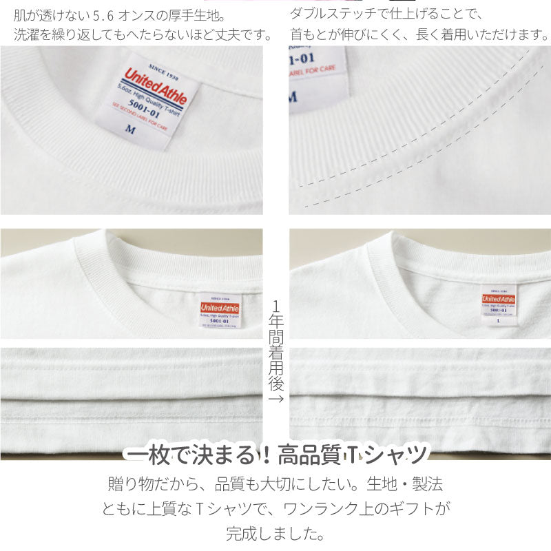 記憶に残る ギフト をお探しの皆さん! おしゃれ も おもしろ も兼ね備えた、 おすすめ ギフト がありますよ♪ 誕生日 や 敬老の日 などの 記念日ギフト はもちろん、 カラーを変えれば 還暦 ・ 古希 ・ 米寿 など、 長寿のお祝いにもぴったり♪ 1) 忘れられない記念日にぴったりのTシャツ 当店のデザイナーの力を結集させて完成した 全27種のデザイン。 定番のカーネーションから、 あ!見たことある気がする! なデザインまで、豊富にご用意いたしました。 ぜひお母さんにぴったりのデザインを見つけてください♪ 2)しっかりクオリティ ギフトにするなら手にして思わず着てみたくなる品質、 ユナイテッドアスレの 5.6オンス ハイクオリティTシャツ。 一度洗ったら首元がへなへなに… そんなことの無いしっかり素材です。 《United Athle(ユナイテッドアスレ)とは?》 「世界に通用するグローバルブランドとして、 品質を伴ったデイリーウェアを開発したい」という想いから 名付けられたアパレルブランドです。 長年愛用するファンを持つユナイテッドアスレの クオリティなら、自信を持ってお渡しいただけます。 [ 選べるカラー11色 ] アッシュグレー ブラック サンドカーキ ロイヤルブルー パープル カナリアイエロー ネイビー ベビーピンク シティグリーン ホワイト ハイレッド ※Tシャツのカラーとデザインの組み合わせによっては、デザインが見づらくなる場合がございますので、ご注意ください。 ≪こんなシーンにおすすめ≫ ・ 30代 40代 50代 60代 70代 の女性への贈り物に ・お母さんへ 寝巻 パジャマ 部屋着 として ・ 母親 義母 母 への 母の日ギフトとして ・ クリスマス バレンタイン の パートナー 彼女 へのプレゼントに ・ネタT ネタTシャツ ウケ狙い 笑える ネタ ・面白い おもしろ |