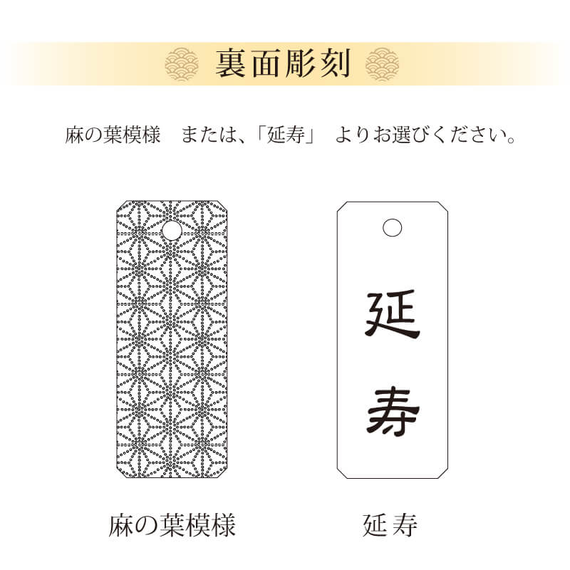 日本の伝統・文化を受け継いだ木札。 縁起物として古くからさまざまな用途に使われました。 あなたにきっとご利益あるかも♪ 大切な人への贈り物にも最適です! 1. 日本の伝統文化 木札の由来 木札は、日本人の暮らしの中で様々な場面に用いられていました。 その中でも、木札が縁起物とよばれるようになった理由には 以下のような由来があります。 一つ目は、江戸火消しの「消し札」。 「火事と喧嘩は江戸の華」と言われるほど江戸時代は火事が多く、 町火消しが火事を防いだ際に、組名が記された札を消し口に掲げていました。 以来、木札は火難、災厄を逃れる縁起物として今に伝わっています。。 二つ目は、神社やお寺でも販売されている「身代わり札」。 名前が刻まれた木札は、その人の分身。 札が割れた際はお札が身代わりとなって守ってくれたという伝承が残っており、 古来よりお守りとして使われていました。 三つ目は、願い事を叶える「納札」。 お寺や神社を参拝する人が、祈願成就のために名前や出身地を書いて納める札のことで、千社札とも呼ばれています。 現在は紙のものが一般的ですが、昔は木札を納めていました。 どれも古くからの日本文化を感じられる由来となっておりますが、 現在ではおしゃれ感覚で身につける人も多く見られます。 キーホルダーやストラップのほか、 名札やボトルキープ用のネームタグなど、様々な用途で使われています。 男女年齢問わず、プレゼントにもおすすめのアイテムです。 2. こだわりの木材 当店で作る木札は全て自社製! 素材にこだわり、職人が一つ一つ丁寧に仕上げました。 温かみのある手触りとやさしい木の香りが、安らぎをもたらします。 また自然木は、時間が経つほどに風合いなどの深みが増していくので、永く愛着を持ってお使いいただけます。 大切な思い出と共に経年変化を楽しめる逸品です。 槐 ?えんじゅ ? 独特な暗色の木肌が特徴。「延寿」という字が使われることから 魔除けや、長寿がもたらされる縁起のよい木として 古くから親しまれています。 3. 名前彫刻 当店自慢の技術で一つ一つ心を込めてお名前を刻みます。 名入れ専門店である当店の確かな技術力で細部までしっかりと彫刻! 自分の名前が入った木札は世界で一つの特別な逸品。 大切な家族や友人へのプレゼントとして贈れば、 喜ばれること間違いありません。 裏面には「延寿」の文字 または「麻の葉模様」を彫刻。 長寿の願い札としても、 魔除けの札としても◎、 ≪こんなシーンにおすすめ≫ ・ 友達への 誕生日プレゼント に ・ 神輿 や 縁日 花火大会 に ・ 家族 やチーム・仲間同士でお揃いに ・ 父の日 敬老の日 のプレゼントに ・ 還暦 古希 喜寿 傘寿 米寿 卒寿 白寿 百寿 などの長寿のお祝いに ・ お子様のバッグや通学カバンに着けて名札代わりに ・ 卒業 卒団 卒部 などの 記念品 に ・ 創立記念 周年記念 のプチギフトに |