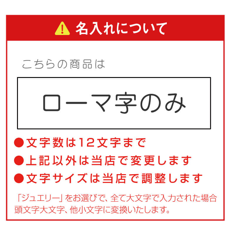 | 名入れ | プリントする文字は「入力欄」へご記入下さい。 【お名前】日本語・ローマ字OK 文字数は【日本語】5文字まで【ローマ字】10文字までとさせていただきます。・上記以外は当店で変更します ・文字サイズは当店で調整します |