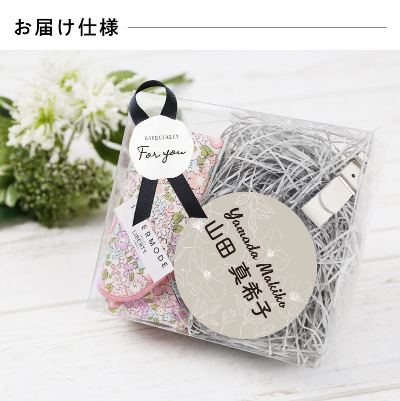 使うシーンを選ばない“万能ネームタグ”に、 華やかなLIBERTYハンカチを添えたギフトセット。 誕生日・記念日・ちょっとした感謝にも最適な贈り物です。 ● オリジナルデザインのアクリル製ネームタグ 高品質な3mm厚アクリルにプリントされた、おしゃれな名前入りタグ。 上品で柔らかな印象のデザインは3種 × 各5色のバリエーション。 選べる3デザイン ・ ミニフラワー ・ ボタニカル ・ ペイント 各デザインニュアンスカラーで5色展開 ・ピンク ・ブルー ・グリーン ・ベージュ ・イエロー 高級感のある本革ベルト付きで仕上がりも◎ ● 使い方いろいろ!タグ活用シーン ゴルフバッグのネームプレートとして スーツケース・キャリーケースに 通勤バッグやマザーズバッグのアクセントに キッズのランドセルやリュックに名前札代わりとして シーンや年齢を問わず活躍してくれる“贈りやすい”アイテムです 。 ● LIBERTYプリントのハンカチ付き 300種類以上のLIBERTY柄から厳選し、 縁取りのメロー系のカラー、裏地のタオル生地まで、 フルオーダーメイドで作り上げました。 上品で美しいタナローン生地と、 ふんわりタオル地の心地よさを両立した、 当店でしか手に入らないタオルハンカチです。 -LIBERTYとは?- 1875年創業のロンドン発の名門ファブリックブランド。 繊細で芸術的なデザインと、シルクのような滑らかなタナローン生地が特徴です。 時代を超えて愛される、美しく上品なテキスタイルです。 |