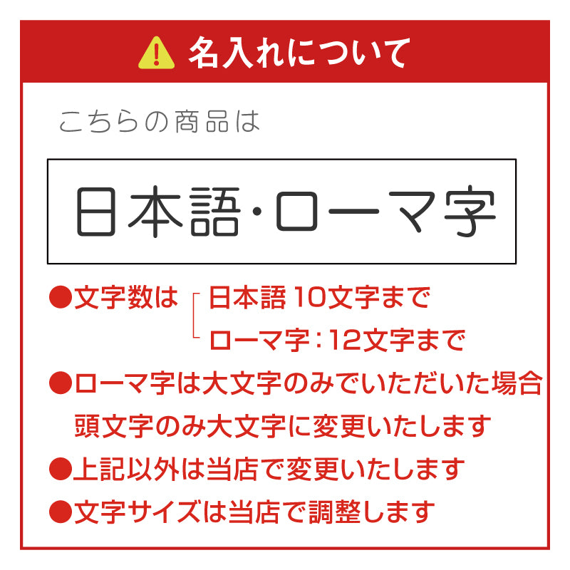 | 名入れ | プリントする文字は「入力欄」へご記入下さい。 【お名前】日本語ローマ字OK 文字数は日本語10文字までローマ字12文字までとさせていただきます。 ・上記以外は当店で変更します ・文字サイズは当店で調整します |