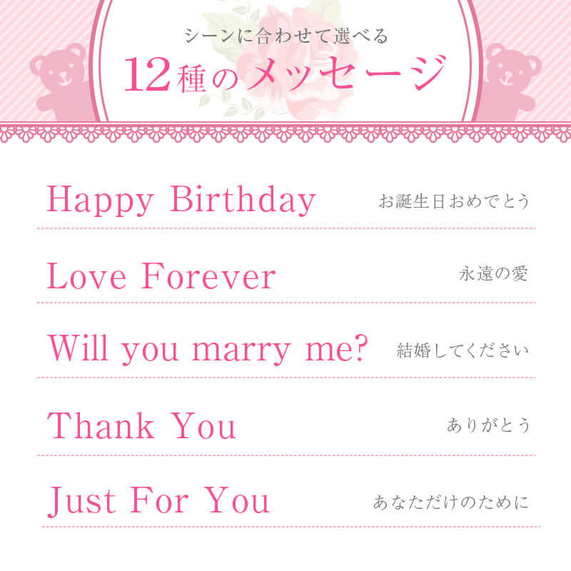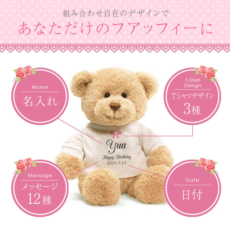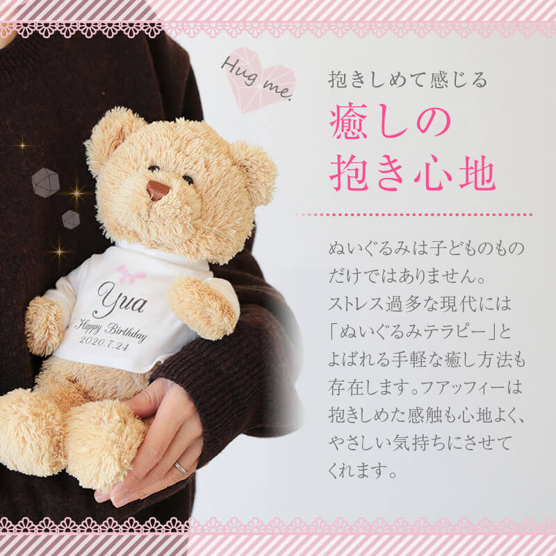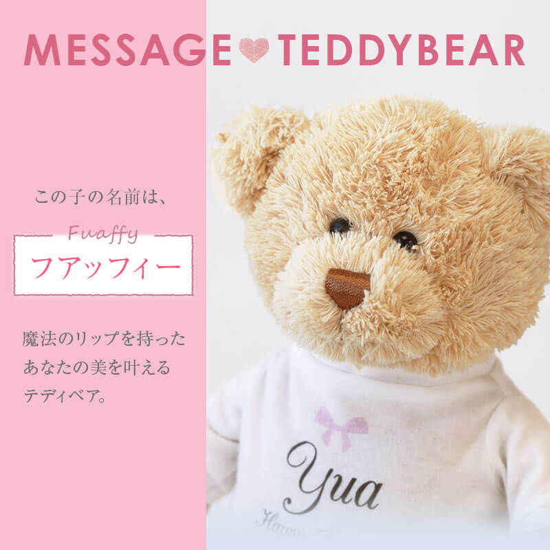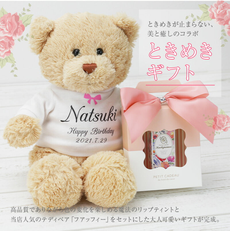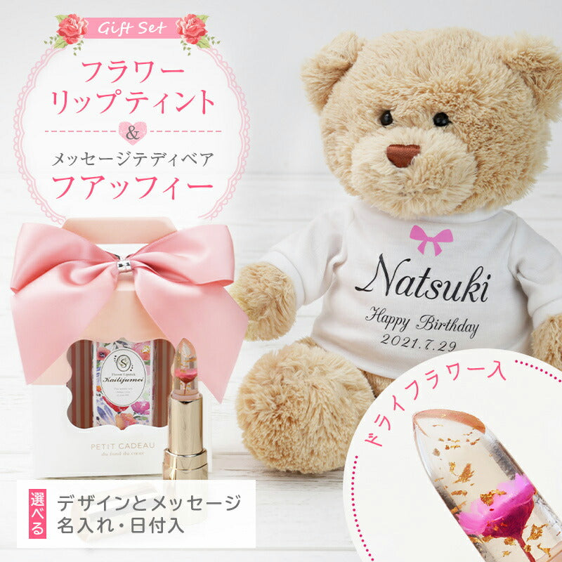\ 超絶かわいい最強コラボGIFT! / トレンドに敏感な女性たちの注目を集める魔法のリップと 愛くるしい表情がなんともキュートなフアッフィーのGIFTセット♪ 飾っておくだけでもワクワクする ふたつのコラボレーションはTwitterやインスタでも注目の的間違いなし! 1. Tシャツに選べるメッセージと名前と日付が入る! [選べる12種のメッセージ] 特別なギフトシーンにぴったりなメッセージが12種類。 相手の事を想いながらお選びください♪ ・ Happy Birthday お誕生日おめでとう ・ Love Forever 永遠の愛 ・ Will you marry me? 結婚してください ・ Thank You ありがとう ・ Just For You あなただけのために ・ Happy Wedding 結婚おめでとう ・ Anniversary 記念日 ・ Happy White Day ホワイトデー ・ Happy Mother's Day 母の日 ・ Merry Christmas メリークリスマス ・ Congratulations! おめでとう! ・ I'm proud of you! あなたを誇りに思います いくつになっても嬉しいテディベアのプレゼント。 メッセージ入りならより一層の感動を与えます。 [日付 ・ お名前入れ] 日付が入ることで目にするたびに記憶がよみがえる記念のプレゼントに。 思い出に残したい日付をご指定下さい。 名入れギフト専門店の当店にて、気持ちを込めてお名前をプリントいたします。 「 どうして名前入りが喜ばれるの? 」 自分の名前が入った商品は世界にただ一つだけ。 贈った人に大事に使ってほしい、想いが伝わります。 さらにお名前彫刻はずっと消えずに残るから、 永く愛着を持って使っていただけます。 だから、「名入れギフト」は大切な人に感謝の気持ちを伝えるのにぴったりなおくりもの。 私たちは、贈られた人も贈った人もみんなが笑顔になれる商品をお届けします。 2. 癒しの手触り こころまでふわっと軽くなれる、ずっと触っていたくなる クマ ちゃん。 「 Fuaffy ‐フアッフィー‐ 」の由来は、ふあふあ × fluffy(もこもこ)。 大人の女性でもキュンとするような、ふわふわな感触に思わずぎゅっと抱きしめたくなる…♪ 大きすぎないサイズ感はベッドで一緒に眠るのにもぴったり。 眠れない夜もFuaffyが居ればもう安心。 やさしい触り心地でリラックスできます。 仕事で疲れた日も、Fuaffyが疲れを吹き飛ばしちゃう♪ 愛くるしいお顔とふわっとした佇まいに心癒される くまのぬいぐるみ 。 さらにTシャツにはメッセージと自分の名前入り。 目にする度に手にした時の感動がよみがえり、気持ちが明るくなれる。 だから、何度も嬉しくなるギフトなんです。 3. 色の変化を楽しめる魔法のリップ ふたを開けると現れるのは透明なリップ。 その中に一輪のドライフラワーと金箔が内包されており、 まるでガラス細工のような美しさです。 透明 グロス のようなクリアな見た目をしていますが、 唇に付ければ、華やかなピンク色に色づきます。 実はこのリップ、体温やph(酸性・アルカリ性の度合い)によって色が変化するように作られているんです。 そのため、日によって、季節によって色合いに変化が生まれます。 唇の温度が高いと濃い色に、低いと薄い色に。 どんな色に染まるかはその日のあなた次第。 これ一本で様々な表情を見せてくれる魔法の ティントリップ です。 自分だけの色を演出できる特別感と、可憐なデザインが人気の理由。 インスタ映え するから、SNS 好きな方へのギフトにもおすすめです。 男性から女性へ贈るのはもちろん、女性から女友達にプレゼントするのも◎。 4.高品質で使い心地バツグン - ティントだから色落ちしにくい - 従来の「塗る」リップと違って「染める」ティントリップは、 自然な塗り心地で、肌に馴染む発色。 「ティント」には、「染める」という意味があり、 唇の角質層に浸透し、唇自体を染めるという性質を持っているのが特徴です。 口紅に塗られている感じがしないので、自然な色合いを求めている方にピッタリです。 色落ちしにくいので、食べたり飲んだりした後、すぐにお化粧直しが出来ない時も大丈夫。 マスクにも跡が残りにくく、外出時でも安心してご使用いただけます。 汗・水・皮脂にも強いので、海やプールでも重宝しますよ。 - 天然オイル配合 - 保湿効果に優れた天然のスクワランオイル配合で、唇に潤いと艶を与えます。 刺激や乾燥、紫外線からもしっかり守ってくれるので、いつでも健康的な唇に。 高い保湿力に加えて美しい発色が長続きするので、 リップケアにはもちろん、口紅やグロスの代わりとしてもお使いいただけます。 - 付けるのが楽しくなる香り - 付けた瞬間、いちごのようなフルーティーな香りが口元からふわっと漂います。 甘く美味しい香りに、気分もうっとり♪ 女性らしさがグッと上がることでしょう。 5. 全3色カラーのドライフラワー リップの中のドライフラワーは、本物を使用しています。 花の色味、形、開き方、全てが一つ一つ異なっているので、 同じリップはふたつとありません。あなただけの フラワーリップ です。 お花のカラーは3色からお選びください。 花に込められた花言葉に合