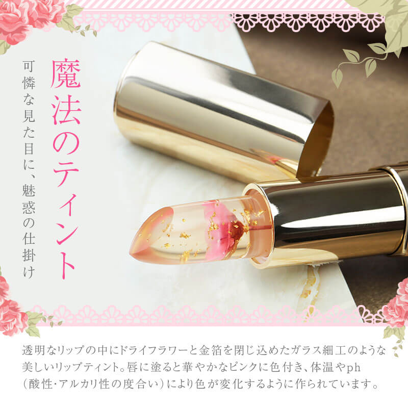 | フラワーリップ ティント | サイズ:横2cm × 縦7cm 容量:3.8g 素材・成分:オゾケライト、水添リイソブテン、ボリエチレン、スタワラン、トリメリト酸トリトリデシル、リンゴ酸ジイソステアリル、バルミチン酸イソブロピル、PEG-30フィトステロール、酸化チタン、赤201、黄5、メチルバラベン、香料 |