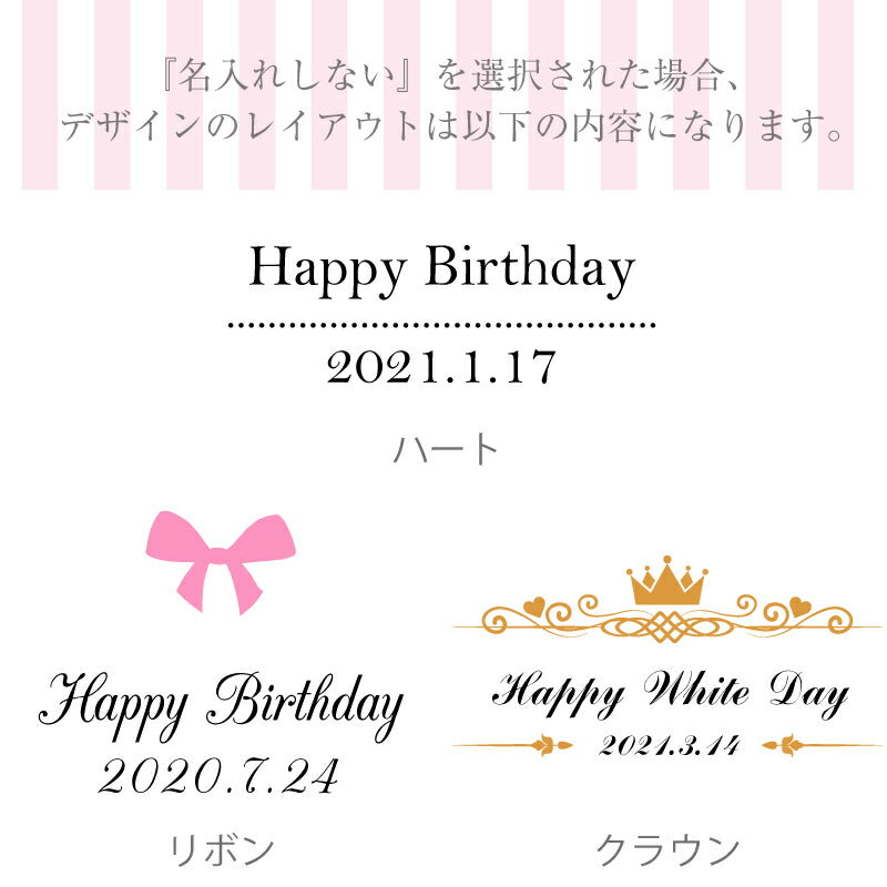プリントする文字は「入力欄」へご記入下さい。 【お名前】ローマ字のみ ※日本語不可 【日付け】数字のみ 文字数は【お名前】12文字まで【日付け】10文字までとさせていただきます。 ・上記以外は当店で変更します ・文字サイズは当店で調整します |