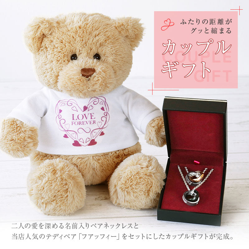 \ 幸せを運ぶ愛されギフト / テディベア&ペアネックレス 女性が喜ぶ最強コラボ♪ ネックレスには名入れサービス無料。 さらに熊のTシャツには想いの伝わるメッセージが入ります。 1. テディベア&ネックレス 当店大人気!ふわもこ手触りのクマちゃん「フアッフィー」が 素敵な サプライズ をお届け! この子が持っている箱を開けると、なんと男女ペアのネックレスが! 愛を確かめ合う 夫婦 恋人 パートナー でおそろいに。 二人の結びつきがより強くなることでしょう。 キュートなテディベアだけではなく、 お洒落な アクセサリー まで付いてくる豪華2点セット! 女性がもらって嬉しい要素がたっぷり詰め込まれています♪ 大切な記念日に相応しいプレゼントです。 2. 癒しの手触り フアッフィー こころまでふわっと軽くなれる、ずっと触っていたくなる触感。 「 Fuaffy ‐フアッフィー‐ 」の由来は、ふあふあ × fluffy(もこもこ)。 大人の女性でもキュンとするような、ふわふわな感触に思わずぎゅっと抱きしめたくなる…♪ 愛くるしいお顔とふわっとした佇まいに心癒される くまのぬいぐるみ です。 一人の夜も、フアッフィーが静かに寄り添ってくれるから いつでも相手をそばに感じ、癒しとぬくもりに包まれる。 だから、何度も嬉しくなるギフトなんです。 フアッフィーのTシャツには、気持ちが伝わるメッセージ入り! 特別なギフトシーンにぴったりなメッセージが11種類。 相手の事を想いながらお選びください♪ [選べる11種のメッセージ] ・ HAPPY BIRTHDAY お誕生日おめでとう ・ LOVE FOREVER 永遠の愛 ・ WILL YOU MARRY ME? 結婚してください ・ THANK YOU ありがとう ・ JUST FOR YOU あなただけのために ・ HAPPY WEDDING 結婚おめでとう ・ ANNIVERSARY 記念日 ・ CONGRATULATIONS おめでとう! ・ MERRY CHRISTMAS メリークリスマス ・ HAPPY VALENTINE'S DAY バレンタインデー ・ HAPPY WHITE DAY ホワイトデー 3. 名前刻印入り ダブルリングのペアネックレス どんな服装にも合う、シンプルなデザイン。 埋め込まれたクリスタルが 高級感 溢れる仕上がりです。 シルバーのチェーン・リングをベースに それぞれ色違いのリングが連なります。 男性はブラック、女性はピンクゴールド ファッションを選ばないカラーリングです。 シルバーのリングには イタリア語で「永遠の愛」を意味する【amore eterno】の刻印入り。 未来を約束するような言葉にきっと2人の絆が深まります。 直接身に着けるものだから、金属アレルギーに対する不安も。 こちらはステンレス316を使用。金属アレルギーに強い素材です。 さらに、メンテナンス不要。さびや変色も無くずっとご愛用いただけます。 〔 刻印サービス無料 〕 リングにはお互いの名前を刻印いたします。 こちらのネックレスなら、恥ずかしがりやさんでも大丈夫。 さりげなく名前を入れたデザインだから、目立ち過ぎず上品な印象。 お客様からも「喜んでもらえました!」と嬉しいお声が届いています♪ 「 どうして名前入りが喜ばれるの? 」 普段あまりにも身近にあるので、自分の名前のことを深く考えることはありませんが 贈られた商品に自分の名前が刻まれていたらどうでしょう。 しかも特殊な技法で彫り込まれていたり素敵なデザインとなってプリントされていたり・・ その瞬間、ただの“商品”ではなく“自分だけの大切なもの”に変化します。 そして贈ってくれた方の真心を感じ、自然に笑顔がこぼれることでしょう。 名前はその人にとって唯一無二、かけがえのないものです。 私たちはそのお名前を大切に、贈る人、贈られる人、両方の笑顔を想いながら商品を送り出します。 当店の名前彫刻はずっと消えずに残り、永く愛着を持ってお使いいただけることでしょう。 |