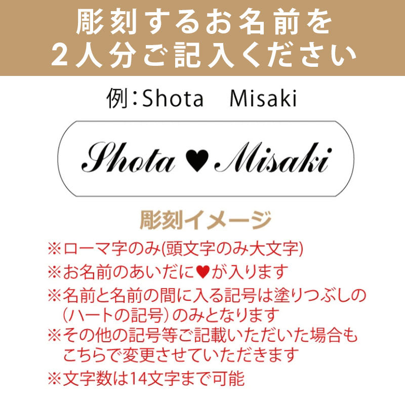 彫刻する文字は「入力欄」へご記入下さい。 【お名前】ローマ字※日本語不可 文字数は14文字までとさせていただきます。 ※ふたりのお名前を彫刻します。 例: Shota Misaki ※ローマ字のみ、頭文字大文字、それ以降は小文字となります ※お名前の間にハートマークがはいります。 ・上記以外は当店で変更します ・文字サイズは当店で調整します |