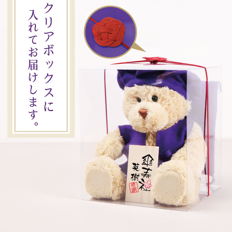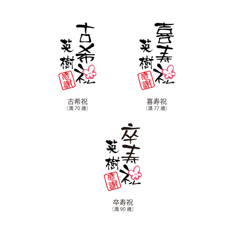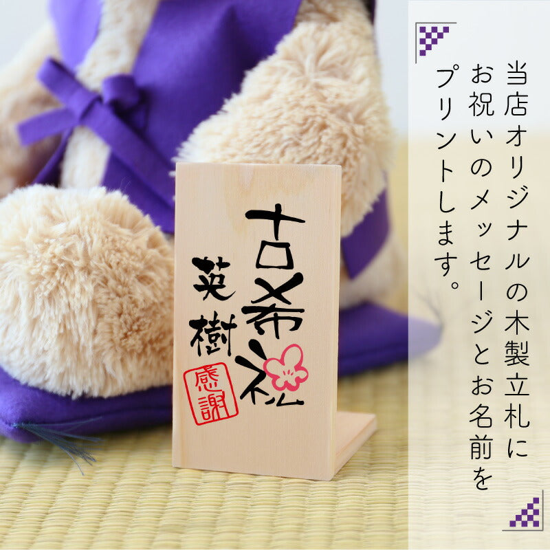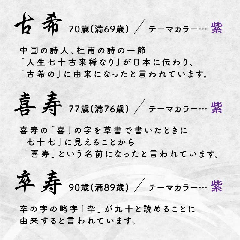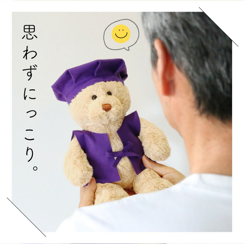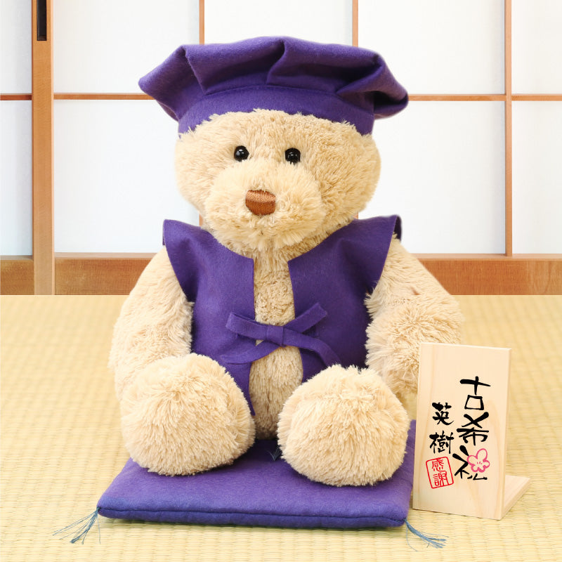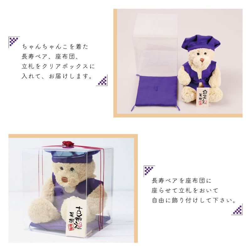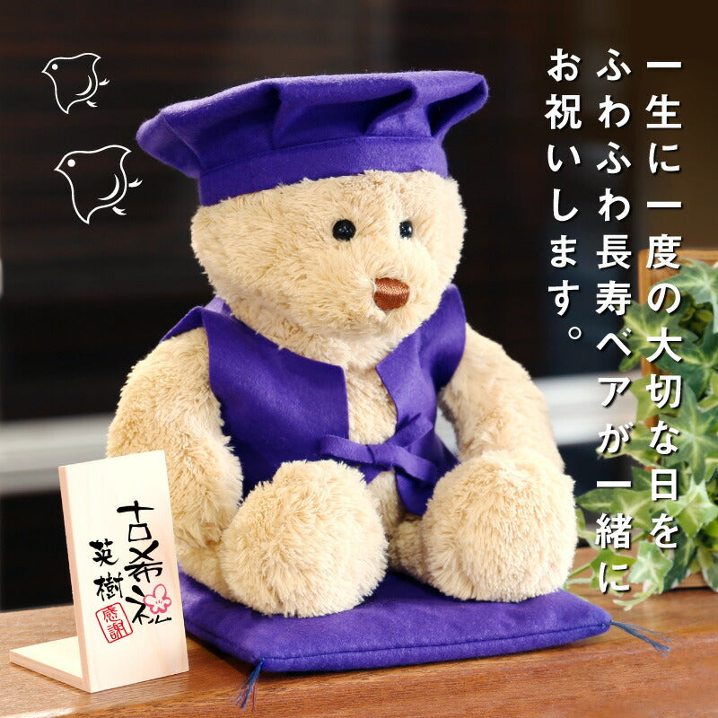 “紫色”は、日本古来より「高貴な色」として使用されてきました。 贈る相手に対する敬意を表す色として有名です。 この紫色を使用する長寿のお祝いは3つあります。 ・古希:70歳(満69歳) ※現代では満70歳に祝うのが一般的です 唐の詩人である杜甫の「人生七十古希稀なり」という詩の一節に由来するといわれています。 ”古”が「古来」、”希”は「めったにない、まれ」という意味で「古来より70歳まで生きる人は稀である」ということから、長寿の節目として祝うようになりました。 ・喜寿;77歳(満76歳) ※現代では満77歳に祝うのが一般的です 還暦や古希とは異なり、日本で生まれたといわれている習わしです。 喜寿の「喜」の字を草書で書いたときに「七十七」に見えることから、 「喜寿」という名前になったと言われています。 ・卒寿:90歳(満89歳) ※現代では満90歳に祝うのが一般的です こちらも、日本発祥のお祝いといわれています。 「卒」の略字「卆」が九十に見えることから、その名がつけられたそうです。 また、鳩に「九」がつくことや、音読みが「きゅう」であることから 「鳩寿(きゅうじゅ)」とも呼ばれています。テーマカラーは白or紫です。 節目を迎えた大事な”あの人”へ、かわいいプレゼントを贈りませんか? 当店が考えた現代の長寿のお祝いにふさわしい”ご長寿ベア”を、 2つのおすすめポイントと共にご紹介します♪ 1、見た目もかわいい!ちゃんちゃんこベア 紫色のちゃんちゃんこ、帽子をかぶり、紫色の座布団に座ったクマちゃん。 クマちゃんは当店のギフトにたびたび登場している子ですが、ちゃんちゃんこや帽子、 座布団は、既製品ではなく、当店の完全オリジナルなんです! 既製品ではどうしてもしっくりこず…”じゃあ作るか!” ということで試作を繰り返した末に完成しました。 見事にフィットしている帽子は、大きめだからかわいいんです♪ ちゃんちゃんこも帽子も着脱可能なので、 これなら、自分がちゃんちゃんこを着ることに抵抗のある方も喜んでくれるはずですっ! さらに”ぬいぐるみテラピー”という言葉もあるように、 このクマちゃんをなでることで、癒し効果も◎ 触り心地抜群の毛並みにうっとりすること請け合いですよ♪ 飾ったままでも、抱っこしてもかわいいクマちゃんに癒されながら 元気に長生きしてほしい。そんな思いで作っています♪ 2、当店特製木札にメッセージとお名前を入れて贈れます♪ こちらのクマちゃんとセットで、 贈る相手のお名前と、メッセージをプリントした木の立札をお付けします。 〔 メッセージ7種類 〕 特別なギフトシーンにぴったりなメッセージが7種類。 相手の事を想いながらお選びください♪ ・ 古希祝 ・ 喜寿祝 ・ 卒寿祝 ・ 誕生祝 ・ 感謝してます ・ いつもありがとう ・ ずーっと元気でいてね 〔 名入れプリント 〕 名入れギフト専門店の当店にて、気持ちを込めてお名前をプリントいたします。 「 どうして名前入りが喜ばれるの? 」 生まれた時からずっと一緒に生きてきた「名前」。 普段あまりにも身近にあるので、 自分の名前のことを深く考える機会はありませんが 贈られた商品に自分の名前が刻まれていたらいかがでしょう。 その瞬間、“プレゼント”は“自分だけの 大切なもの”へと変化します。 そして贈ってくれた方の真心を感じ、 自然に笑顔がこぼれるのではないでしょうか。 名前はその人にとって唯一無二、かけがえのないものです。 私たちはそのお名前を大切に、贈る人、贈られる人、 両方の笑顔を想いながら商品を送り出しています。 当店のお名前彫刻は専門のスタッフが こだわりと自信をもって行っていますので、 1文字1文字つぶれることなく鮮明に刻印され、 ずっと消えずに残ります。 お客様の気持ちのこもったギフトを 永く愛着を持ってお使いいただけますように。 それが、私たち名入れギフトOkuluスタッフ全員の願いです。 ≪こんなシーンにおすすめ≫ ・ 古希祝い 喜寿祝い 卒寿祝い の 贈り物 として ・ 母の日 父の日 での贈り物に ・ お父さん お母さん 父 母 へのプレゼントに ・ おじいちゃん おばあちゃん 祖父 祖母 への 長寿祝い に ・ 敬老の日 の贈り物に |