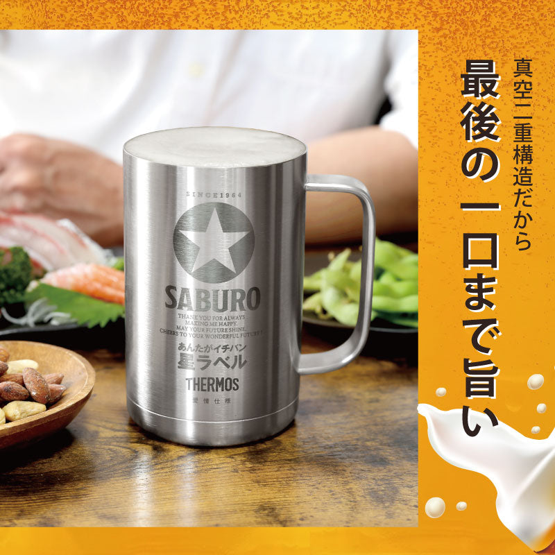 機能性抜群!サーモスビールジョッキに 当店オリジナル「GOLDSTAR」デザインを彫刻しました。 1) 安心・信頼のサーモスブランド - 機能性 - キンキンに冷えた大容量ビールが最後まで冷たく飲める! サーモスといえば、魔法びん のパイオニア。 真空断熱構造は熱伝導が発生しにくく、温かいまま・冷たいままを長時間維持。 美味しい温度をキープできるから、 アウトドアにも重宝する ステンレスタンブラーです。 氷が溶けにくい、結露しにくい真空二重構造。 テーブルや手を濡らすことなく、ストレスフリー。 食洗機対応でお手入れも簡単です。 - 容量 - コンパクトながら大容量600ml! 500mlの缶ビールが、つぎ足しいらずで一本分のサイズです。 ハイボールや酎ハイグラスにも。 冷たい温度にこだわりたい方にはもちろん、 ビールを飲むならジョッキで豪快に! という方ならジョッキタンブラーがオススメです。 2)当店オリジナル!GOLDSTARデザイン ビール好き なら誰もが知ってるこのデザイン。 当店オリジナルデザイン「GOLDSTAR」のグラスは某インスタグラマーにお使いいただいたことからSNSで話題に! 高い再現度を評価され、これまでにたくさんの笑顔をお届けしてきました。 そんなGOLDSTARデザインを高機能と名高いサーモスジョッキにレーザー彫刻。 直接言葉にするのが照れくさい人はこの ビールジョッキ を贈るのがおすすめ。 贈った側も贈られた側もこころ温まるサプライズギフトに! 3)カスタマイズで世界に一つだけ - お名前 - まるでブランドのよう! インパクト抜群の名入れ彫刻です。 - 年号 - 生まれ年、結婚した年 など 目にするたびに記憶がよみがえる記念のプレゼントに。 - 選べるメッセージ - 当店専属コピーライター考案のオリジナルメッセージ。 クスッと笑える楽しいひと時に。 【 お名前入れ彫刻 】 当店自慢のレーザー加工による名入れサービスは、 職人の手でひとつひとつ丁寧に施しております。 彫刻したお名前は消える事がございませんので、 贈り物として大変喜ばれます。 カスタマイズで世界でたった一つだけ! 名前入りだから愛着を持って永くお使いいただけます。 ≪こんなシーンにおすすめ≫ ・ 父 義父への 父の日ギフト として ・ お父さんの誕生日プレゼントに ・ アウトドア ビール好きのアクティブ パパ へ ・ 退職祝い 定年退職のお祝いギフトとして ・ 敬老の日のおじいちゃんのプレゼントに |