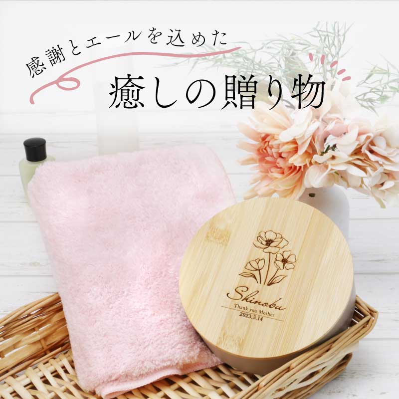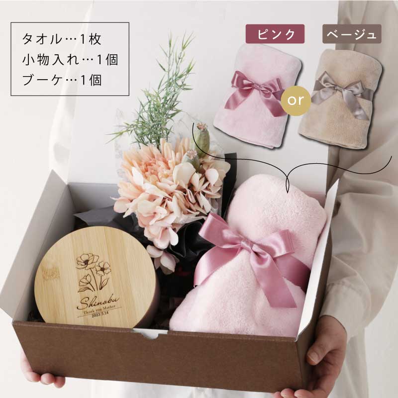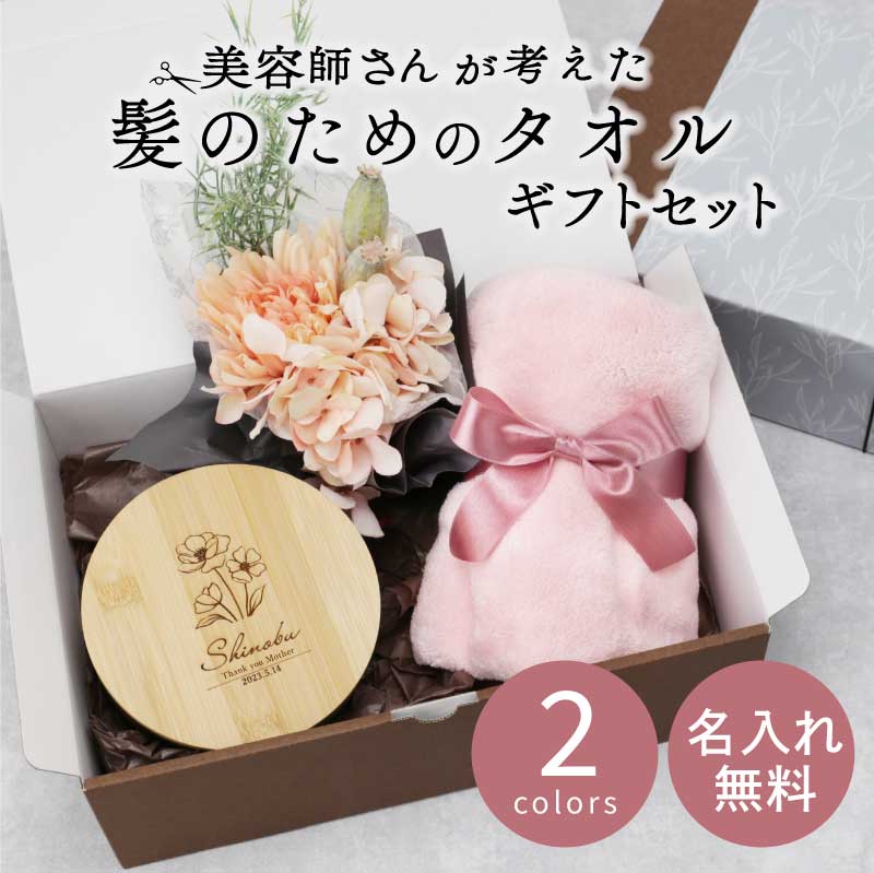 「忙しい」が口癖のお母さんに 時短アイテムと日々を彩る素敵なギフト。 感謝とエールを込めた3つの贈り物をセットに。 1)時短&ヘアケアが叶う最強タオル 「 美容師さんが考えた髪のためのタオル 」は SNSのヘアケア特集投稿で度々取り上げられているカリスマ的タオル。 幅広い年齢層に支持されているヘアケアアイテムです。 ヘアケアの基本は髪が濡れている時間を少しでも短くする事。 驚くほどのパワフル吸収・速乾性でこれまでのタオルとは別格です。 いつも自分のことが後回しになってしまう子育て中のママにもおすすめ。 タオルを巻いておくだけで、ドライヤー時間を圧倒的に短縮出来ます。 - スタッフが試してみました - Mさん: 「 違いは巻いた瞬間に分かりました。強い吸収力のおかげで、巻いたタオルが落ちてこなくてストレスフリーです 」 Sさん: 「 いつも子どもの世話をしている間にタオルを巻いておきますが、ほどいたときに明らかに髪が軽いと感じました。 」 Tさん: 「 1度使っただけですが、洗い替え用にも2〜3枚欲しいです 」 中にはバスタオルが要らなくなった、という声も。 もはや既に持っている、という方でも嬉しいギフト。 スタッフみんながおススメできる最強タオルです。 2) アンティークフラワーブーケ もらって嬉しい花束がインテリアにもなる、 枯れないアーティフィシャルフラワーブーケ。 アンティーク調に施された加工がおしゃれなグリーンと 優しい色調が美しいダリアの組み合わせ。 そのまま置いて飾ったり、ラッピングペーパーを外して フラワーベースに挿したりとお好みに合わせた飾り方が可能。 飾るだけでワンランク上の空間に。 忙しい日常を彩りをくれる、癒しのブーケです。 3)お名前&メッセージ彫刻入り小物入れ 蓋がスタンドミラーとしても使える、便利な小物入れ。 コスメやアクセサリー、ヘア小物も収納可能。 ナチュラルで洗練されたデザインだから、 好みが分かれないのもギフトに嬉しいポイントです。 蓋表面にはお名前とメッセージを彫刻いたします。 目にする度に心が温かくなる、フラワーデザイン。 ずっと消えない彫刻は特別なギフトにぴったりです。 [ 9種類から選べるメッセージ ] Happy Birthday - お誕生日おめでとう - Anniversary - 記念日 - Thank you Mother - お母さんありがとう - Thank you for always. - いつもありがとう - Happy if you were here. - あなたがいてくれたら幸せ - I hope you have a good day today - 今日もよい1日になりますように - May your dreams come true. - 夢がかないますように - Take it easy. - 気楽にいこう。 - You'll be alright. - あなたは大丈夫。 - 鏡の前でメッセージを目にして一呼吸。 煩雑な毎日でも少しだけリラックスした気持ちになれそうです。 [ こんなシーンにおすすめ ] ・ 20代 30代 40代 50代 60代 女性 への 誕生日 母の日 敬老の日 の お祝い に ・ 母 お母さん 子育て中 の ママ に ・ 友達 女友達 友人 へ ・ 出産祝い ママ ギフト として ・ 送別品 内定祝い 昇進祝い など 記念日に |