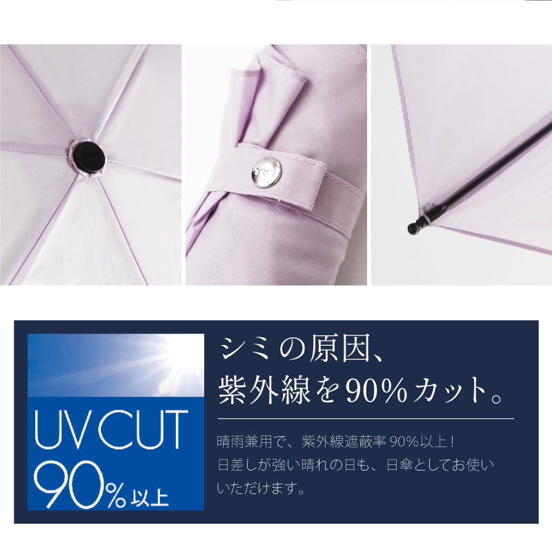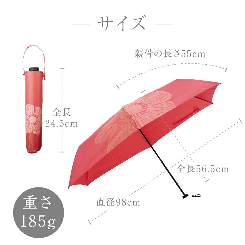 | サイズ | 親骨の長さ:約55cm 開いた時の直径:約98cm 全長:約56.5cm〔折り畳み時:約24.5cm〕 重さ:約185g |