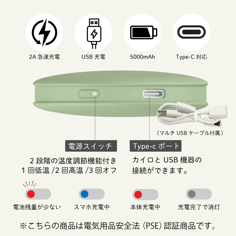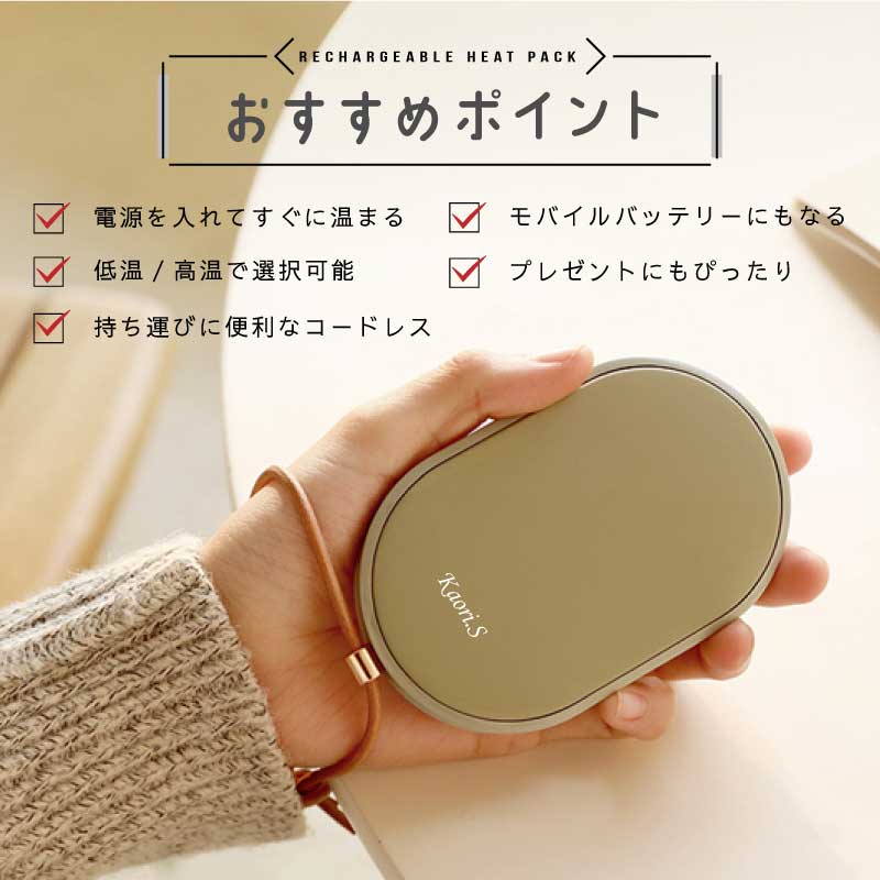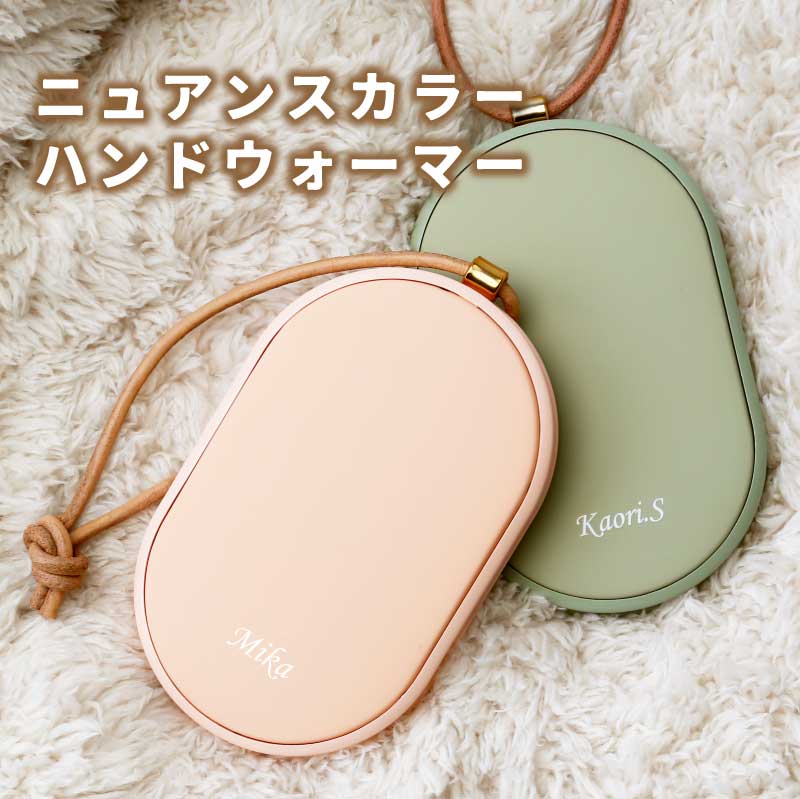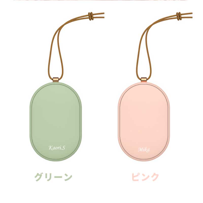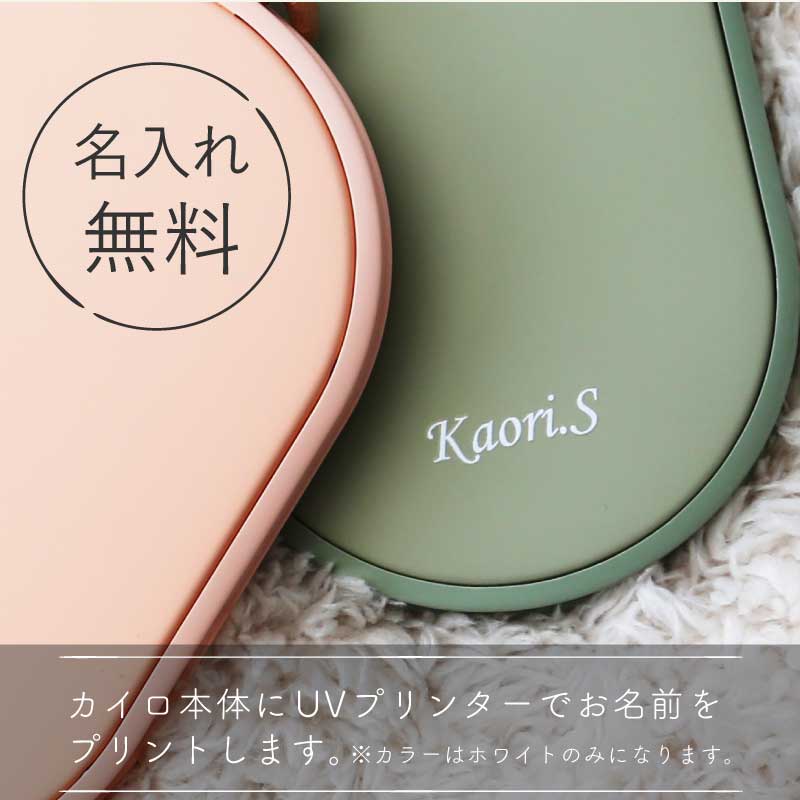 心も体もポカポカ快適♪ 暮らしに寄り添うぬくもりギフトです。 - おすすめポイントは3つ! - 1. 冬の必需品!便利な充電式カイロ - 繰り返し使える エコ なアイテム - カイロは使い捨てのものが一般的ですが、 一回きりで捨ててしまうのはもったいない… そんな時、重宝するのが 充電式 のカイロです。 繰り返し使えてゴミが出ないから 環境に優しく、現代の暮らしにぴったりです。 - スイッチ1つで素早く温まる - カイロを使う時はボタンを押すだけ! わずか10秒でスピーディーに温まります。 使わない時はスイッチOFFにすればOK。 必要に応じてお使いいただけます。 - 好みの温度に調節できる - 温かさは 2段階 で調節できるようになっており、 ボタンを1回押せば白いランプが点灯して低温モード( 45度 )、 もう一度押すと赤いランプが点灯して高温モード( 55度 )になります。 熱くなりすぎず、ほどよい温かさをキープします。 - 持ち運びができるコードレス - コードレス でどこでも温かさを持ち運べるので 通勤、通学中や長時間の外出など、あらゆるシーンで活躍します。 約3時間でフル充電、2〜4時間の使用が可能です。 ※カイロの連続使用時間は、使用場所の気温によっても異なります。 2. モバイルバッテリーとして使用可能 カイロとしてだけではなく モバイルバッテリーとしてもお使いいただけます。 5000mAhの大容量バッテリーが搭載されており、 インプット用、アウトプット用の差込口で USB 機器への接続が可能。 どこでも スマホ の充電ができるので、 冬だけでなくオールシーズン活躍します。 バッテリーとカイロ、両方持ち歩く必要が無いので 外出時の荷物をコンパクトに収めるほか、 災害時に持っていると心強いアイテムです。 3. 暮らしになじむデザイン 丸いフォルムが手に優しくフィット。 薄型 & 手のひらサイズで持ち運びにも最適な、 使い心地にこだわったデザインです。 本体には高級感あふれるレザーのストラップ付♪ シンプルかつおしゃれな見た目だから プレゼントにもぴったりです。 本体のカラーは2色からお選びください。 ナチュラルな くすみカラー で自分らしさを演出します。 ・ ピンク ・ グリーン 〔 名入れプリント無料 〕 本体に贈る相手のお名前をプリントいたします。 当店自慢の高性能プリンターで印字するので 細い線までくっきりと表現することができます。 白インクの名入れは、ニュアンスカラーと相性◎♪ 特別感がUPするので、贈り物として大変お喜びいただけます。 「 どうして名前入りが喜ばれるの? 」 生まれた時からずっと一緒に生きてきた「名前」。 普段あまりにも身近にあるので、 自分の名前のことを深く考える機会はありませんが 贈られた商品に自分の名前が刻まれていたらいかがでしょう。 その瞬間、“プレゼント”は“自分だけの 大切なもの”へと変化します。 そして贈ってくれた方の真心を感じ、 自然に笑顔がこぼれるのではないでしょうか。 名前はその人にとって唯一無二、かけがえのないものです。 私たちはそのお名前を大切に、贈る人、贈られる人、 両方の笑顔を想いながら商品を送り出しています。 当店のお名前プリントは専門のスタッフが こだわりと自信をもって行っていますので、 1文字1文字つぶれることなく鮮明に印刷され、 ずっと消えずに残ります。 お客様の気持ちのこもったギフトを 永く愛着を持ってお使いいただけますように。 それが、私たち名入れギフトOkuluスタッフ全員の願いです。 ≪こんなシーンにおすすめ≫ ・ 友達 への 誕生日プレゼント 冬ギフト に ・ 秋 冬 の 通勤 通学 旅行 遠征 のお供に ・ 学生 さんへ 受験生応援グッズ として ・ 彼女 への クリスマス ホワイトデー の贈り物として ・ キャンプ 登山 に最適な アウトドアグッズ として |