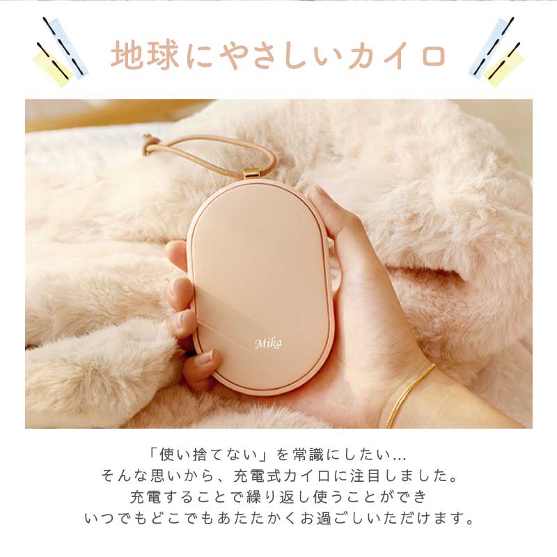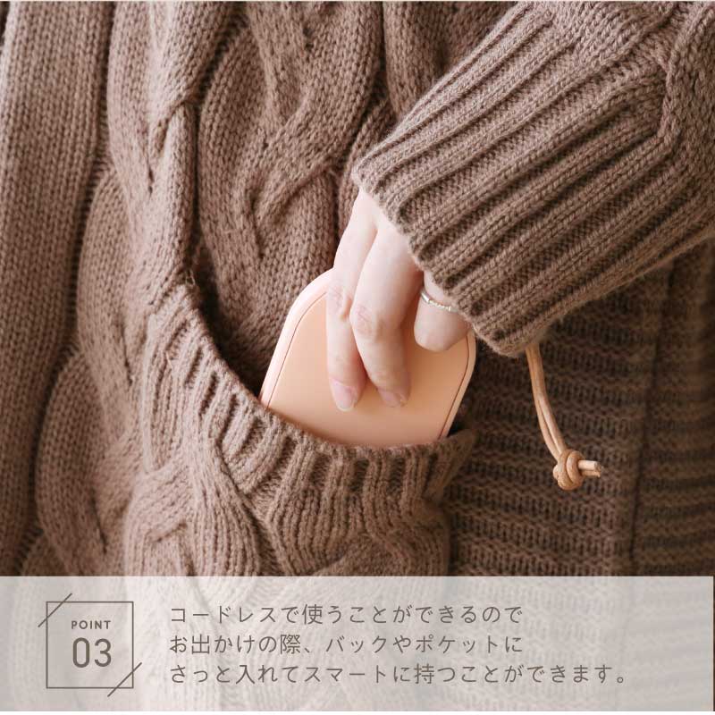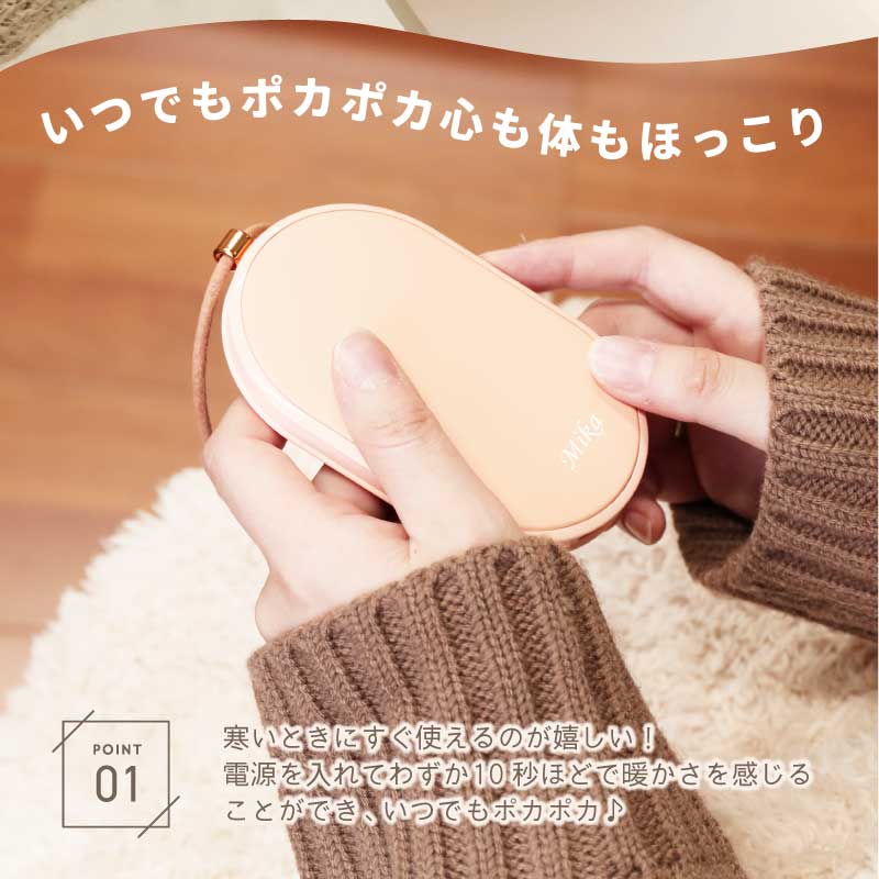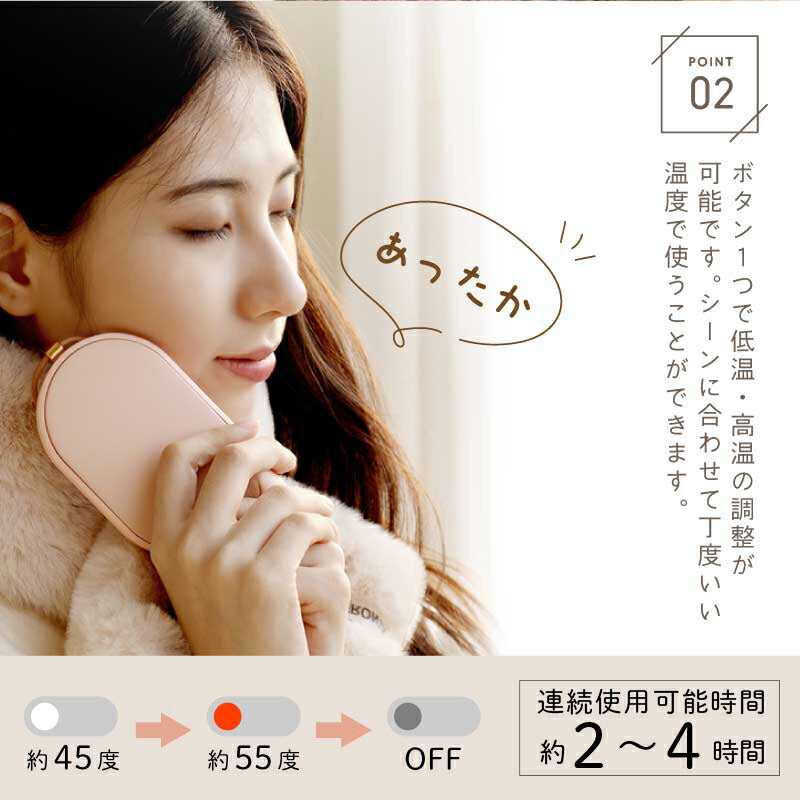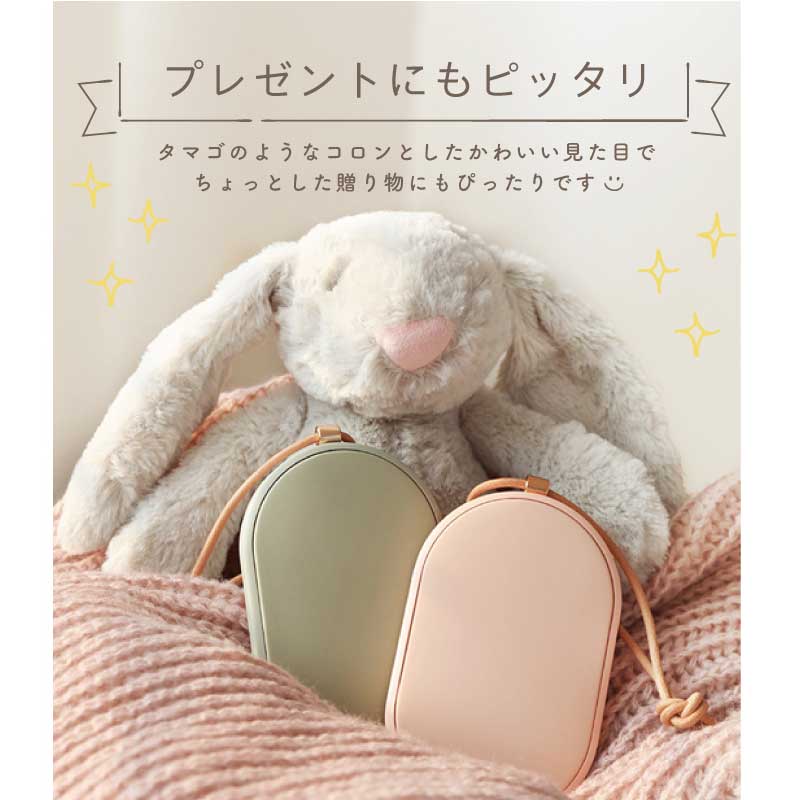 心も体もポカポカ快適♪ 暮らしに寄り添うぬくもりギフトです。 - おすすめポイントは3つ! - 1. 冬の必需品!便利な充電式カイロ - 繰り返し使える エコ なアイテム - カイロは使い捨てのものが一般的ですが、 一回きりで捨ててしまうのはもったいない… そんな時、重宝するのが 充電式 のカイロです。 繰り返し使えてゴミが出ないから 環境に優しく、現代の暮らしにぴったりです。 - スイッチ1つで素早く温まる - カイロを使う時はボタンを押すだけ! わずか10秒でスピーディーに温まります。 使わない時はスイッチOFFにすればOK。 必要に応じてお使いいただけます。 - 好みの温度に調節できる - 温かさは 2段階 で調節できるようになっており、 ボタンを1回押せば白いランプが点灯して低温モード( 45度 )、 もう一度押すと赤いランプが点灯して高温モード( 55度 )になります。 熱くなりすぎず、ほどよい温かさをキープします。 - 持ち運びができるコードレス - コードレス でどこでも温かさを持ち運べるので 通勤、通学中や長時間の外出など、あらゆるシーンで活躍します。 約3時間でフル充電、2〜4時間の使用が可能です。 ※カイロの連続使用時間は、使用場所の気温によっても異なります。 2. モバイルバッテリーとして使用可能 カイロとしてだけではなく モバイルバッテリーとしてもお使いいただけます。 5000mAhの大容量バッテリーが搭載されており、 インプット用、アウトプット用の差込口で USB 機器への接続が可能。 どこでも スマホ の充電ができるので、 冬だけでなくオールシーズン活躍します。 バッテリーとカイロ、両方持ち歩く必要が無いので 外出時の荷物をコンパクトに収めるほか、 災害時に持っていると心強いアイテムです。 3. 暮らしになじむデザイン 丸いフォルムが手に優しくフィット。 薄型 & 手のひらサイズで持ち運びにも最適な、 使い心地にこだわったデザインです。 本体には高級感あふれるレザーのストラップ付♪ シンプルかつおしゃれな見た目だから プレゼントにもぴったりです。 本体のカラーは2色からお選びください。 ナチュラルな くすみカラー で自分らしさを演出します。 ・ ピンク ・ グリーン 〔 名入れプリント無料 〕 本体に贈る相手のお名前をプリントいたします。 当店自慢の高性能プリンターで印字するので 細い線までくっきりと表現することができます。 白インクの名入れは、ニュアンスカラーと相性◎♪ 特別感がUPするので、贈り物として大変お喜びいただけます。 「 どうして名前入りが喜ばれるの? 」 生まれた時からずっと一緒に生きてきた「名前」。 普段あまりにも身近にあるので、 自分の名前のことを深く考える機会はありませんが 贈られた商品に自分の名前が刻まれていたらいかがでしょう。 その瞬間、“プレゼント”は“自分だけの 大切なもの”へと変化します。 そして贈ってくれた方の真心を感じ、 自然に笑顔がこぼれるのではないでしょうか。 名前はその人にとって唯一無二、かけがえのないものです。 私たちはそのお名前を大切に、贈る人、贈られる人、 両方の笑顔を想いながら商品を送り出しています。 当店のお名前プリントは専門のスタッフが こだわりと自信をもって行っていますので、 1文字1文字つぶれることなく鮮明に印刷され、 ずっと消えずに残ります。 お客様の気持ちのこもったギフトを 永く愛着を持ってお使いいただけますように。 それが、私たち名入れギフトOkuluスタッフ全員の願いです。 ≪こんなシーンにおすすめ≫ ・ 友達 への 誕生日プレゼント 冬ギフト に ・ 秋 冬 の 通勤 通学 旅行 遠征 のお供に ・ 学生 さんへ 受験生応援グッズ として ・ 彼女 への クリスマス ホワイトデー の贈り物として ・ キャンプ 登山 に最適な アウトドアグッズ として |
