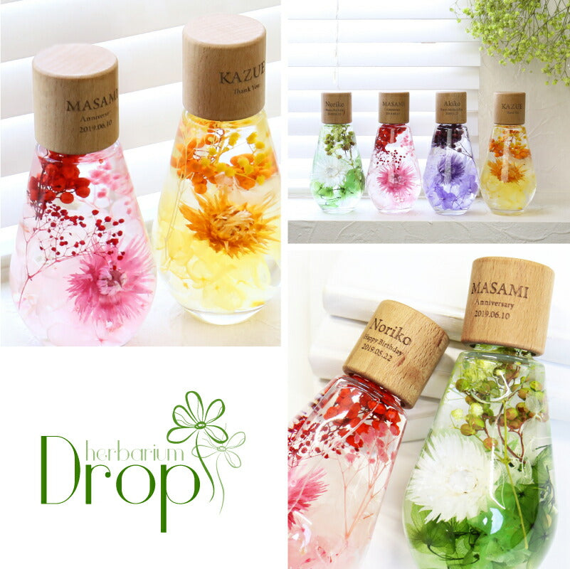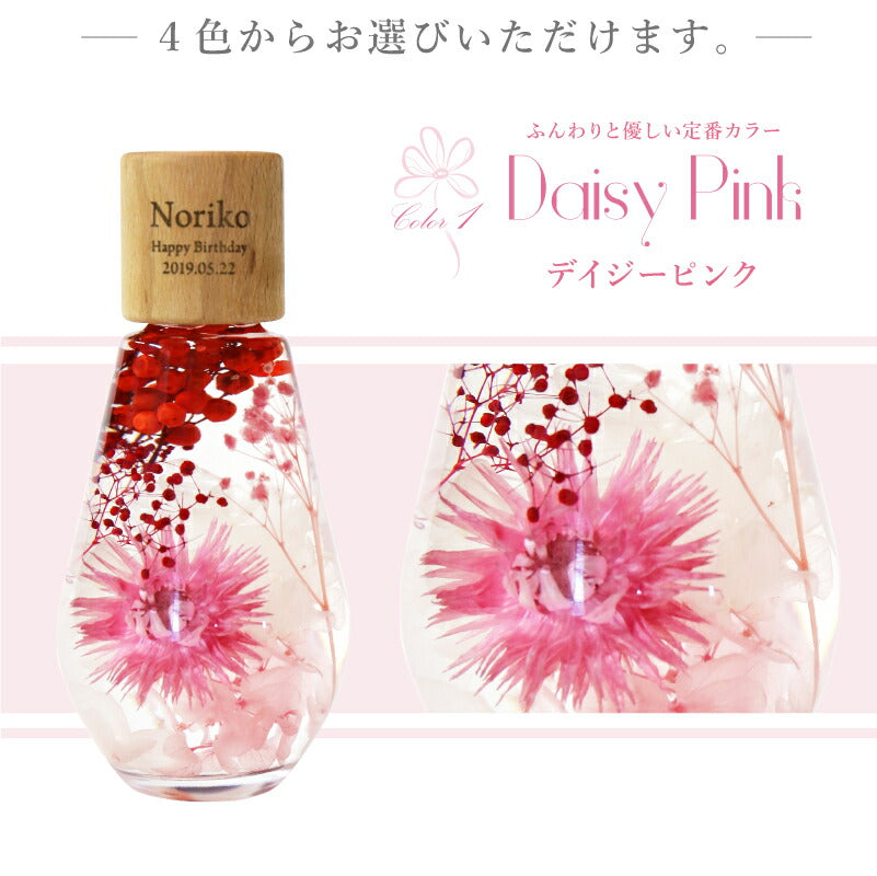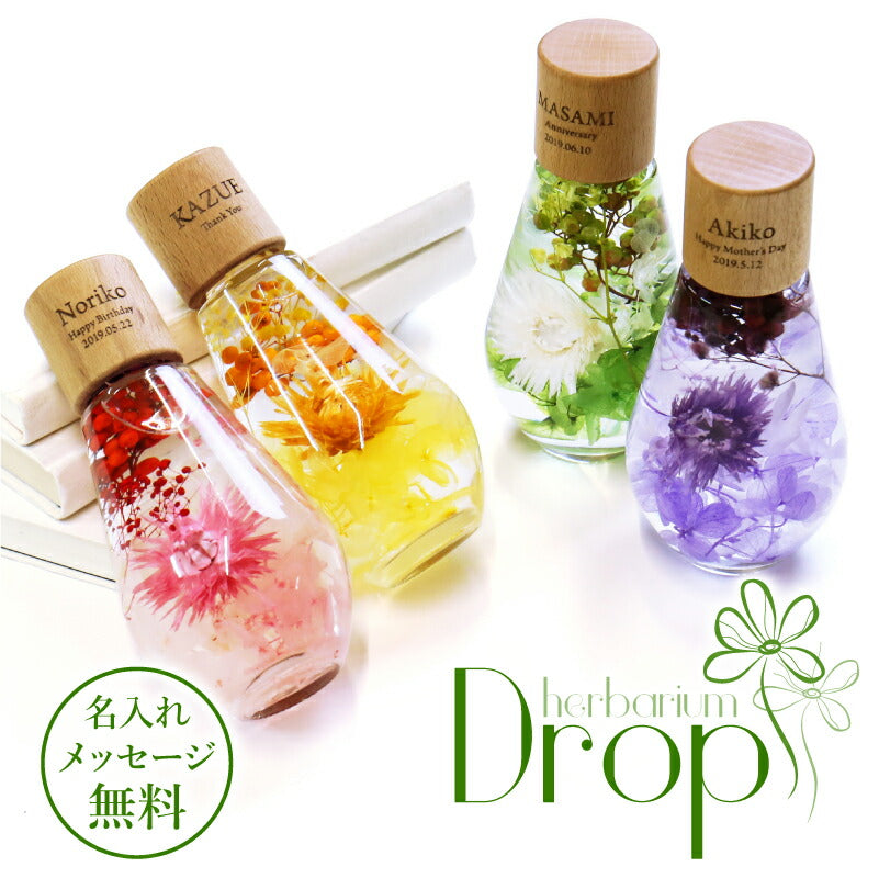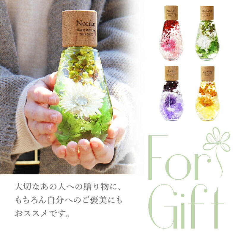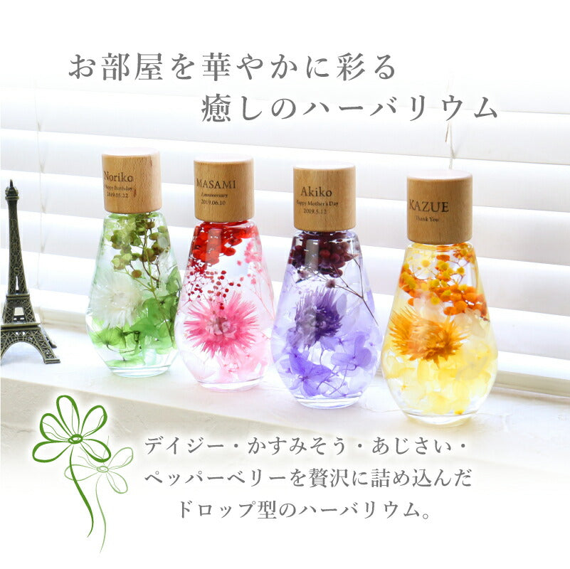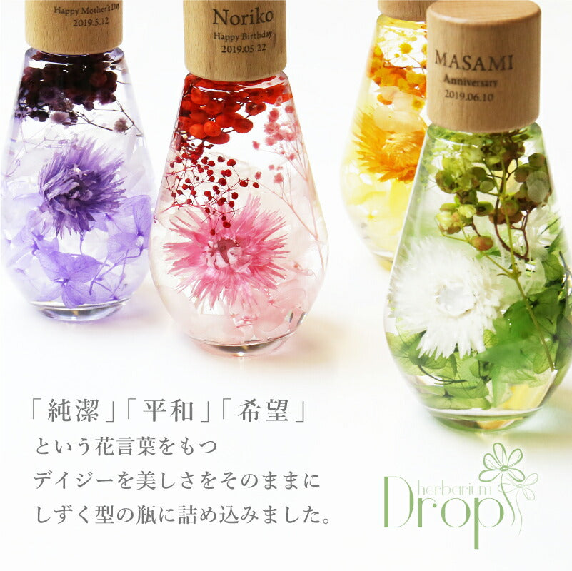 いつもがんばるあの人へ 生活空間の中に癒しを届けるフラワーインテリア。 母の日にはもちろん 多くのお祝いのシーンでプレゼントとして選ばれています。 1.) 癒しの空間を作るインテリア ハーバリウム - ハーバリウムとは? - ハーバリウムとはその名の通り「 植物標本 」。 ドライフラワー や プリザーブドフラワー をガラス瓶に入れて楽しむ フラワーインテリア です。 専用のオイルに浸すことで、独特の透明感と浮遊感が出て、 水の中を舞う幻想的な お花 の姿を楽しむことが出来ます。 お手入れ不要で、一年以上綺麗が持続するお手ごろさも 人気 のポイント。 - 手づくり仕様 - 当店のハーバリウムは、専属デザイナーによる手仕事。 スタッフがひとつひとつ丁寧に 花材 を瓶に詰めて製作しております。 可愛いものが大好きな、すべての女性に喜んでほしい。 そんな想いを込めて作った「 ハーバリウム ドロップ 」。 毎年多くのお客様の元へとお届けしております。 デイジー・かすみそう・あじさい・ペッパーベリーを贅沢に詰め込んだ ドロップ型のハーバリウムです。 デイジーの花言葉は、「純潔」 「平和」 「希望」 見た目だけでなく、素敵な花言葉がたくさん綴られたお花です。 「平和な未来が訪れますように」 こんなご時世の今だからこそ、 そんな希望を込めて、大切な人に贈ってみるのはいかがでしょうか。 〔 選べるカラー4色 〕 相手のイメージやお好きな色に合わせてお選びいただけます。 ・ Pink 女性への贈り物にふさわしい ふんわり優しい定番カラーです。 ・ Green 清涼感のある癒しカラー ナチュラルテイストが好きな方におすすめです。 ・ Purple 優雅で上品な紫色は 大人の女性への贈り物にピッタリ ・ Yellow 元気なビタミンカラーは いつも明るく楽しい気分にしてくれます。 当店のハーバリウムは、 中のお花だけでなく容器にもこだわりました。 - ドロップ型ガラス瓶 - コロンしたフォルムが可愛いしずく型の瓶を使用。 ガラスの丸みによって中のお花が膨張して見えるため、華やかな雰囲気に♪ 置く角度を変えればいろんな表情を楽しむことが出来ます。 高さのないボトルなので省スペースでどこでも置ける。 玄関先、キッチン、リビングなどどんな場所にも彩りを添え、ほっと一息つく空間に。 - 当店オリジナル木製キャップ - ハーバリウムの自然な雰囲気に合わせて、 ガラス瓶 には当店オリジナルの木製キャップをかぶせています。 角を丸くした優しい風合いの木製ボトルキャップは、 家具職人による手作業で作られた作品。 一つ一つ丹精込めて丁寧に仕上げております。 木製のボトルキャップには 無料 で 名入れ とメッセージ、日付が彫刻可能です。 ハ—バリウムの自然な雰囲気に合わせたさりげなく控えめな刻印が、 どんな女性にも喜ばれるデザインとなっております。 〔 メッセージ刻印 〕 メッセージは全6種類 贈るシーンに合わせてお好きなものをお選びいただけます。 ・Happy Mother's Day 母の日 ・Happy Birthday 誕生日おめでとう ・Thank You ありがとう ・Happy Wedding 結婚おめでとう ・Anniversary 記念日 ・Merry Christmas 良いクリスマスを 〔 日付彫刻 〕 メッセージの下部には、お好きな日付を彫刻可能。 貰った日の感動がよみがえる、いつまでも記憶が色褪せない。 思い出のギフトになることでしょう。 花は同じ品種でも、それぞれ色合いやカタチが異なります。 ハーバリウムは、一つ一つ表情が違うオンリーワンのギフトです。 名前入り になることでさらに特別感がUP。 唯一無二のプレゼントに! 「 どうして名前入りが喜ばれるの? 」 自分の名前が入った商品は世界にただ一つだけ。 贈った人に大事に使ってほしい、想いが伝わります。 さらにお名前彫刻はずっと消えずに残るから、永く愛着を持って使っていただけます。 だから、「名入れギフト」は大切な人に感謝の気持ちを伝えるのにぴったりなおくりもの。 私たちは、贈られた人も贈った人もみんなが笑顔になれる商品をお届けします。 ≪ こんなシーンにおすすめ ≫ ・新社会人 学生 への 新生活 入学祝い 入社祝い 卒業祝い に ・クリスマス ホワイトデー に彼女へのプレゼントに ・上司 先輩 後輩の 退職祝い 定年退職 転勤祝い のギフトとして ・敬老の日 に 祖母 への贈り物として ・50代 60代 70代 の 女性 への プレゼント に ・お花が好きな方や小物にもこだわりたい方に |
