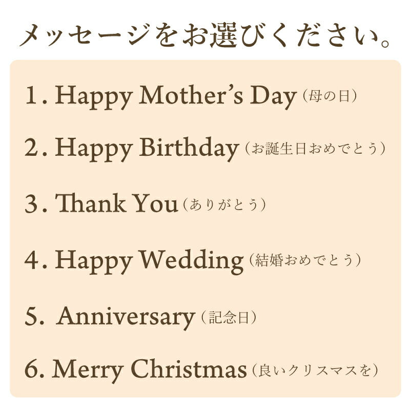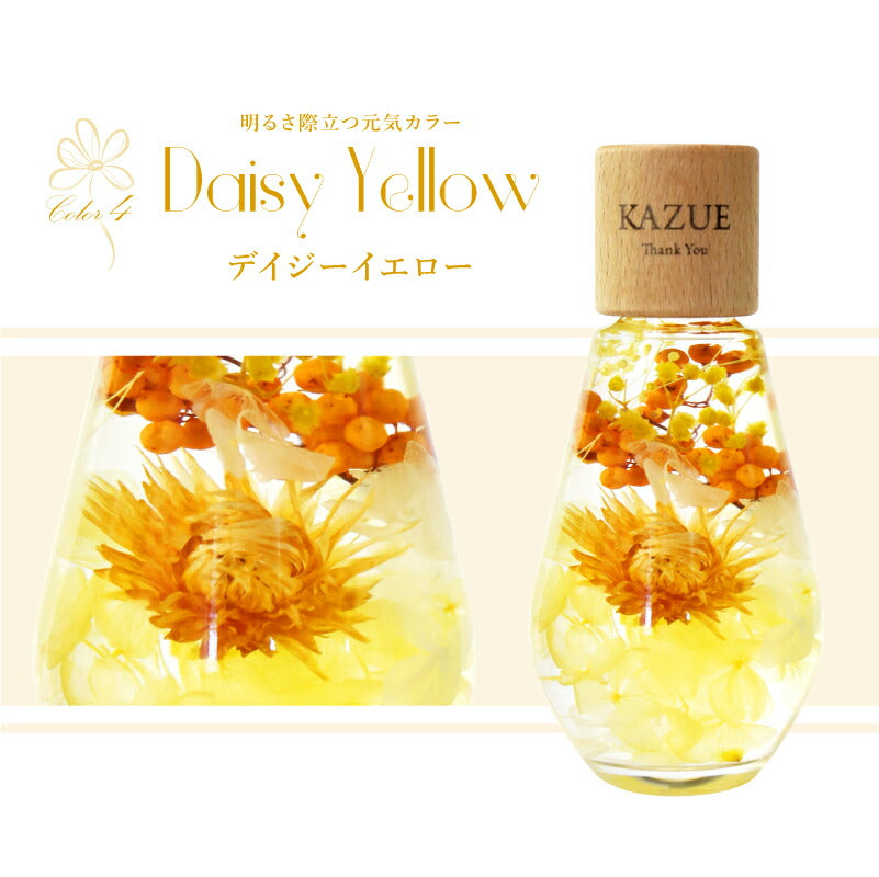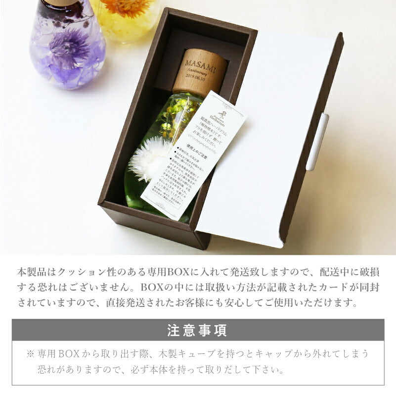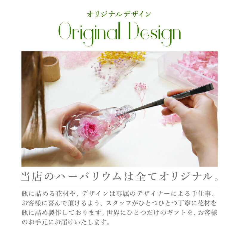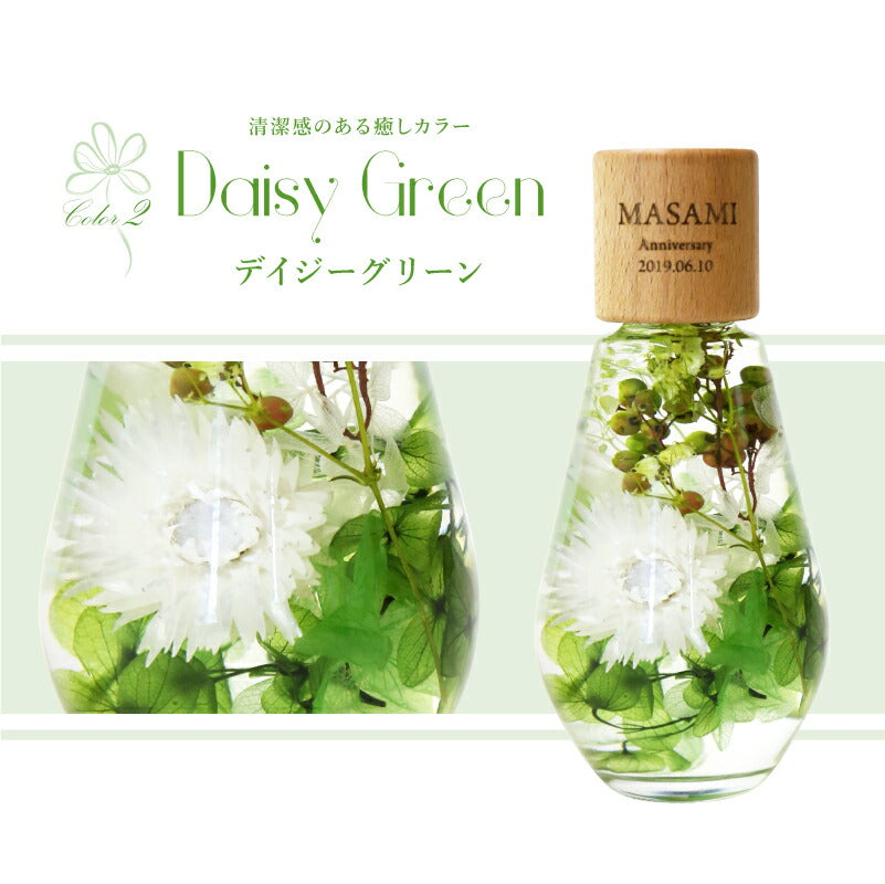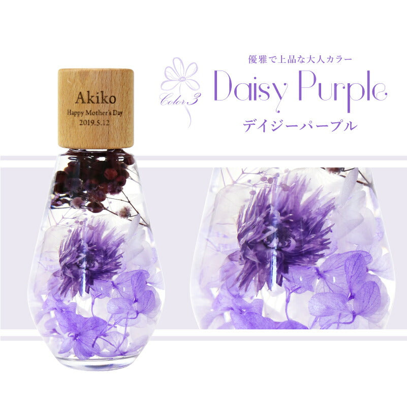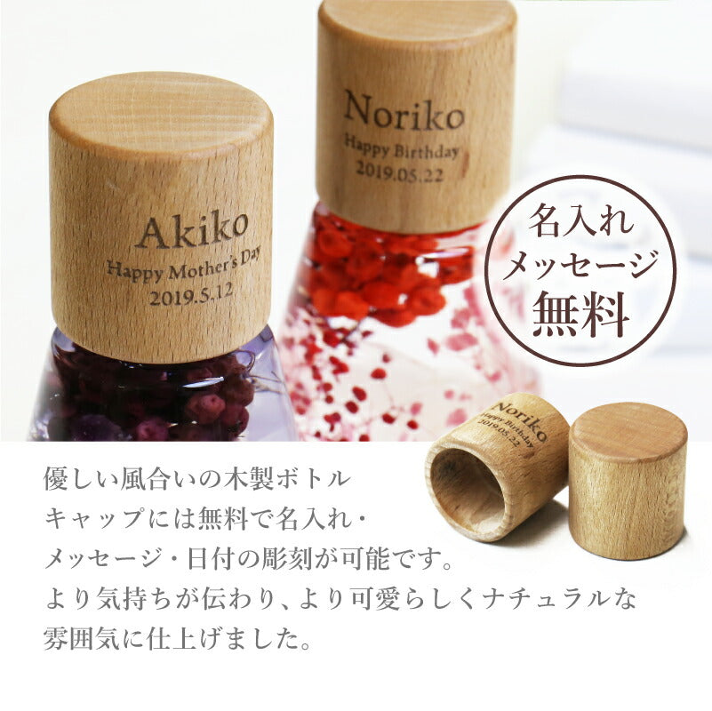 いつもがんばるあの人へ 生活空間の中に癒しを届けるフラワーインテリア。 母の日にはもちろん 多くのお祝いのシーンでプレゼントとして選ばれています。 1.) 癒しの空間を作るインテリア ハーバリウム - ハーバリウムとは? - ハーバリウムとはその名の通り「 植物標本 」。 ドライフラワー や プリザーブドフラワー をガラス瓶に入れて楽しむ フラワーインテリア です。 専用のオイルに浸すことで、独特の透明感と浮遊感が出て、 水の中を舞う幻想的な お花 の姿を楽しむことが出来ます。 お手入れ不要で、一年以上綺麗が持続するお手ごろさも 人気 のポイント。 - 手づくり仕様 - 当店のハーバリウムは、専属デザイナーによる手仕事。 スタッフがひとつひとつ丁寧に 花材 を瓶に詰めて製作しております。 可愛いものが大好きな、すべての女性に喜んでほしい。 そんな想いを込めて作った「 ハーバリウム ドロップ 」。 毎年多くのお客様の元へとお届けしております。 デイジー・かすみそう・あじさい・ペッパーベリーを贅沢に詰め込んだ ドロップ型のハーバリウムです。 デイジーの花言葉は、「純潔」 「平和」 「希望」 見た目だけでなく、素敵な花言葉がたくさん綴られたお花です。 「平和な未来が訪れますように」 こんなご時世の今だからこそ、 そんな希望を込めて、大切な人に贈ってみるのはいかがでしょうか。 〔 選べるカラー4色 〕 相手のイメージやお好きな色に合わせてお選びいただけます。 ・ Pink 女性への贈り物にふさわしい ふんわり優しい定番カラーです。 ・ Green 清涼感のある癒しカラー ナチュラルテイストが好きな方におすすめです。 ・ Purple 優雅で上品な紫色は 大人の女性への贈り物にピッタリ ・ Yellow 元気なビタミンカラーは いつも明るく楽しい気分にしてくれます。 当店のハーバリウムは、 中のお花だけでなく容器にもこだわりました。 - ドロップ型ガラス瓶 - コロンしたフォルムが可愛いしずく型の瓶を使用。 ガラスの丸みによって中のお花が膨張して見えるため、華やかな雰囲気に♪ 置く角度を変えればいろんな表情を楽しむことが出来ます。 高さのないボトルなので省スペースでどこでも置ける。 玄関先、キッチン、リビングなどどんな場所にも彩りを添え、ほっと一息つく空間に。 - 当店オリジナル木製キャップ - ハーバリウムの自然な雰囲気に合わせて、 ガラス瓶 には当店オリジナルの木製キャップをかぶせています。 角を丸くした優しい風合いの木製ボトルキャップは、 家具職人による手作業で作られた作品。 一つ一つ丹精込めて丁寧に仕上げております。 木製のボトルキャップには 無料 で 名入れ とメッセージ、日付が彫刻可能です。 ハ—バリウムの自然な雰囲気に合わせたさりげなく控えめな刻印が、 どんな女性にも喜ばれるデザインとなっております。 〔 メッセージ刻印 〕 メッセージは全6種類 贈るシーンに合わせてお好きなものをお選びいただけます。 ・Happy Mother's Day 母の日 ・Happy Birthday 誕生日おめでとう ・Thank You ありがとう ・Happy Wedding 結婚おめでとう ・Anniversary 記念日 ・Merry Christmas 良いクリスマスを 〔 日付彫刻 〕 メッセージの下部には、お好きな日付を彫刻可能。 貰った日の感動がよみがえる、いつまでも記憶が色褪せない。 思い出のギフトになることでしょう。 花は同じ品種でも、それぞれ色合いやカタチが異なります。 ハーバリウムは、一つ一つ表情が違うオンリーワンのギフトです。 名前入り になることでさらに特別感がUP。 唯一無二のプレゼントに! 「 どうして名前入りが喜ばれるの? 」 自分の名前が入った商品は世界にただ一つだけ。 贈った人に大事に使ってほしい、想いが伝わります。 さらにお名前彫刻はずっと消えずに残るから、永く愛着を持って使っていただけます。 だから、「名入れギフト」は大切な人に感謝の気持ちを伝えるのにぴったりなおくりもの。 私たちは、贈られた人も贈った人もみんなが笑顔になれる商品をお届けします。 ≪ こんなシーンにおすすめ ≫ ・新社会人 学生 への 新生活 入学祝い 入社祝い 卒業祝い に ・クリスマス ホワイトデー に彼女へのプレゼントに ・上司 先輩 後輩の 退職祝い 定年退職 転勤祝い のギフトとして ・敬老の日 に 祖母 への贈り物として ・50代 60代 70代 の 女性 への プレゼント に ・お花が好きな方や小物にもこだわりたい方に |