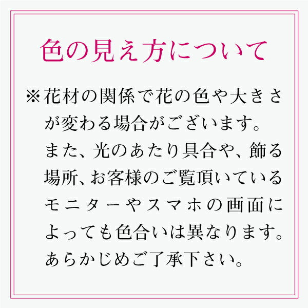 | 備考 | ※花材の関係で花の色や大きさが変わる場合がございます。 ご了承下さい。 ※改良のため、予告なく仕様変更する場合があります |