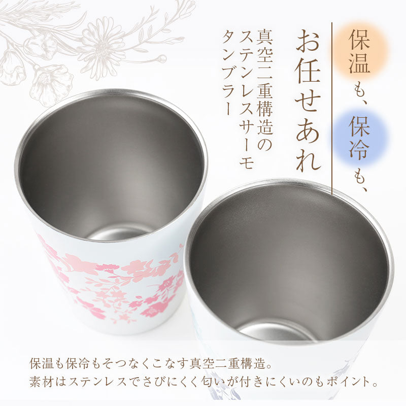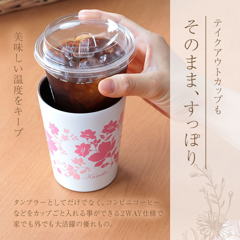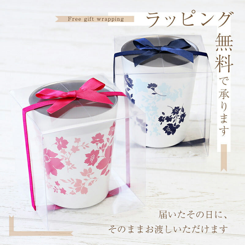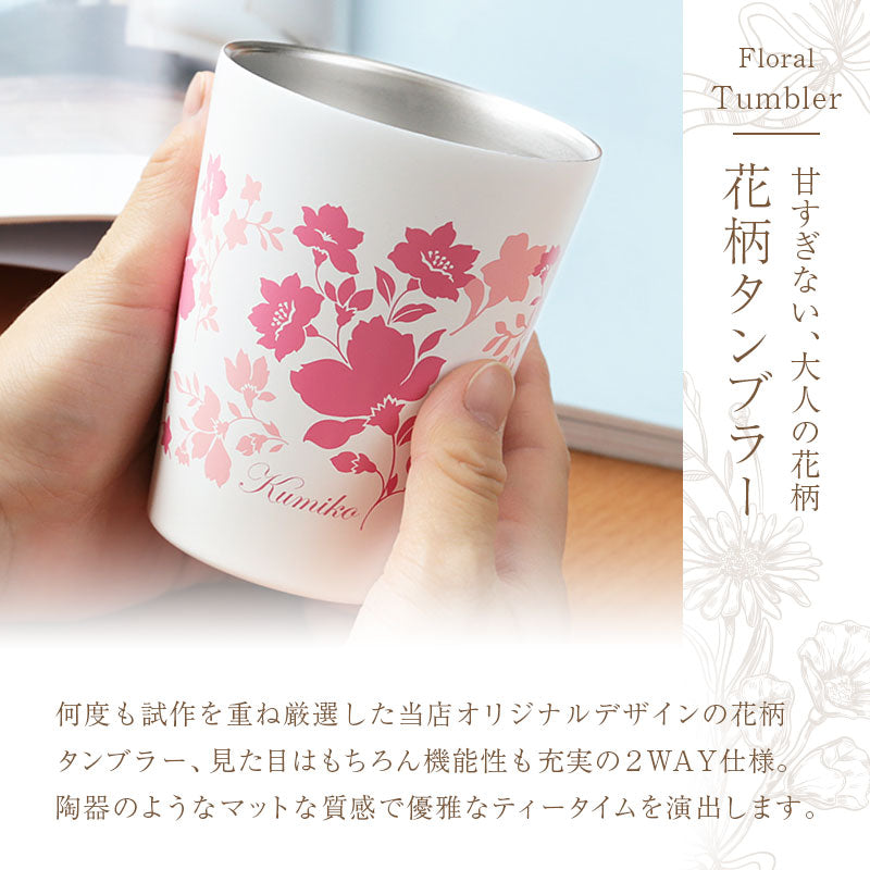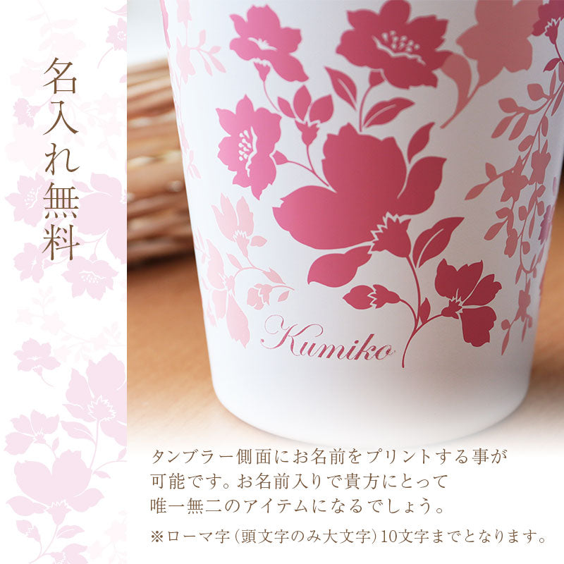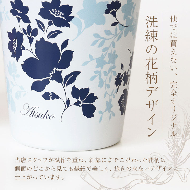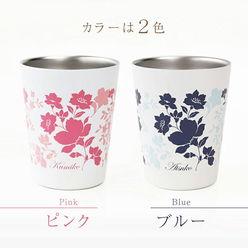 女性スタッフみんなで考え抜いた、 お母さんに贈りたい花柄タンブラー。 1) こだわりの花柄デザイン 保冷・保温効果のあるタンブラーは無地のものがほとんど。 マグカップ は可愛いデザインがあっても重さや機能性に欠ける… お母さんにプレゼントにするなら しっかりとした機能性の、かわいいステンレスタンブラーがいい! そう考えて手掛けたのがこちらのタンブラーです。 本体は艶の無いマットな白色。 まるで陶器のような雰囲気だから、 インテリアに溶け込みます。 - 選べる2色 - 女性スタッフ一同で何度も試作を重ねて厳選した色合い。 飽きのこないこだわりの配色です。 ・ピンク やさしい雰囲気のピンク系カラー。 女性らしい色合いが疲れた心をほぐします。 ・ブルー 洗練された青系カラー。 おしゃれなお母さんにオススメです。 - オリジナル花柄デザイン - お疲れ気味のお母さんにも優雅なティータイムを過ごしていただける様、 エレガントな雰囲気の花柄をあしらいました。 お花好き なお母さんにもきっと喜んでもらえる、 上品なデザインです。 【 無料 お名前入れ プリント 】 デザインに溶け込むような名入れ。 名入れギフト専門店の当店にて、気持ちを込めてお名前をプリントいたします。 「 どうして名前入りが喜ばれるの? 」 自分の名前が入った商品は世界にただ一つだけ。 贈った人に大事に使ってほしい、想いが伝わります。 お名前入りなら、永く愛着を持って使っていただけます。 だから、「名入れギフト」は大切な人に感謝の気持ちを伝えるのにぴったりなおくりもの。 私たちは、贈られた人も贈った人もみんなが笑顔になれる商品をお届けします。 2) 機能性 - 嬉しい2WAY仕様 - そのまま飲み物を注ぎ入れる事が出来るのはもちろん、 テイクアウトカップが入って保温保冷出来る形状。 コンビニコーヒー を カップごと 入れる事が出来る カップホルダー としてもお使いいただけます。 夏は買う機会が増える コンビニ の アイスコーヒー 。 暑い日は特に結露が気になったり、すぐぬるくなってしまいます。 こちらに入れれば結露せずに美味しい温度をキープ。 快適かつ、可愛く持ち運び可能。 そのままだと味気ないプラカップもエレガントに魅せてくれます。 - 保温・保冷 - 保温・保冷効果が持続する ステンレスサーモタンブラー。 〈 試してみました 〉 半袖で過ごしてちょうど良いオフィス内、 氷を入れたお茶は長時間置いていても結露なし! コンビニコーヒーにおいても同様に 飲み切るまでに氷も溶け切ることなく、 最後まで冷たいまま飲めました。 - 素材 - 素材はステンレス(18-8)を使用。 さびにくく匂いが付きにくいのがポイントです。 [ こんなシーンにおすすめ ] ・ おかあさん ママ 母親 母 義母 お義母さん への 日頃の感謝を込めて ・ 30代 40代 50代 60代 70代 母の日プレゼント に ・ オフィス ドライブ で テイクアウトコーヒー を愉しむ方に |