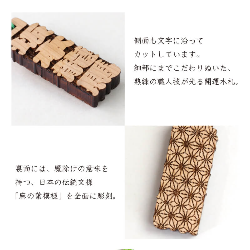 日本の伝統・文化を受け継いだ木札。 縁起物として古くからさまざまな用途に使われました。 あなたにきっとご利益あるかも♪ 大切な人への贈り物にも最適です! 1. 日本の伝統文化 木札の由来 木札は、日本人の暮らしの中で様々な場面に用いられていました。 その中でも、木札が縁起物とよばれるようになった理由には 以下のような由来があります。 一つ目は、江戸火消しの「消し札」。 「火事と喧嘩は江戸の華」と言われるほど江戸時代は火事が多く、 町火消しが火事を防いだ際に、組名が記された札を消し口に掲げていました。 以来、木札は火難、災厄を逃れる縁起物として今に伝わっています。。 二つ目は、神社やお寺でも販売されている「身代わり札」。 名前が刻まれた木札は、その人の分身。 札が割れた際はお札が身代わりとなって守ってくれたという伝承が残っており、 古来よりお守りとして使われていました。 三つ目は、願い事を叶える「納札」。 お寺や神社を参拝する人が、祈願成就のために名前や出身地を書いて納める札のことで、千社札とも呼ばれています。 現在は紙のものが一般的ですが、昔は木札を納めていました。 どれも古くからの日本文化を感じられる由来となっておりますが、 現在ではおしゃれ感覚で身につける人も多く見られます。 キーホルダーやストラップのほか、 名札やボトルキープ用のネームタグなど、様々な用途で使われています。 男女年齢問わず、プレゼントにもおすすめのアイテムです。 2. こだわりの木材 当店で作る木札は全て自社製! 素材にこだわり、職人が一つ一つ丁寧に仕上げました。 温かみのある手触りとやさしい木の香りが、安らぎをもたらします。 また自然木は、時間が経つほどに風合いなどの深みが増していくので、永く愛着を持ってお使いいただけます。 大切な思い出と共に経年変化を楽しめる逸品です。 一位 ?イチイ ? 一位(イチイ)という名前の通り、勉強や商売で「一番」に なれるようにと学業成就や商売繁盛の願いをこめることが多く、 昔から縁起のよい木として親しまれています。 3. 名前彫刻 当店自慢の技術で一つ一つ心を込めてお名前を刻みます。 名入れ専門店である当店の確かな技術力で細部までしっかりと彫刻! 自分の名前が入った木札は世界で一つの特別な逸品。 大切な家族や友人へのプレゼントとして贈れば、 喜ばれること間違いありません。 裏面彫刻- 麻の葉模様 - 裏面には麻の葉模様が入ります。 麻は成長が早く真っすぐ伸びることから、子どもの健やかな成長を願う文様です。 また、邪気を払うなど魔除けの意味も込められており、縁起のよい文様として親しまれてきました。 ≪こんなシーンにおすすめ≫ ・ 友達への 誕生日プレゼント に ・ 神輿 や 縁日 花火大会 に ・ 家族 やチーム・仲間同士でお揃いに ・ 父の日 敬老の日 のプレゼントに ・ 還暦 古希 喜寿 傘寿 米寿 卒寿 白寿 百寿 などの長寿のお祝いに ・ お子様のバッグや通学カバンに着けて名札代わりに ・ 卒業 卒団 卒部 などの 記念品 に ・ 創立記念 周年記念 のプチギフトに |