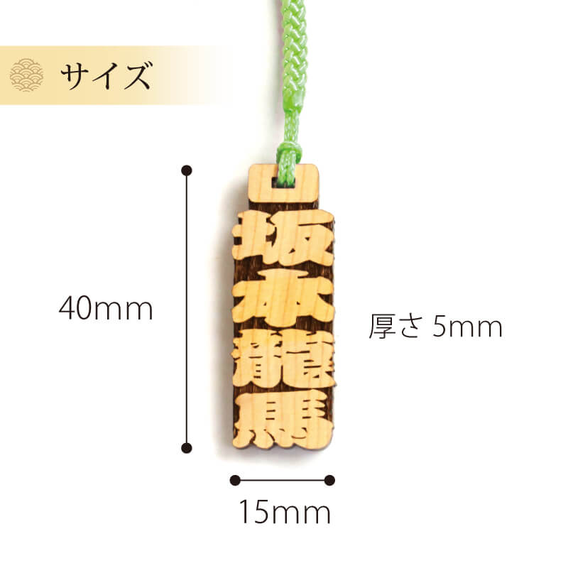 | サイズ | 木札:縦40mm、横15mm、厚さ5mm 根付紐:70mm |