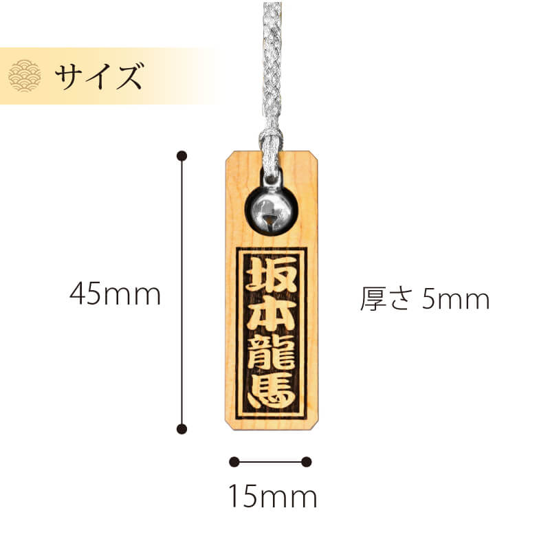 | サイズ | 木札:縦45mm、横15mm、厚さ5mm 根付紐:70mm |