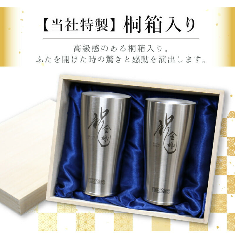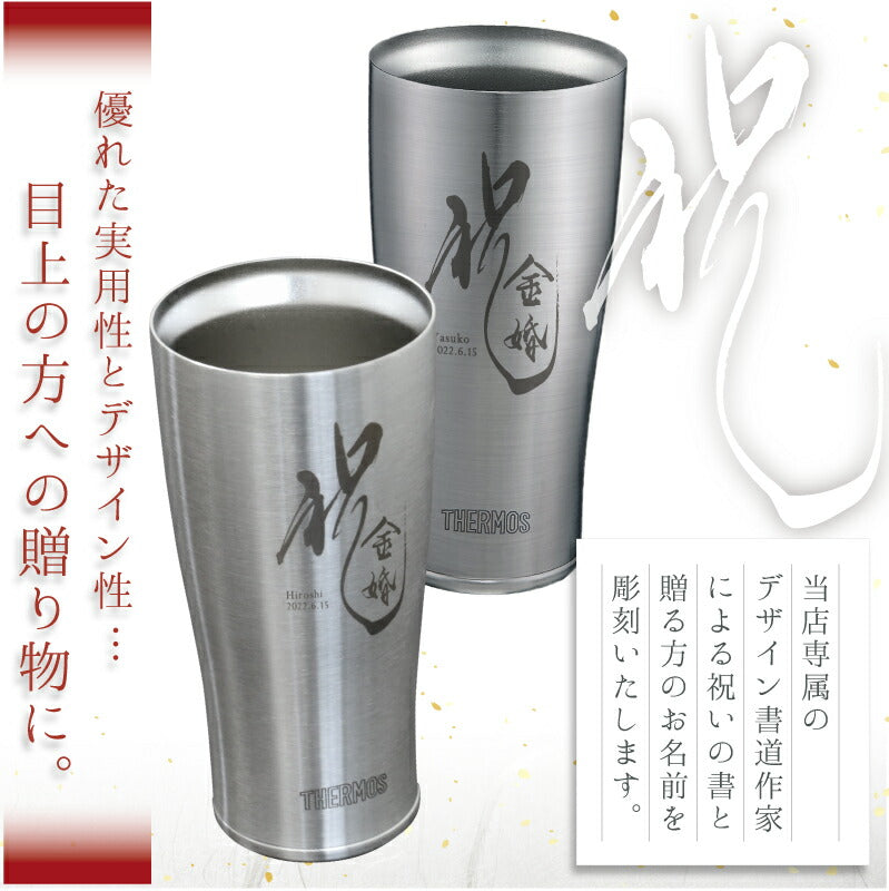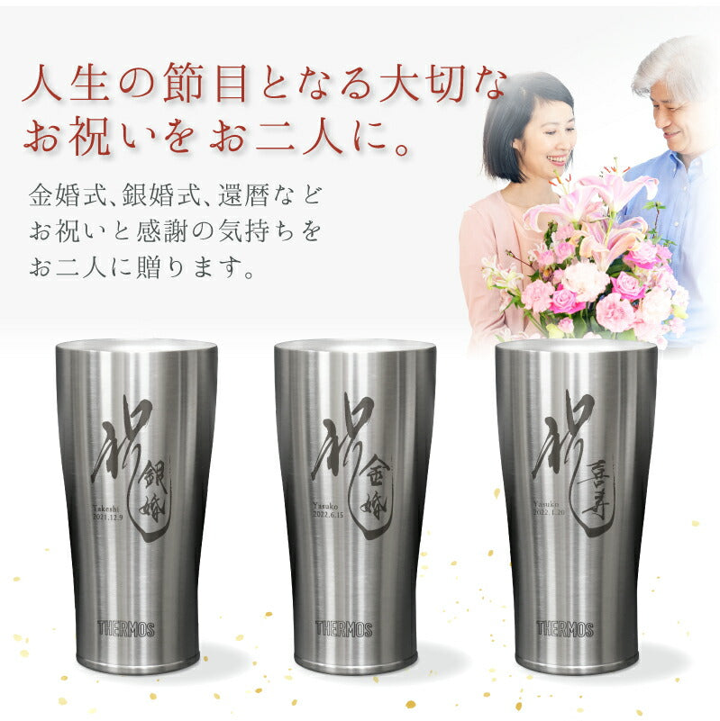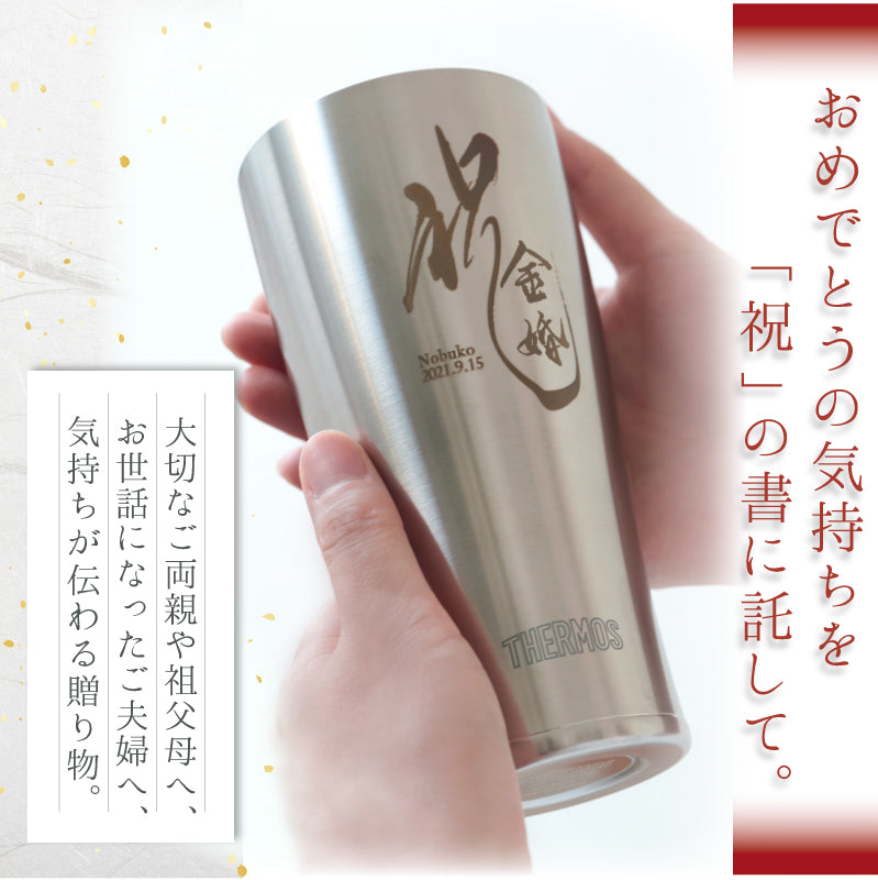 \日本人の心に響く筆文字入りタンブラー / お祝いの言葉と心からの感謝の気持ちを カタチにしてお届けします。 まず、桐箱を手にして一つ目の感動。 箱を開けて、贈り手の想いが込められたメッセージに二つ目の感動。 使う度、優れたのタンブラーの保冷力に三つ目の感動。 いただいた物に「3度」の感動をした経験はございますか? 大切な ご両親 祖父母 お世話になった方 への贈り物として 自信を持ってお勧めいたします。 [1.機能性] 効果は6時間経っても氷が溶けない、ずっと冷たい ・・・なのに結露ゼロの理由は、ステンレス魔法瓶構造にあります。 保温・保温力に優れており、当店スタッフも声をそろえて 「これを使ったら、今まで使っていたグラスには戻れない!」 と言うほど。 軽くて丈夫、落としても割れないタフな ステンレスタンブラー 。 食洗機 も使用可能。 毎日の生活に欠かせない存在になること間違いなしです。 [2.デザイン性] スタイリッシュなフォルムのタンブラーに 「祝」の文字に、メッセージを組み合わせて 消えることのないレーザーで彫刻いたします。 ・ご退職 ・ご勇退 ・ご栄転 ・銀婚 ・金婚 ・還暦 ・古希 ・喜寿 ・傘寿 ・米寿 ・卒寿 ・白寿 さらにお名前と記念の日付も彫刻できるので 世界に一つだけの特別なプレゼントになります。 ブロンズがかった色合いで彫刻された書は主張しすぎず、 ステンレスに馴じみ高級感を醸し出します。 [3.当社 特製 桐箱入り] 桐箱入りのプレゼントを貰ったこと、ありますか? その高級感はどんなラッピングにも勝ります。 当店の職人によりひとつひとつ丁寧に作られた桐箱は、 驚きと共に あなたの思いを大切な人に届けてくれることでしょう。 桐箱入りの商品をご購入のお客様からは、 「桐箱に入っている事で、とても特別感があって喜ばれました。」 「実家に直接発送して貰ったのですが、 桐の箱入りで母もびっくりしていました。」 など、嬉しいお声をいただいております。 大切な記念日だからしっかりしたものを贈りたい。 そんなあなたの理想を叶えます。 【 名入れ彫刻 】 「 どうして名前入りが喜ばれるの? 」 自分の名前が入った商品は世界にただ一つだけ。 贈った人に大事に使ってほしい、想いが伝わります。 さらにお名前彫刻はずっと消えずに残るから、 永く愛着を持って使っていただけます。 だから、「名入れギフト」は大切な人に 感謝の気持ちを伝えるのにぴったりなおくりもの。 私たちは贈った人も受けとった人も嬉しい気持ちになれる みんなが笑顔になるギフトをお届けします。 〔こんなシーンでおすすめ〕 ・ 祖父 祖母 の 長寿 のお祝いに ・ お世話になった 上司 の方への 転職 転勤 退職祝い に ・ ご両親 の 銀婚 金婚 のお祝いに |