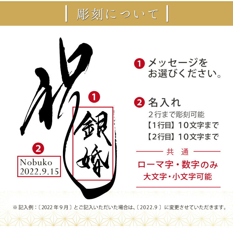 | 名入れ | 彫刻する文字は「入力欄」へご記入下さい。 【お名前】ローマ字※日本語不可 ※大文字小文字可能 2行まで彫刻可能 【1行目】10文字まで 【2行目】10文字まで ・上記以外は当店で変更します ・文字サイズは当店で調整します |