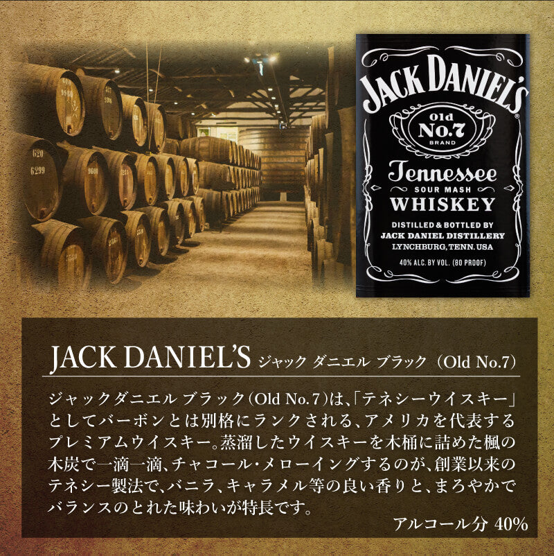 | ジャックダニエル | ■原産国 : アメリカ ■種類 : ウイスキー ■アルコール分 : 40% ■容量 : 700ml |