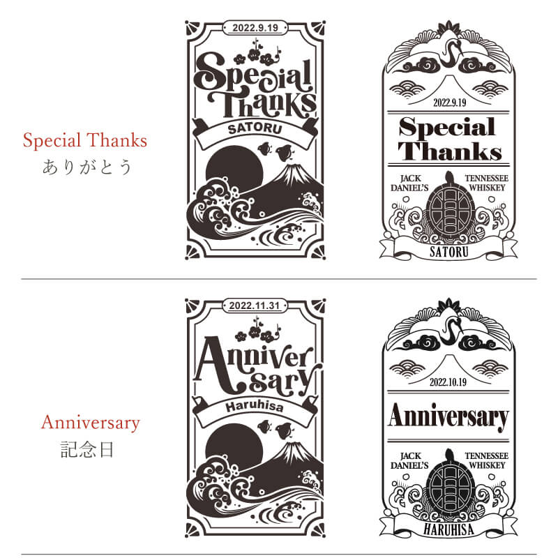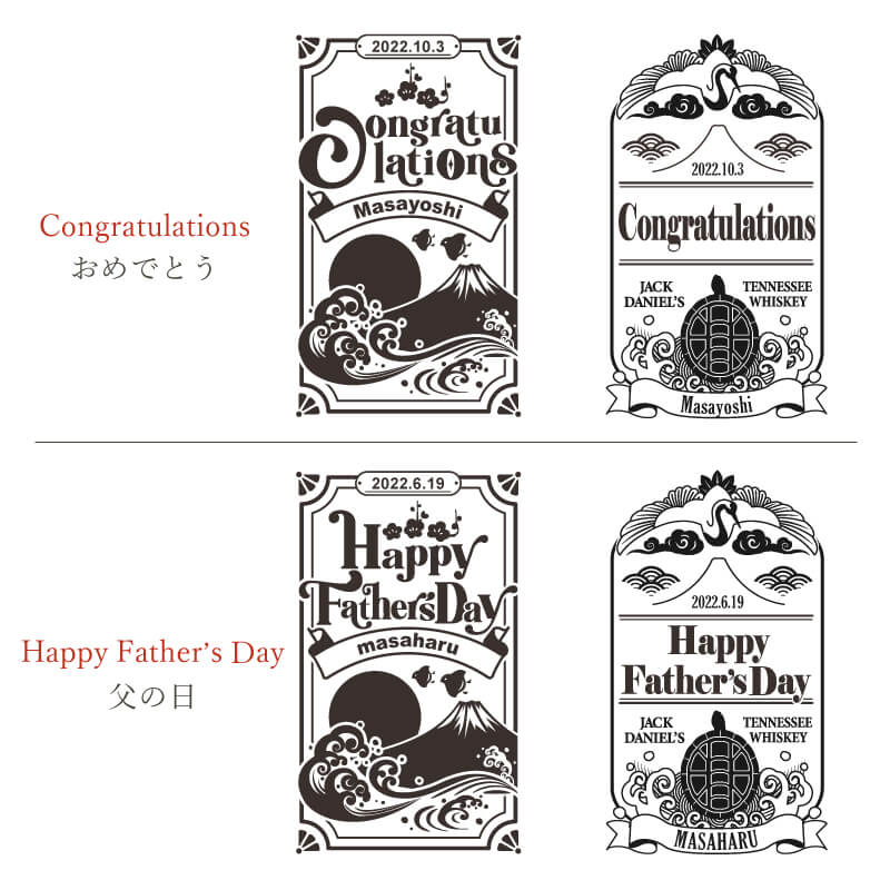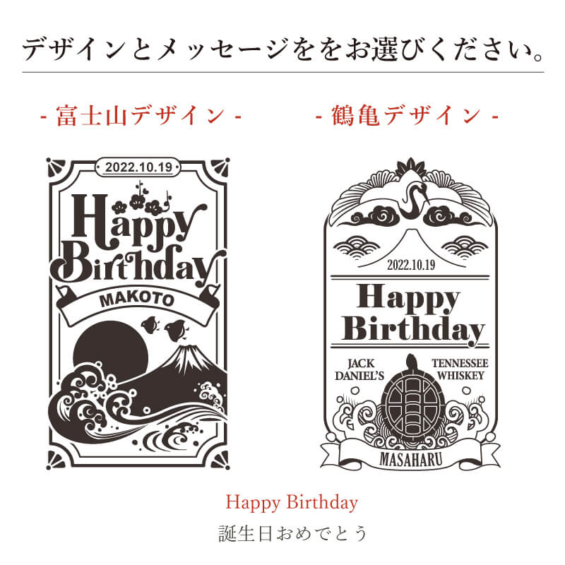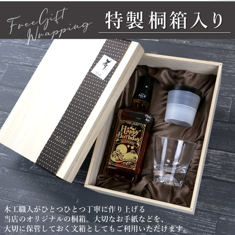 \日本一の山を見ながらオンザロックが飲めるなんて!/ 富士山を見ながら晩酌できたら、素敵だと思いませんか? さらに、グラスの中に入っているのが、自分の名前や記念日が 彫刻してあるボトルから注がれたウイスキーなら… 想像するだけで、にやけてしまいそうですね♪ そんな素敵な体験ができるギフトセット、できましたよ! おすすめポイントを4つにまとめてみましたのでご覧ください♪ 『ジャックダニエル・ブラック』 皆さんご存じ、世界のジャックダニエル。 こだわりにこだわった製法から、バーボンとは別格に ランク付けされています! バニラやキャラメルの芳醇な香りと、 熟成によるスパイシーな風味が調和し、 バランスの取れた味わいであると、 世界中に多くのファンを持つ名ウイスキー。 知れば知るほどお勧めしたくなる、そんなウイスキーを ギフトのメインに選びました! 内容量も700mlありますので、たっぷり楽しむことができますよ♪ さらに、世界中で有名なあの四角いボトルには、 当店の専属デザイナーが考えたオリジナル和柄デザインを、 輝く 金色 で 彫刻 しています! 選べるデザインは全部で2種類♪ ・富士山デザイン まさに日本一!ロックグラスとデザインをそろえるのもおしゃれですね。 常に上を目指し続けるあの人には、富士山ラベルがおすすめ♪ ・鶴亀デザイン 長寿の象徴!富士山グラスと合わせれば、おめでたい感MAXです♪ いつまでも元気に長生きしてほしい、そんなあの人には鶴亀デザインがおすすめ! さらに、デザインの中心に同じ 金の彫刻 でメッセージ入り♪ 下記の5種類から選べます。 ・Happy Birthday(誕生日おめでとう) ・Special Thanks (心からの感謝を) ・Anniversary(記念日) ・Congratulations(おめでとう) ・Happy Father‘s Day(幸せな父の日を) 贈るお相手やシチュエーションに合わせて選んでください♪ 2、ゴールドラベルのデザインに溶け込む名入れ 手に持ったボトルをうっとりと眺めていると… デザインの中に溶け込むように、 自分の名前が彫刻されているのに気が付きます。 さらに、上部に入っている日付も、 自分の誕生日や記念日だとわかったら… こんなにうれしいことはないですよね! まさにオンリーワン。 このボトルに刻まれた特別な思い出は、 何年たっても色褪せないですよ。 「 どうして名前入りが喜ばれるの? 」 生まれた時からずっと一緒に生きてきた「名前」。 普段あまりにも身近にあるので、自分の名前のことを 深く考える機会はありませんが 贈られた商品に自分の名前が刻まれていたらいかがでしょう。 その瞬間、“プレゼント”は“自分だけの大切なもの”へと変化します。 そして贈ってくれた方の真心を感じ、自然に笑顔がこぼれるのではないでしょうか。 名前はその人にとって唯一無二、かけがえのないものです。 私たちはそのお名前を大切に、贈る人、贈られる人、 両方の笑顔を想いながら商品を送り出しています。 当店のお名前彫刻は専門のスタッフがこだわりと 自信をもって行っていますので、 1文字1文字つぶれることなく鮮明に刻印され、 ずっと消えずに残ります。 お客様の気持ちのこもったギフトを 永く愛着を持ってお使いいただけますように。 それが、私たち名入れギフトOkuluスタッフ全員の願いです。 3、360°すべてが美しいロックグラス 美味しいウイスキーをさらにおいしくいただくための、 とっておきのロックグラスを相方に選びました! おみやげグランプリ 2015 グランプリ及び観光庁長官賞受賞商品、 その名も「富士山ロックグラス」。 名前の通り、グラスの底には 江戸硝子職人が手吹きで入れた雄大な富士山がそびえ立っています! 職人が1つ1つ手作りで完成させる世界に1つの富士山は、 注いだ飲み物の色が山肌に反射し、きらきらと美しく輝きます。 富士山のようにずっしりとした重厚感を感じるグラスですが、 口に当たる部分は驚くほど薄くなっています。 飲み物をよりおいしく感じることのできる繊細さも、手作りならではですよね♪ また、当店で扱う富士山ロックグラスは【正規品】です! 田島硝子 株式会社様より直接仕入れておりますので、ご安心ください。 4、細部にまでこだわったギフトセット ゴールドラベルのボトル、富士山ロックグラスときたら、 やっぱり飲み方もこだわりたいですよね。 そんな時に思い浮かぶ飲み方、それはオンザロック! まんまる氷を鳴らしながら飲む、これぞウイスキーという飲み方です。 今回は、お家で特別な時間を過ごしていただくための ギフトセットですので、一般のご家庭では作ることが難しい あの 丸氷 が作れる アイスボールメーカー も入っています♪ 届いたその日に、富士山見ながらオンザロックが楽しめますよ! さらに!このギフトセットが入っている箱。 普通の箱ではございません。 当店の職人が丁寧に仕上げた「桐箱」です。 家具職人を有する当店が、このギフトセットを選んでくださった 皆さんにできることは何か? その問いから始まったこの桐箱制作