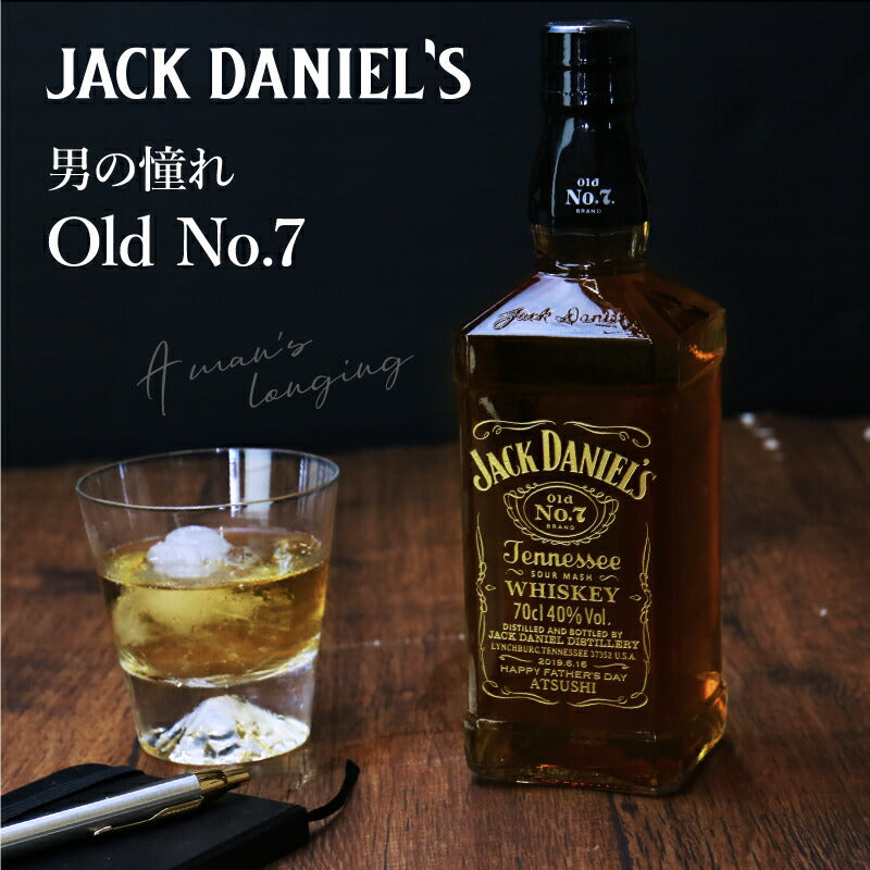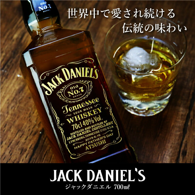 『ジャック ダニエル ブラック(Old No.7) 』 「テネシーウイスキー」としてバーボンとは別格にランクされる、アメリカを代表するプレミアムウイスキーです。蒸溜したウイスキーを木桶に詰めた楓の木炭で、一滴、一滴チャコール・メローイングするのが、創業以来のテネシー製法。バニラ、キャラメル等の良い香りとまろやかでバランスのとれた味わいが特長です。 当店でしか手に入らない、お洒落で華やかなオリジナルデザイン。 ジャックダニエルブラックに、日付・メッセージ・名前を無料で彫刻致します。ゴールドの輝きは高級感と特別感を演出!! ウイスキーをこよなく愛し、尚且つジャックダニエルが好きな男性へのプレゼントに最適です。大切な方へのプレゼントに是非! 誕生日にはもちろん、バレンタイン、父の日などのイベントにもおすすめ! ■商品名 : ジャックダニエル ■原産国 : アメリカ ■種類 : ウイスキー ■アルコール分 : 40% |