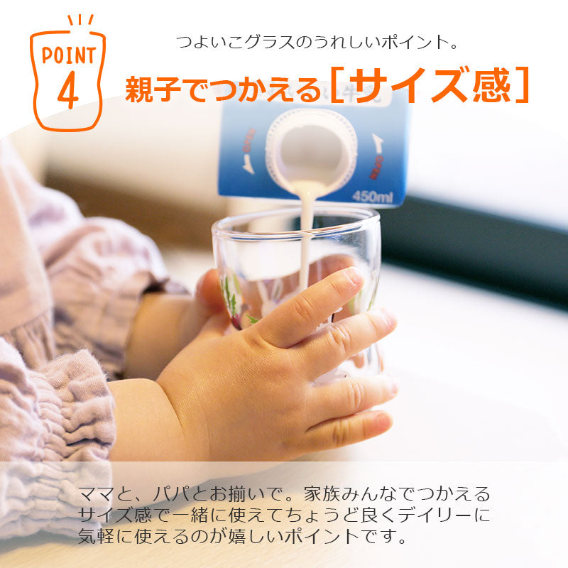 はじめての本物グラスで心を豊かに。 食育へとつながる、丈夫で永く使えるこどもグラス。 1) こどもが“大切に使う”を学べるグラス グラスデビューにぴったりなガラス製コップ。 つい使わせるのをためらう硝子製品ですが、 豊かな心を育てるためには小さい頃から触れる事が大切です。 どうして「ほんもの」がいいの? 大人は、割れ物は自然と丁寧に扱いますよね。 そんな大人の姿もこどもはよく見ています。 目で見て、直に触れて心で感じる事で大切に扱う精神を養います。 安定した強度とサイズ感の「 こどもグラス 」なら、 ひやひやとすること無く、触れさせる事が出来ます。 だから、“大切に使う”を学べるグラスなんです。 グラスのくびれが小さな手にもぴったりフィット。 2歳になったばかりのスタッフMさんのお子さんが使用し、 3時間程の撮影で何度も手に持つ場面がありました。 そんな中、Sサイズ・Mサイズともに一度も落としませんでした。 「自分で注ぎたい!」と片手でグラスを持って注いでも、難なく成功。 プラスチック製より重みがあって、安定感があることも理由の様です。 こどもがストレスなく使えてママも子供もうれしいグラスです。 口を付ける部分に強化加工がされており、 通常のグラスに比べて割れや欠けに強い仕様。 テーブルに勢いよくぶつけたり、 注ぐ時に倒してしまったり… まだ力加減を知らない子供にはありがちな場面でも、 少しゆったりとした気持ちで見ていられるタフなグラスです。 ある頃から必ず始まる大人と一緒じゃなきゃイヤ!の時期。 「 こどもグラス 」は、そんなこどもの気持ちに寄り添った仕様。 一緒に囲む食卓、パパやママと一緒のグラスでカチンと乾杯! ちびっこ達も大人といっしょで大満足。 さらに「いっしょ」で実現する食育。 器によって味わいは違って感じますよね。 それは感性豊かな子どものうちから少しずつ感覚を養っていくもの。 成長と共に豊かな心を育める。 つよいこぐらす は大人と「いっしょ」が嬉しいグラスです。 なが〜く使える丈夫さはもちろん、 毎日の生活に取り入れやすいサイズ感も魅力。 大きなコップのように注ぎすぎることが無く、 無駄もありません。 軽いデザートにもぴったり。 大人でも重宝する便利な大きさです。 お子様とのおやつの時間も、一緒の容器なら楽しさもプラス! 親子の大切なコミュニケーションに役立ちます。 内側と外側で見え方が違う面白いデザイン。 動物が雲や草の後ろにかくれんぼ。 最後まで飲んだらコップの底にも動物が! 遊びに夢中で水分補給を嫌がる時も、 「もう少し飲んだら動物が出てくるよ〜」と 声を掛けてあげたら、ゴクゴク飲みたくなっちゃう♪ イヤイヤ期でお悩みの お母さん お父さん も嬉しいグラスです。 このグラスに出会うまではメラミン素材のコップを使っていたMさん。 茶渋の付きやすさに悩みでした。 さらに、頻繁に漂白する事でコップの塗装が剥がれ、代わりのコップを探していたとのこと。 そんな悩みも つよいこグラス がスッキリ解消。 「茶渋は付かないし、丈夫で割れずに永く使えています。 子供たちが率先して飲み物を注いで飲んだり、親としてはありがたいグラスです! これからもずっと大切に使っていきます。」 さらに、Mさんのお友だちは一度で大人2人、子供2人分を購入。 毎朝家族4人でヨーグルトを食べるカップとして、同じく5年以上使用しています。 赤ちゃん から大人まで使えるグラス。だから家族で永く使えて、みんなの大切な思い出に! お名前を当店自慢の技術で彫刻いたします。 ずっと消えない彫刻だから安心感があります。 名前入り は、子供が“自分の物”の特別感をより感じられます。 だから、名入れギフトで物を大切にする気持ちを育む事が出来ます。 「 どうして名前入りが喜ばれるの? 」 自分の名前が入った商品は世界にただ一つだけ。 贈った人に大事に使ってほしい、想いが伝わります。 さらにお名前彫刻はずっと消えずに残るから、永く愛着を持って使っていただけます。 だから、「名入れギフト」は大切な人に感謝の気持ちを伝えるのにぴったりなおくりもの。 私たちは、贈られた人も贈った人もみんなが笑顔になれる商品をお届けします。 |