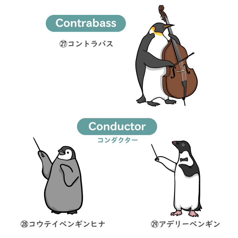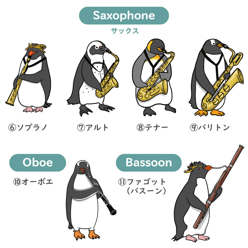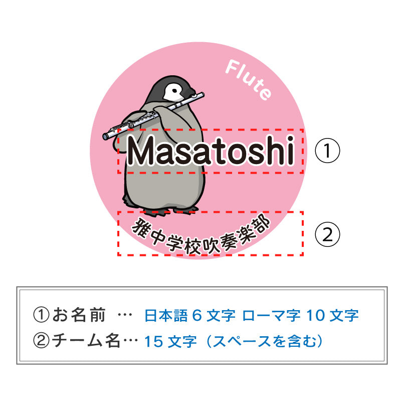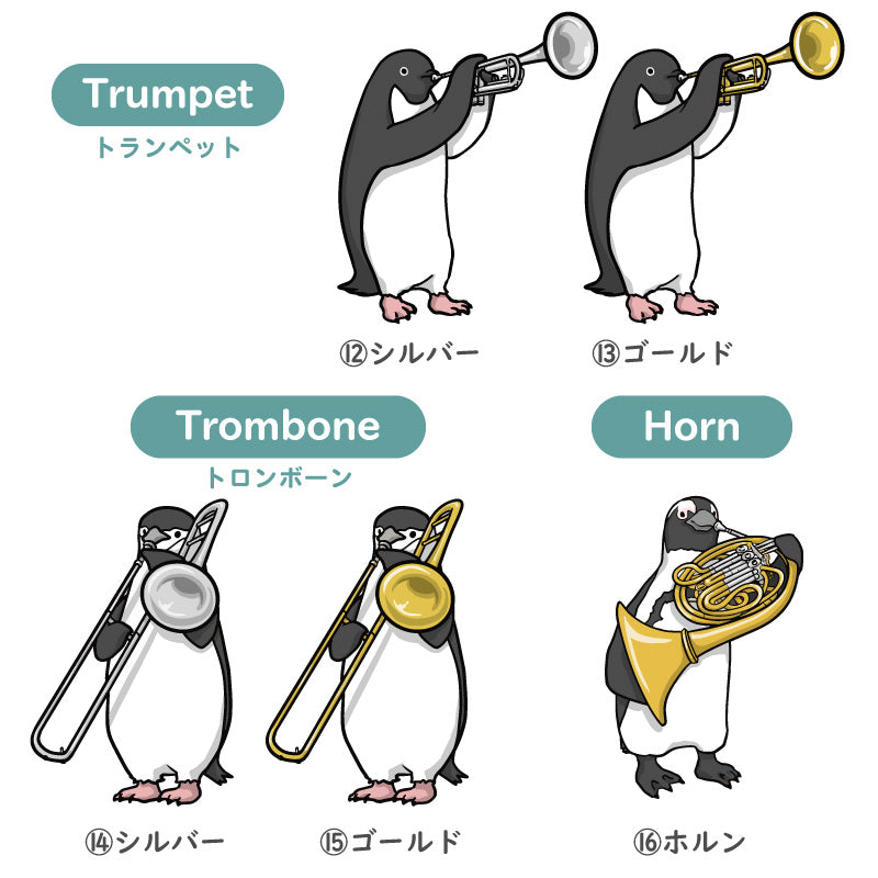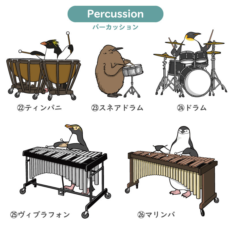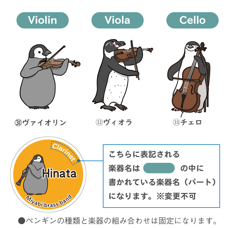 いろんな種類の個性豊かなペンギンたちが奏でるハーモニー。 ペンギンのイラストは当店専属デザイナーの描き下ろし。 1) 大人気アニマル ペンギンモチーフのキーホルダー 愛くるしい見た目と姿で 大人 も 子供 も大好きなペンギン。 アニマルモチーフとしても大人気で 動物園や水族館に行けば、 様々なペンギングッズに出会えます。 そんなペンギンたちをモデルに、 当店からオリジナルデザイングッズが誕生! さまざまな楽器を演奏している姿を アクリルキーホルダーにしました。 楽器×ペンギンの 癒し度バツグンなコラボレーション。 ペンギンやペンギングッズが好きな方はもちろん、 吹奏楽部 の 学生 さん・かつて青春したOBの方、 今現在 打楽器 を演奏している 楽団 員さん、 音楽教室で習っている生徒さんなど 音楽に携わったことのある方たちにもおすすめしたいアイテムです。 2) 当店オリジナルデザイン 当店専属イラストレーターによる 完全オリジナルデザイン。 ペンギンたちが楽器を演奏する かわいらしい姿をイラストにしました。 【 楽器: 全8パート32種類! 】 元吹奏楽部のイラストレーターのこだわり! トランペット・トロンボーン・ユーフォニアムは2色、 木管楽器もバリエーション豊富にご用意しました。 愛着のある楽器になるべく近いものを…と チューバはピストン式とロータリー式とこまかく描き分けました。 吹奏楽の楽器ではありませんが、 習い事でもお使いいただけるよう、 コントラバスの仲間の楽器も! 楽団みんなでお揃いで持てるよう、 指揮者も二種類ご用意しました。 《 フルート 》 ピッコロ フルート 《 クラリネット 》 B♭クラリネット E♭クラリネット バスクラリネット 《 サックス 》 ソプラノ アルト テナー バリトン 《 オーボエ 》 《 ファゴット 》 《 トランペット 》 ゴールド シルバー 《 トロンボーン 》 ゴールド シルバー 《 ホルン 》 《 アルトホルン 》 《 ユーフォニアム 》 ゴールド シルバー 《 チューバ 》 ピストン式・ロータリー式 《 パーカッション 》 ティンパニ スネアドラム ドラム ヴィブラフォン マリンバ 《 コントラバス 》 《 コンダクター 》 コウテイペンギンヒナ アデリーペンギン 《 ヴァイオリン 》 《 ヴィオラ 》 《 チェロ 》 【 ペンギン奏者のご紹介 】 ・ コウテイペンギンヒナ ・ コウテイペンギンヒナ ・ ジェンツーペンギン ・ ヒゲペンギン ・ キングペンギン ・ キングペンギンヒナ ・ コガタペンギン ・ キンメペンギン ・ イワトビペンギン ・ フンボルトペンギン ・ ケープペンギン ・ マカロニペンギン 【選べるカラー】 キーホルダーのベースカラーは全4色。 男性 女性 年齢 選ばずお使いいただける カラーを取りそろえました。 お好きな色をお選びください。 ・ ピンク ・ パープル ・ オレンジ ・ ライトブルー 3) お名前プリント キーホルダーの中心には 名入れ プリントをいたします。 さらに下部には学校名・楽団名のプリントも可能。 自分の 名前入り キーホルダーは 世界でたった一つだけ! 特別感たっぷりの オリジナルグッズ だから、 愛着を持って永くお使いいただけます。 だから、大切な人へのプレゼントにもピッタリ♪ 卒団 卒部 卒業祝い の 記念品のほか、 ペンギン好き への 誕生日プレゼント プチギフト など、贈るシーンはさまざま。 部員 同士おそろいで付けて、団結力を高めるのも◎ コンクール前に 応援グッズ として身に付ければ、心強いお守りに! ネームタグ にもなるので、楽器バッグに 付けておけば、自分のバッグが一目瞭然! 旅行バッグ や リュック に付けるのもおすすめです。 |