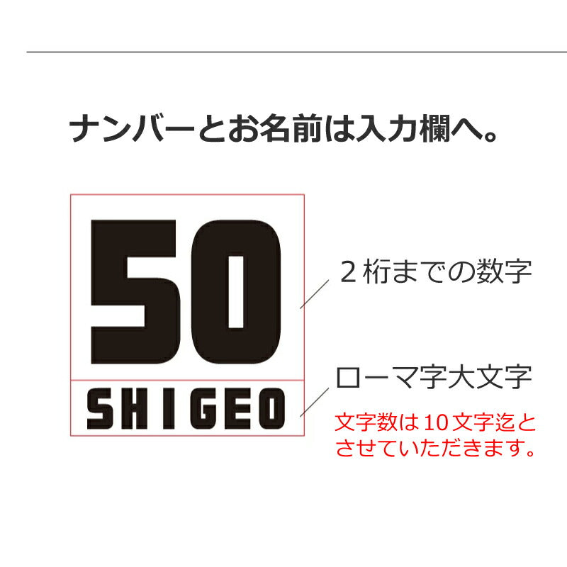 | 名入れ | プリントする文字は「入力欄」へご記入下さい。 【お名前】ローマ字のみ ※日本語不可 【数字】数字のみ 文字数は【お名前】10文字まで【数字】2桁までとさせていただきます。 ・上記以外は当店で変更します ・文字サイズは当店で調整します |