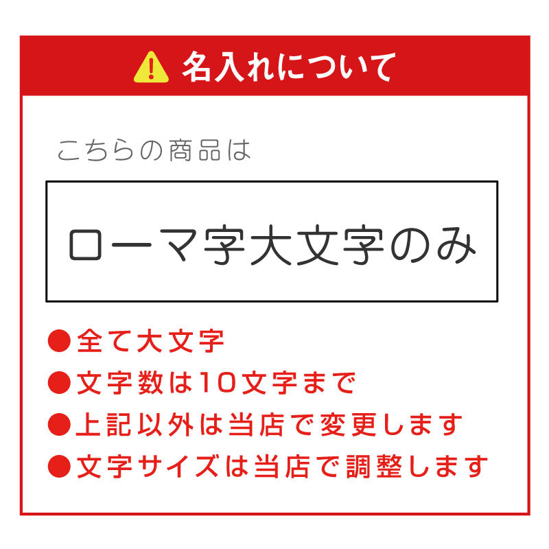 | 名入れ | プリントする文字は「入力欄」へご記入下さい。 【お名前】ローマ字のみ ※日本語不可 文字数は10文字までとさせていただきます。 ・上記以外は当店で変更します ・文字サイズは当店で調整します |