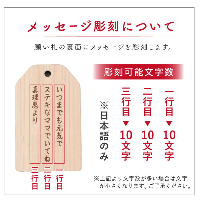 願い札の裏面にメッセージを彫刻します。 彫刻する文字は「入力欄」へご記入下さい。 【お名前】日本語のみ ※ローマ字不可 文字数は1行10文字までとさせていただきます。 ・上記以外は当店で変更します ・文字サイズは当店で調整します |