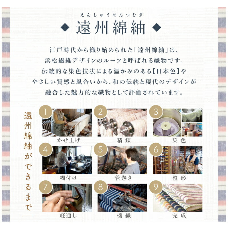 ※1つ1つ職人の手づくりの為、サイズや形状に個体差がございます。 ※使用している遠州綿紬の性質上、色柄が画像と多少異なる場合がございます。 ※節(ネップ)は、遠州綿紬の特徴であり、難ではございません。 ※改良のため、予告なく仕様変更する場合があります |
