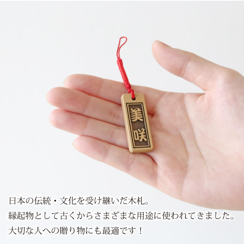 日本の伝統・文化を受け継いだ木札。 縁起物として古くからさまざまな用途に使われました。 あなたにきっとご利益あるかも♪ 大切な人への贈り物にも最適です! 1. 日本の伝統文化 木札の由来 木札は、日本人の暮らしの中で様々な場面に用いられていました。 その中でも、木札が縁起物とよばれるようになった理由には 以下のような由来があります。 一つ目は、江戸火消しの「消し札」。 「火事と喧嘩は江戸の華」と言われるほど江戸時代は火事が多く、 町火消しが火事を防いだ際に、組名が記された札を消し口に掲げていました。 以来、木札は火難、災厄を逃れる縁起物として今に伝わっています。。 二つ目は、神社やお寺でも販売されている「身代わり札」。 名前が刻まれた木札は、その人の分身。 札が割れた際はお札が身代わりとなって守ってくれたという伝承が残っており、 古来よりお守りとして使われていました。 三つ目は、願い事を叶える「納札」。 お寺や神社を参拝する人が、祈願成就のために名前や出身地を書いて納める札のことで、千社札とも呼ばれています。 現在は紙のものが一般的ですが、昔は木札を納めていました。 どれも古くからの日本文化を感じられる由来となっておりますが、 現在ではおしゃれ感覚で身につける人も多く見られます。 キーホルダーやストラップのほか、 名札やボトルキープ用のネームタグなど、様々な用途で使われています。 男女年齢問わず、プレゼントにもおすすめのアイテムです。 2. こだわりの木材 当店で作る木札は全て自社製! 素材にこだわり、職人が一つ一つ丁寧に仕上げました。 温かみのある手触りとやさしい木の香りが、安らぎをもたらします。 また自然木は、時間が経つほどに風合いなどの深みが増していくので、永く愛着を持ってお使いいただけます。 大切な思い出と共に経年変化を楽しめる逸品です。 柘植 ?ツゲ ? 柘植(つげ)は強度があり、非常に堅い木。細工物の材料に 適しており、将棋の駒や印鑑などにも使われています。 本桜や檜に比べて黄色みが強く、上品で落ち着いた雰囲気を 纏っているので、同じ木札でも、モダンなイメージの木札になります。 3. 名前彫刻 当店自慢の技術で一つ一つ心を込めてお名前を刻みます。 名入れ専門店である当店の確かな技術力で細部までしっかりと彫刻! 自分の名前が入った木札は世界で一つの特別な逸品。 大切な家族や友人へのプレゼントとして贈れば、 喜ばれること間違いありません。 裏面彫刻は10種類の模様からお選びいただけます。 いずれも縁起がいいとされる日本の伝統模様。 和柄には健康や長寿、学業や商業の成功など様々な願いや祈りが込められています。 贈る相手のことを想い、ぴったりな模様をお選びください。 ≪全10種類日本の伝統紋様≫ ・ 麻の葉 - 魔除け・子供の健やかな成長 - ・ 観世水 - 健康祈願・心願成就 - ・ 青海波 - 平和な暮らし・永く続く幸せ - ・ 荒波青海波 - 平和な暮らし・永く続く幸せ - ・ さくら - 繁栄・豊かさ - ・ 亀甲花菱 - 長寿 - ・ かごめ - 魔除け・邪気を祓う - ・ 紗綾 - 不断長久・吉祥 - ・ 水紋 - 苦難や災難を流す - ・ 毘沙門亀甲 - 長寿 - ≪こんなシーンにおすすめ≫ ・ 友達への 誕生日プレゼント に ・ 神輿 や 縁日 花火大会 に ・ 家族 やチーム・仲間同士でお揃いに ・ 父の日 敬老の日 のプレゼントに ・ 還暦 古希 喜寿 傘寿 米寿 卒寿 白寿 百寿 などの長寿のお祝いに ・ お子様のバッグや通学カバンに着けて名札代わりに ・ 卒業 卒団 卒部 などの 記念品 に ・ 創立記念 周年記念 のプチギフトに |