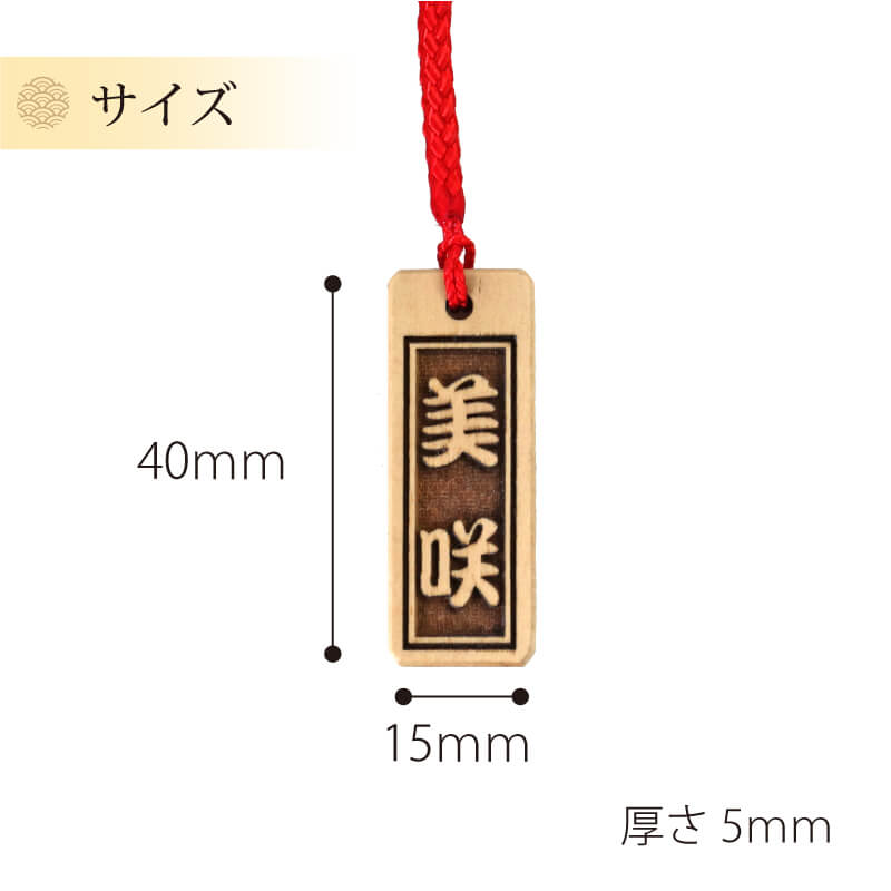 | サイズ | 木札:縦60mm x 横25mm x 厚み6mm 根付紐:70mm |